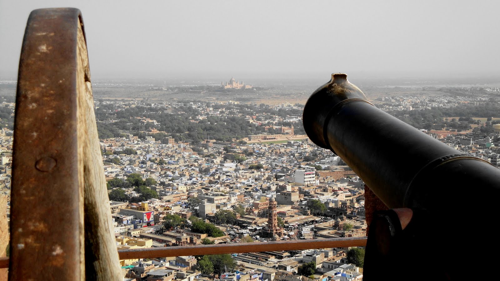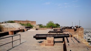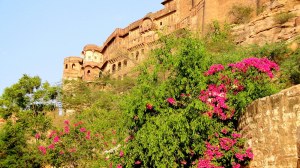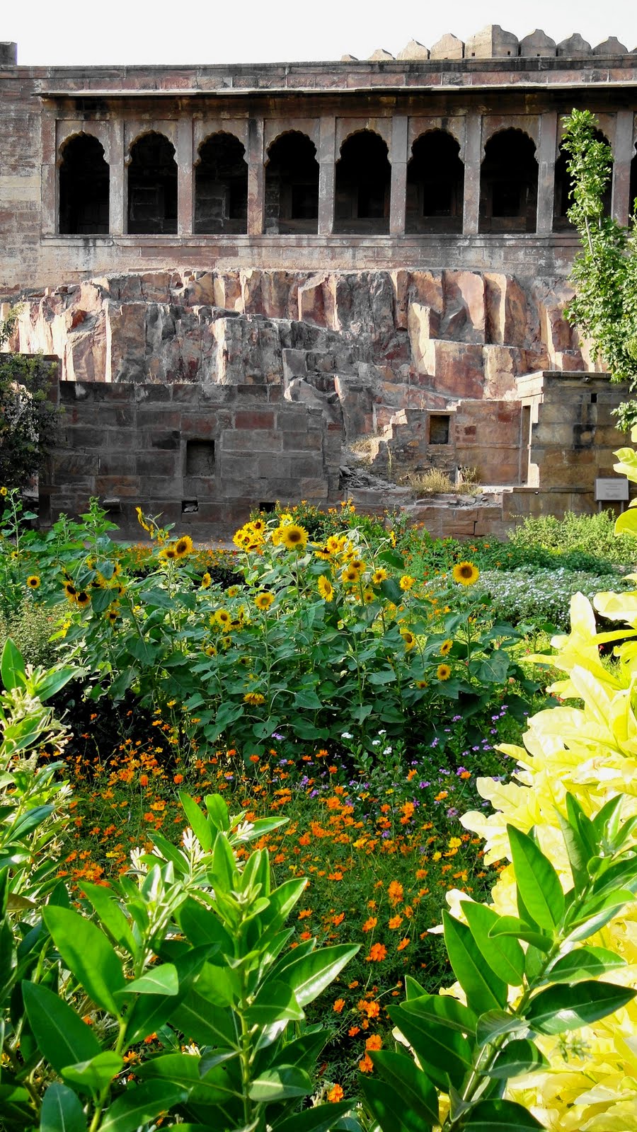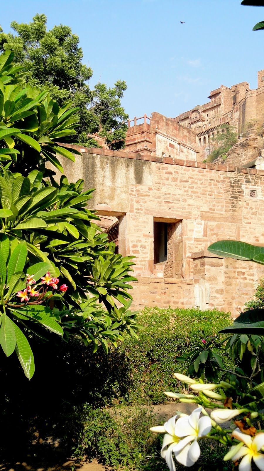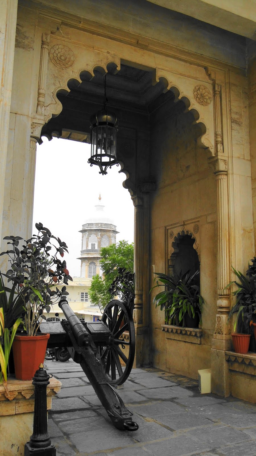 …that’s the above-mentioned, offending but opulently gorgeous Umaid Bhavan Palace; and yeah, the aim of the cannon below rather represents my feelings about such spending, beautfiul as it is, when I know there were folks starving and dying needlessly of disease. Further down (and some above as well, flora and fauna – the hanuman langur, a black-faced and playful primate whose relatives I first met in bouncing around on the roof of my hotel in Sri Lanka years ago – of the gardens & pleasure palace, a delightful oasis down below Mehrengarh, from which many of the looking-up-with-flowers-in-the-frame pictures were shot.