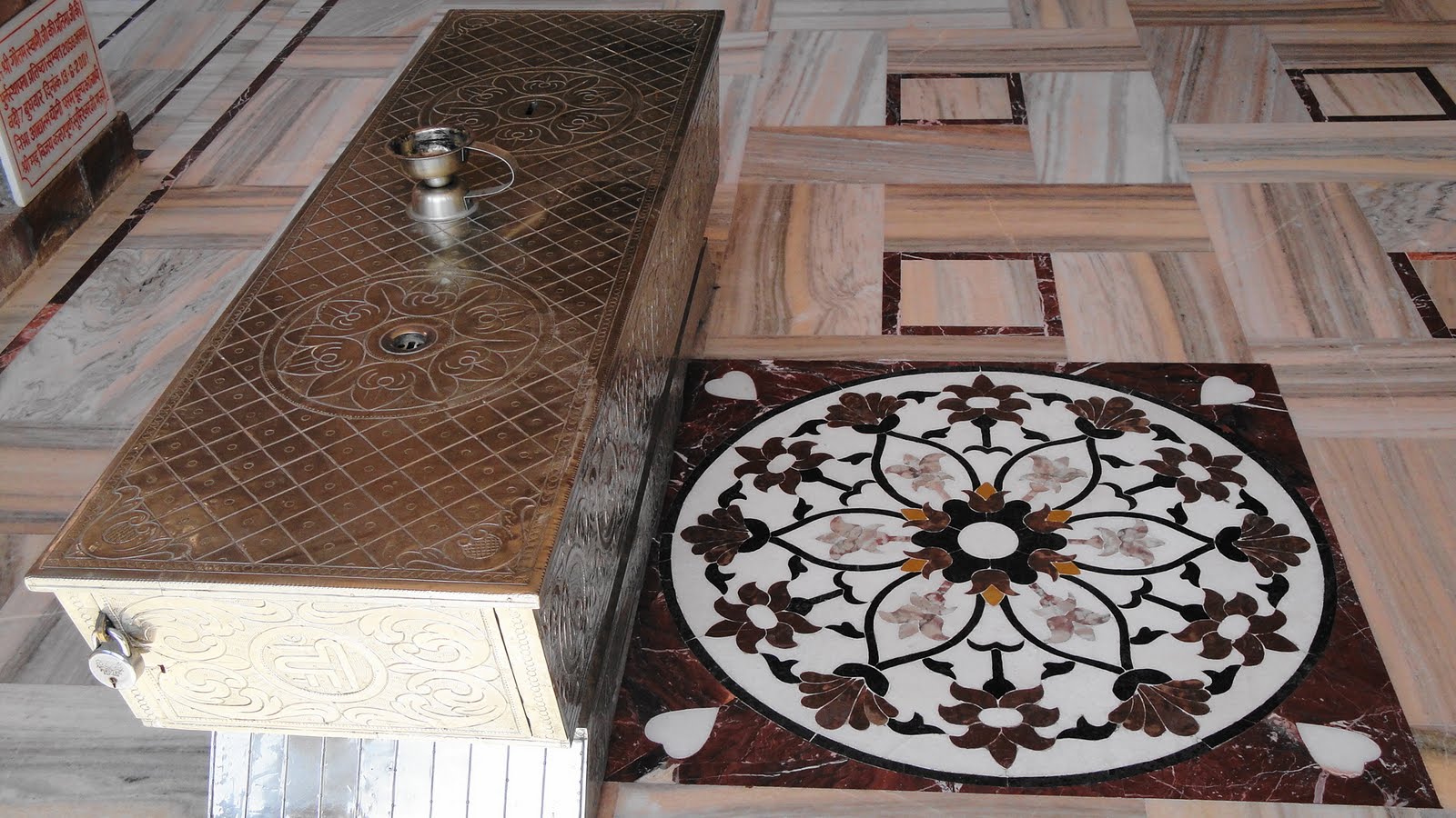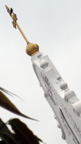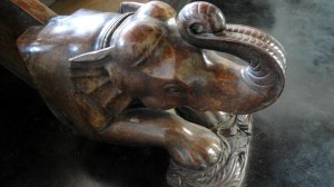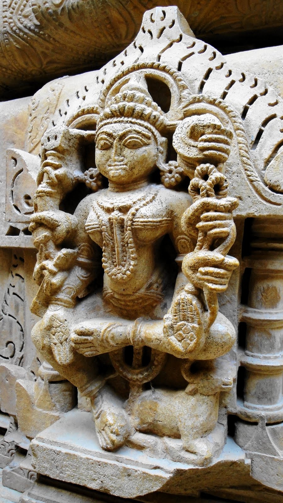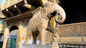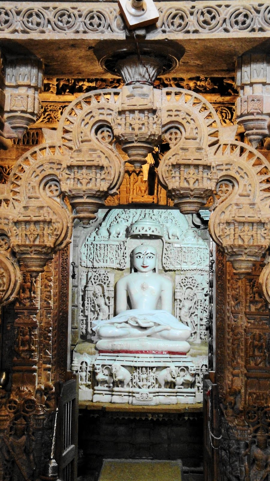 …above: camel at rest in a random courtyard up in the fort at Jaisalmer; below: waterspout in fantastic shape within Jain temple; further below: the white statue is one of the 24 Jain prophets, about whom you can read more in the Osian section down below.