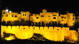 Kumbalh Garh (fort at Kumbalh is what it means) sits high up above rows of ramparts in the hills north of Udaipur. It’s not one of the top forts of Rajasthan, but it’s certainly quite impressive. There’s a story in why we saw it: as we departed Jodhpur for Udaipur in the morning, Gene mentioned to our driver the temples Rankapur, which we were to see that day according to the schedule. He hadn’t checked the schedule, our driver, so was unaware of Ranakpar and what are supposed to be stupendous white-marble Jain temples that are pretty much tops in their category for Rajasthan. As we drove ever further and saw signs that Udaipur was ever closer, we asked again about Ranakpur and got unclear answers. Finally, certain that we were past Ranakpur and nearly to Udaipur, with dusk in the foreseeable future (one doesn’t drive most roads after dark in the Indian countryside), we asked again and finally got the car turned around…only to be brought to Kumbalhgarh, which we decided must have been our consolation prize: backtracking to Ranakpur, by then, would have meant arriving far too late in Udaipur, so we got a lovely and atmospheric fort instead. Oh well: next time for Ranakpur.