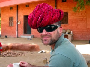 Above, courtyard restaurant at our hotel with Mehrengarh in the far distance (we were sort of across the street from the Umaid Bhavan palace compound), and below…well, we did this little desert village tour and part of that was seeing how long the turbans are that Rajashtani men wear. Is it my color?