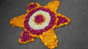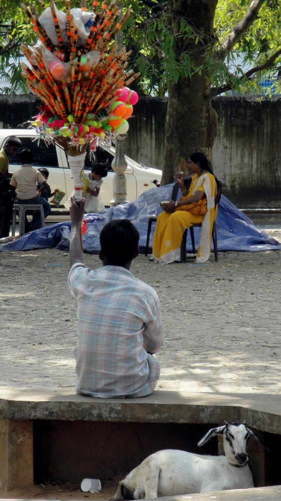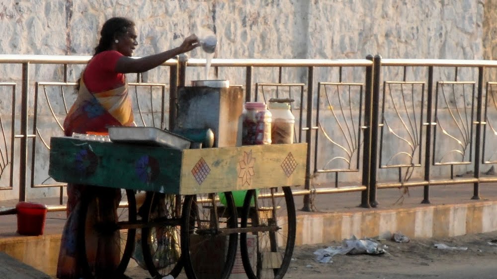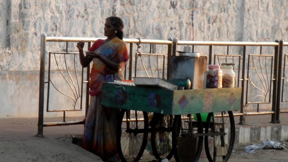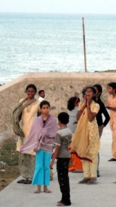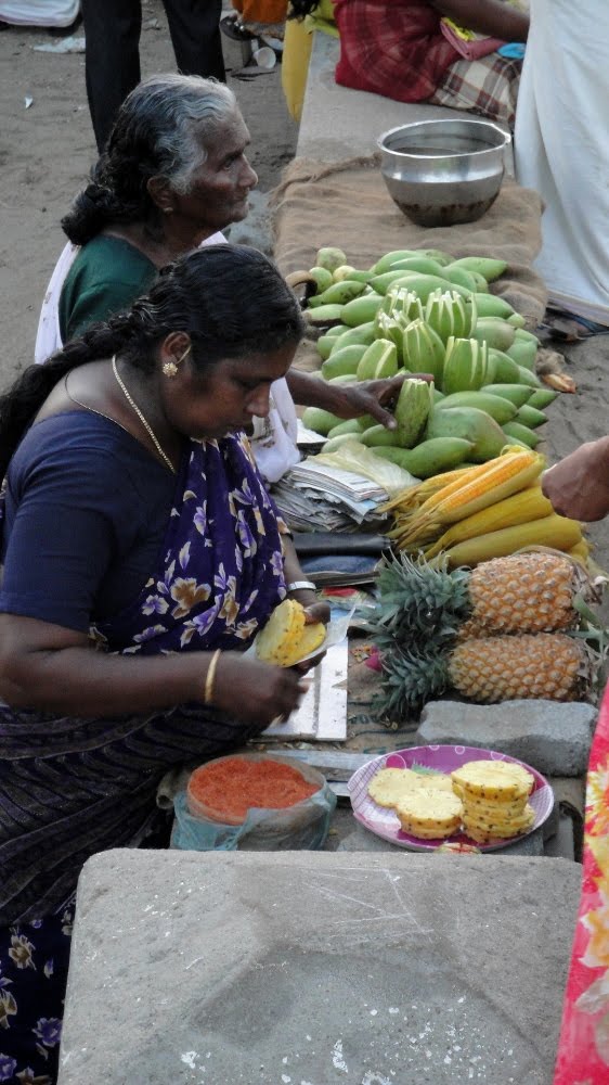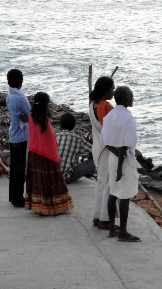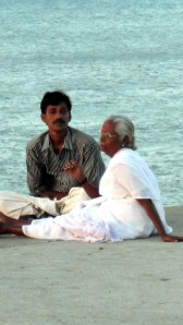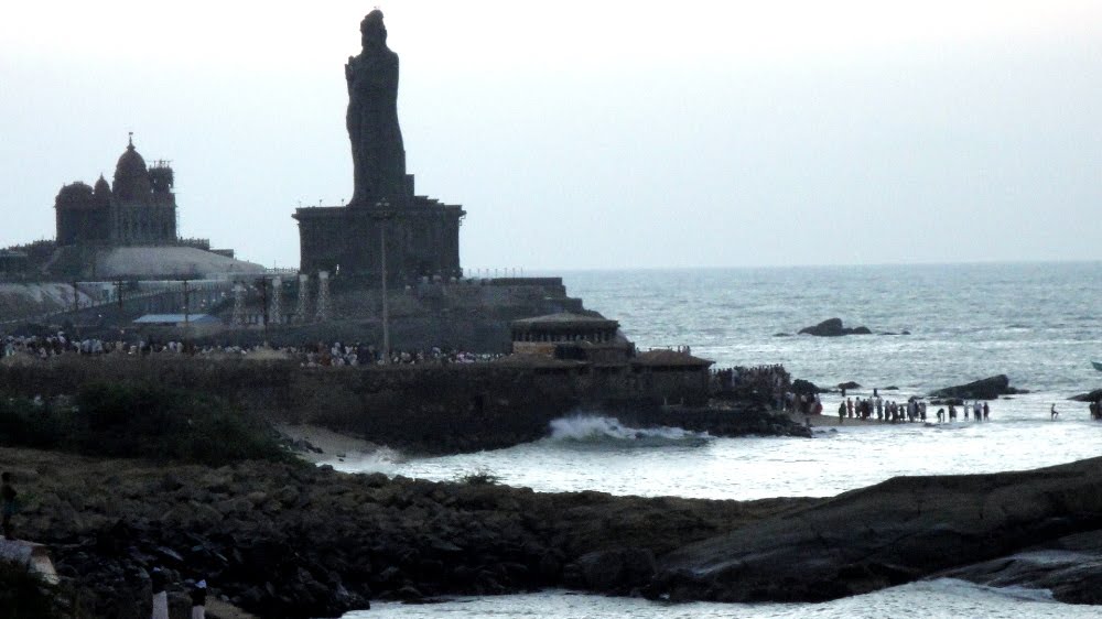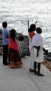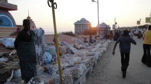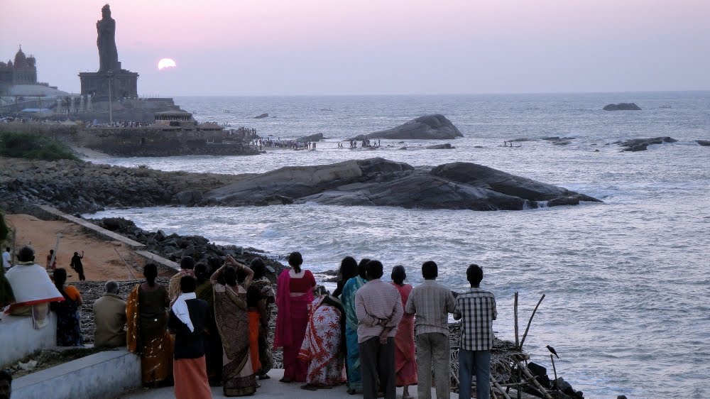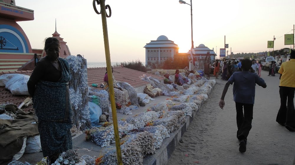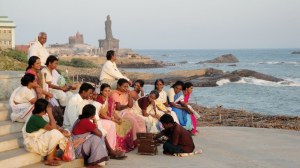 The British, in their wisdom, decided that Kanyakumari – like many Indian locations – needed a name easier for their palates and brains to keep track of. So they called it Cape Comorin. Personally I find Kanyakumari far more flavorful, and it carries with it the name of the virgin goddess Kumari who did her penance here in order to marry Shiva (I’m fairly sure he’s another avatar of Krishna, but who could possibly keep track of all these deities and their avatars?), only to be told by the powers-that-be that she should remain virginal ‘in order to save the world,’ so saith my guidebook. Interesting notion, that. In any case: Kanyakumari is a gorgeously situated little town where the east coast and west coast of India meet in a tip pointing south, where three oceans come together and create water even more special than most rivers and seacoasts in India. Thus come the pilgrims to bathe at sunrise and sunset, thus come the sick and lame in hopes of cure; thus come the groups of schoolkids to scream with joy at the sun’s rise and set each day. The atmosphere at sunrise and sunset here, each day, is a combination fourth-of-july, carnival, and Indian temple, all to the accompaniment of pounding waves, vendors hocking tea or decorated seashells or chile-spiced pineapple slices.