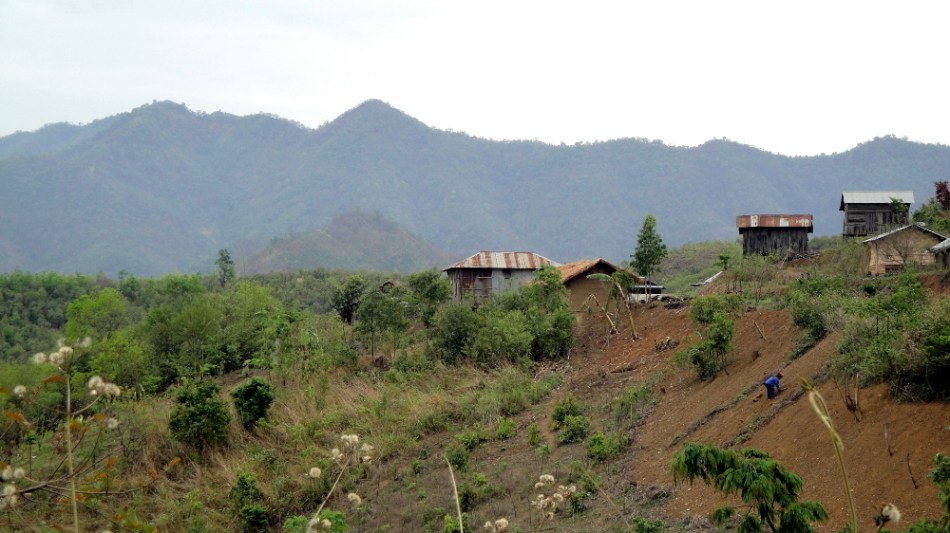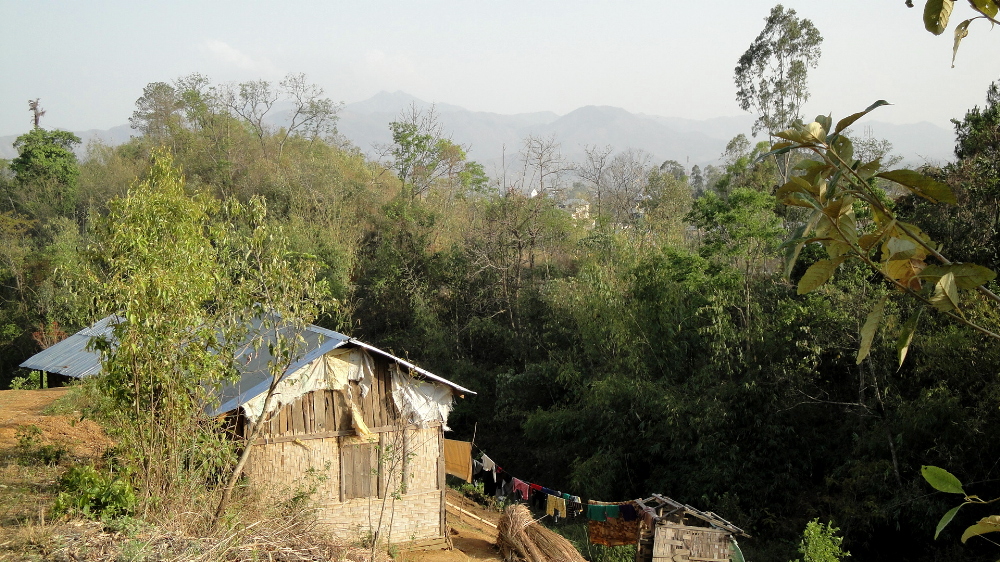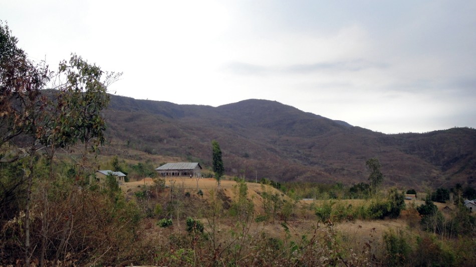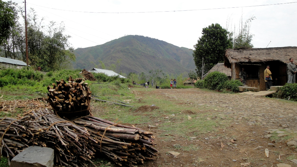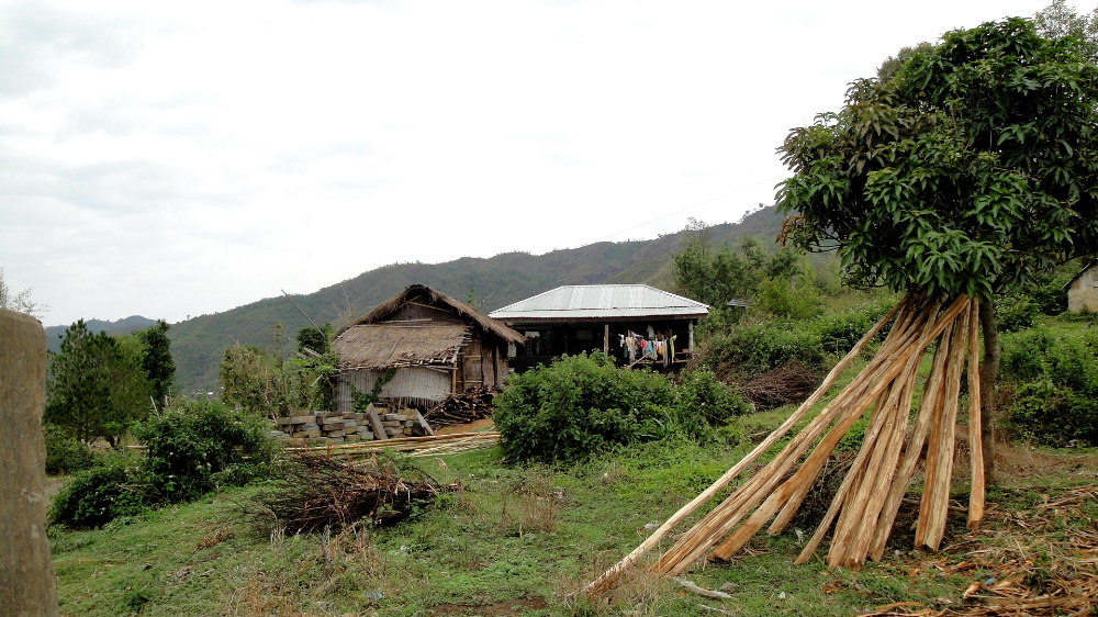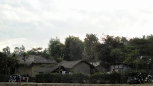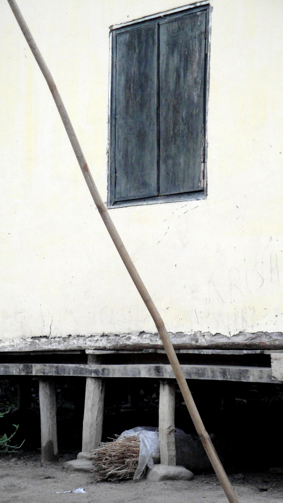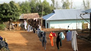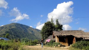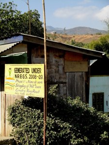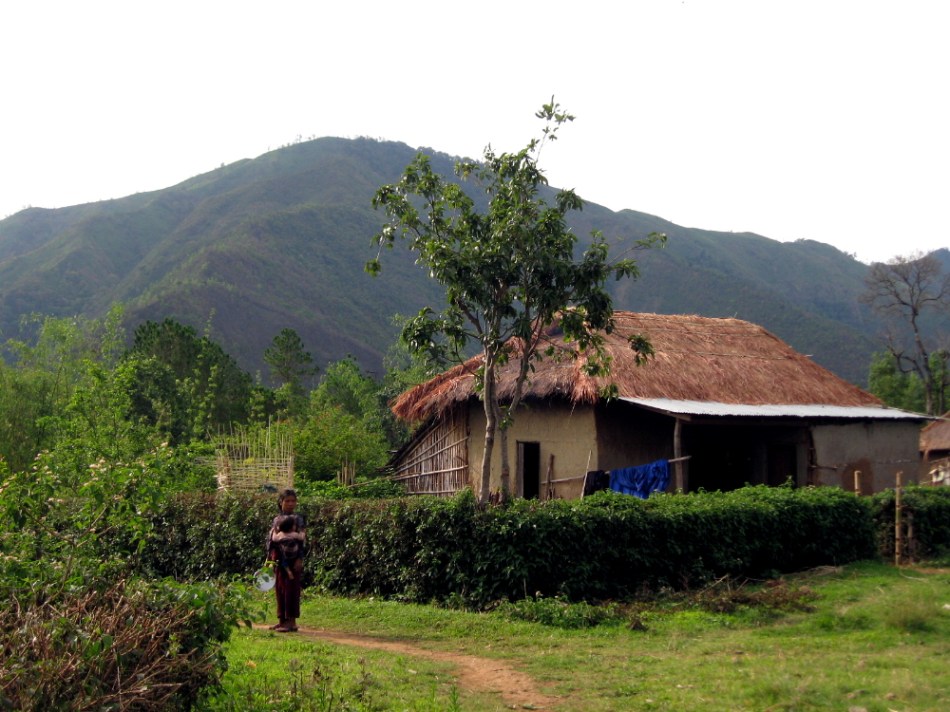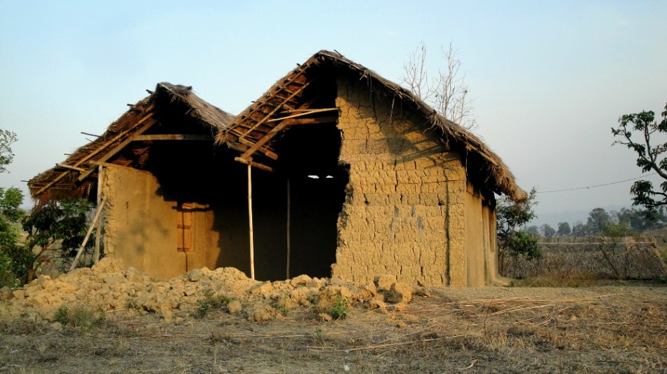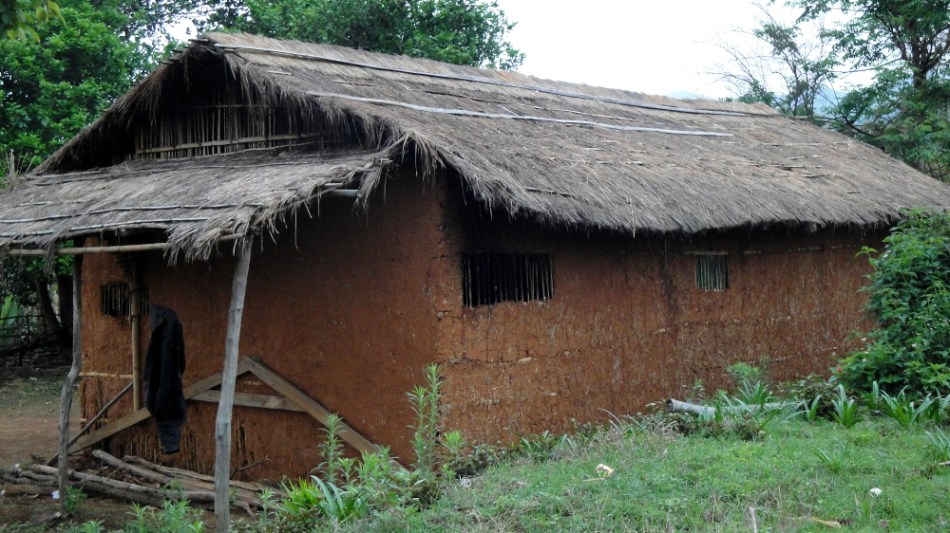Several friends commented on photos of the architecture in Manipur. Above is an excellent example of a good-looking completely traditional hill compound — thatched-reed or rush roof, construction of planks and mud and reeds. This compound shows great civic pride and good upkeep – it’s swept, the wood is neatly stacked, the roof rushes are new and fresh-looking — it’s all really lovely, isn’t it? Our new house in Sugnu, which I was fortunate to spend a few nights in before leaving, is of similar construction but painted a bright blue and with a (bloody loud in rain, but longer-lasting) tin roof; you’ll see it below. I can attest that these houses, while picturesque, are not so comfortable or weather-sound as brick or stone structures; it’s maybe like a midpoint between camping and a solid house with a basement. In any case: below are some examples of houses that haven’t been quite so well maintained, or that finally succumbed to the elements.