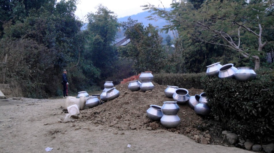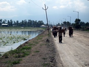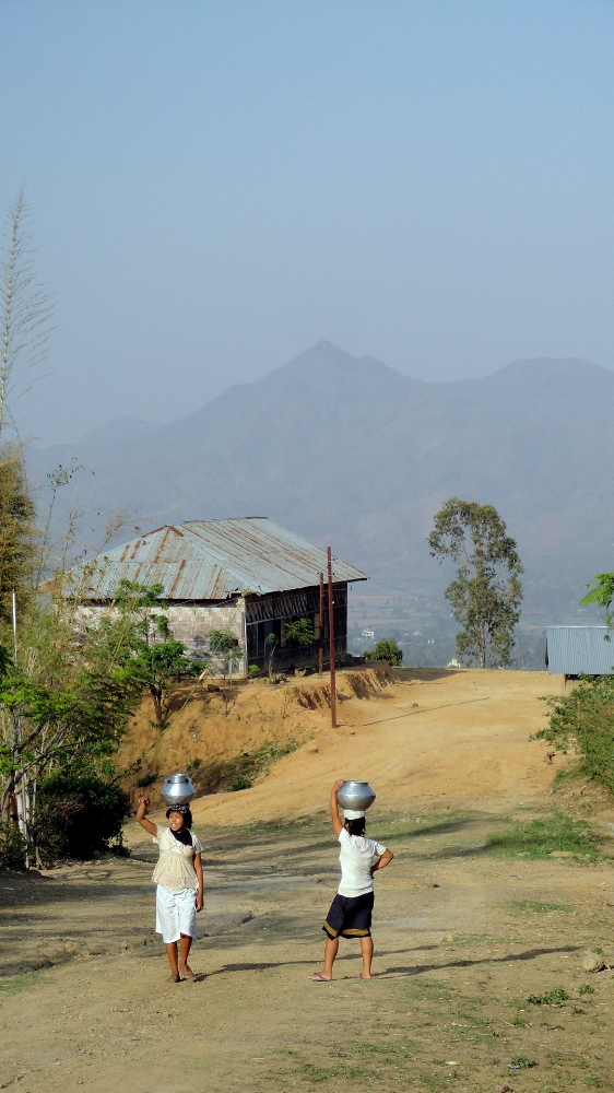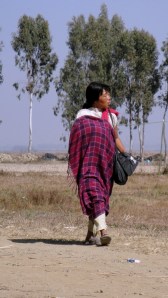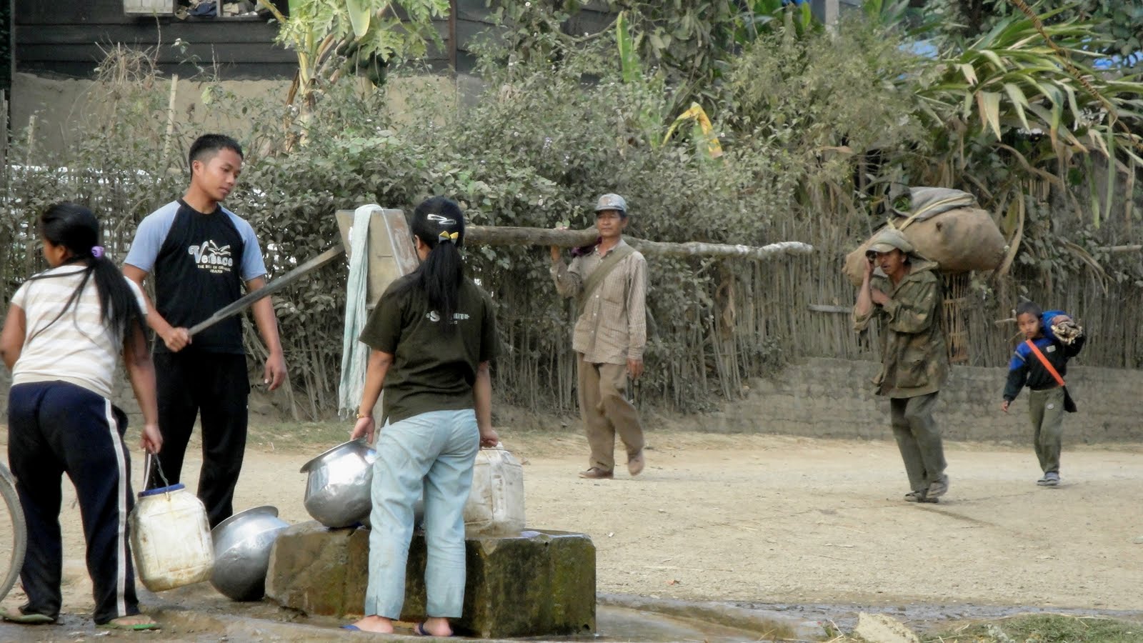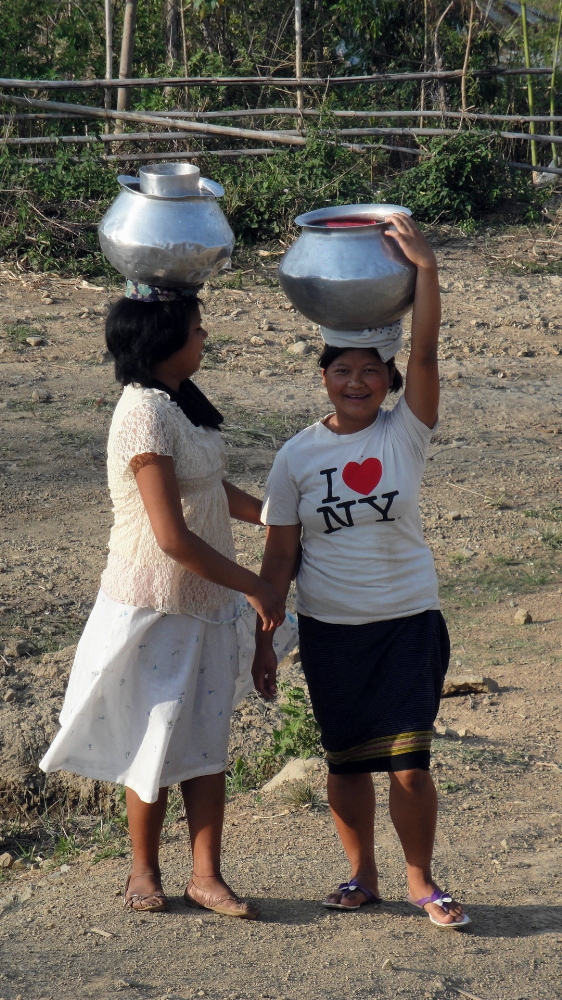 Above: while Par waits for me to catch up on one of our morning ‘hill and valley’ (our favorite route, really) runs, I took this photo of all the water ewers piled up by the village’s water spigot, waiting for the morning water run by all the locals fetching their washing and cooking water. Below, two locals doing just that…both likely wearing second-hand clothing that’s come from the US, but one more obviously so.