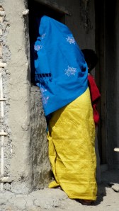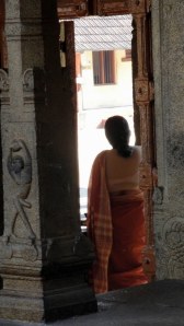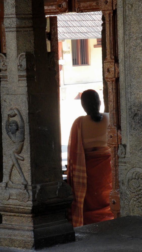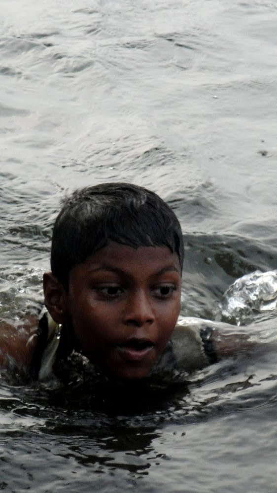Open doors between train cars could be a dangerous enticement. Ever an adrenaline junkie, I’m tempted most on the bridges suspended over a wide, shallow river with banks of deep red soil: so tempting to make the leap and join all those kids down below playing and bathing, adults doing their ablutions and women washing laundry. Barring that, simply to sit in the doorway, hand wrapped around the nearest fixed object and to lean my head into the onrushing wind like a dog on the highway to scan the red-dirt villages, coconut & banana groves, trails full of kids on bikes and adults carrying loads on their heads or backs, is far more enticing than the dark and cool of my 3rd A/C coach seat through that other door to my right. But at least this way I’ve a retreat for when the heat overtakes me or the rushing wind dries my eyes…or when we’re stopped in station and the urine stench from those who couldn’t wait for the long station-stop to end before responding to nature’s call overwhelms my tender nostrils.