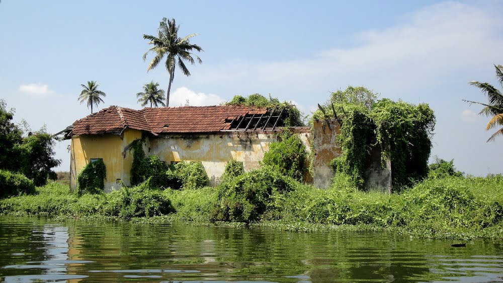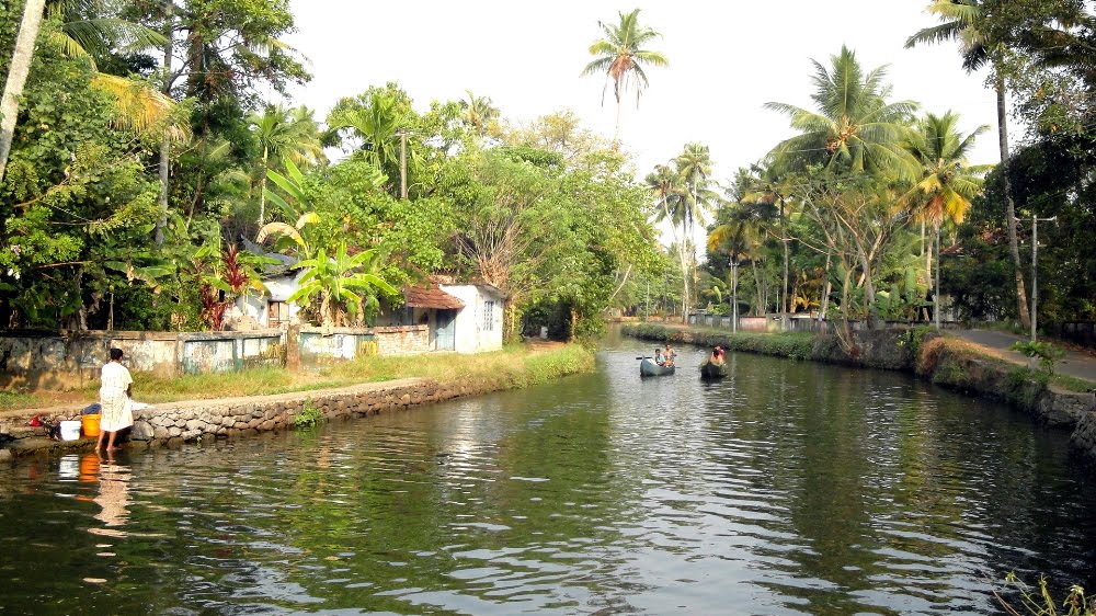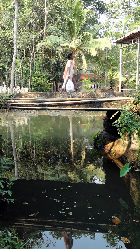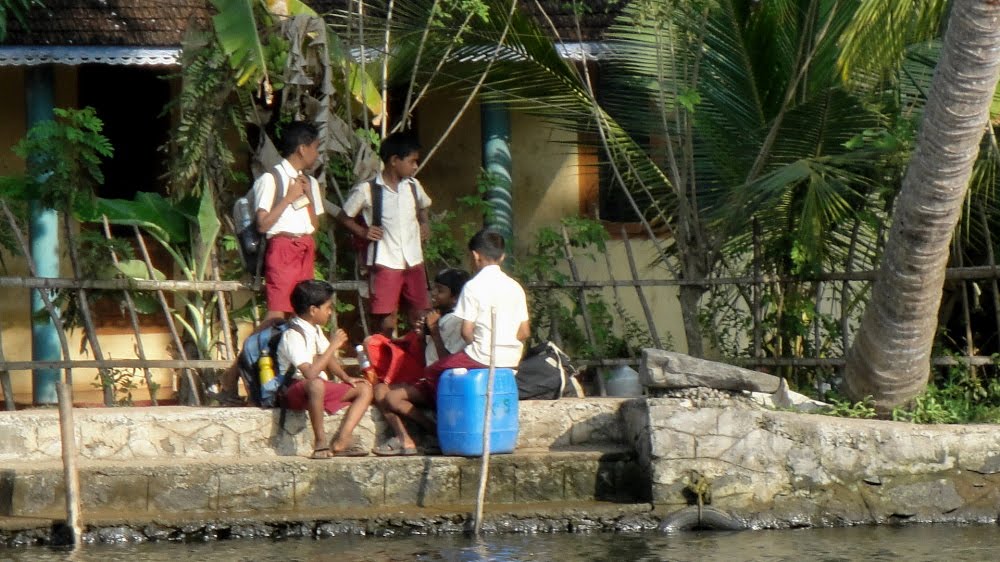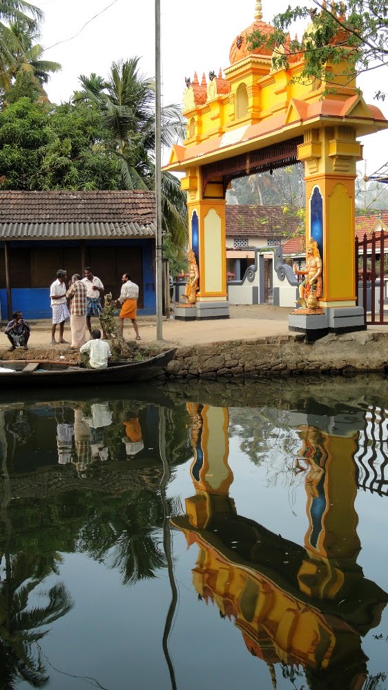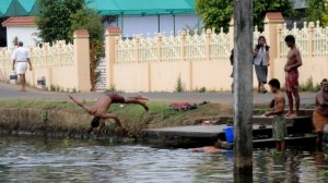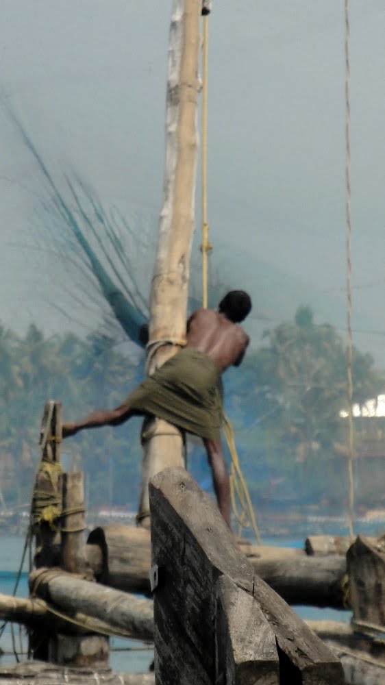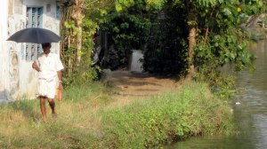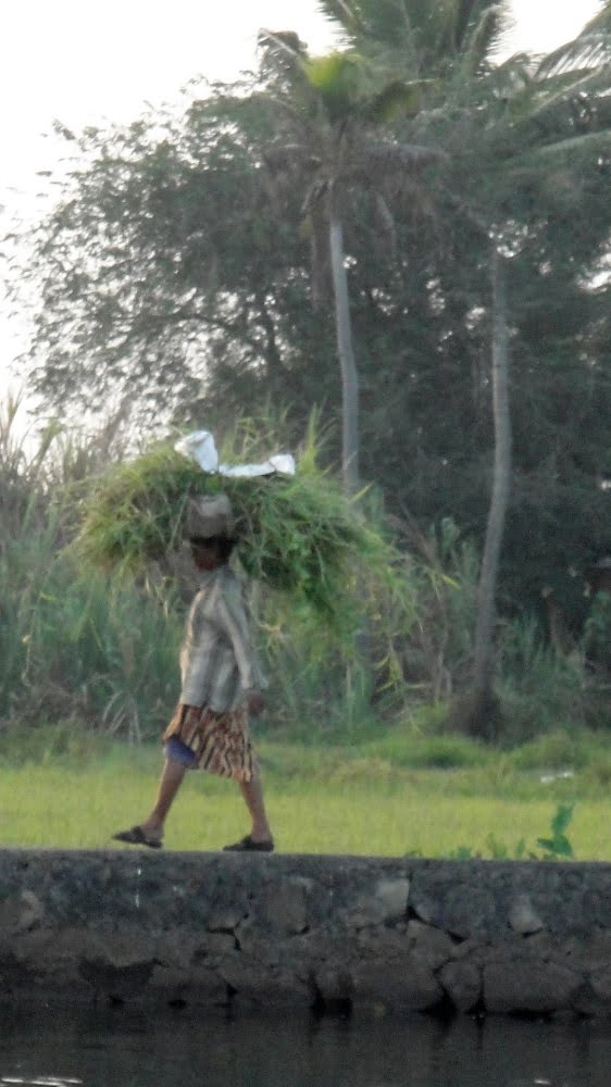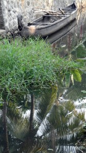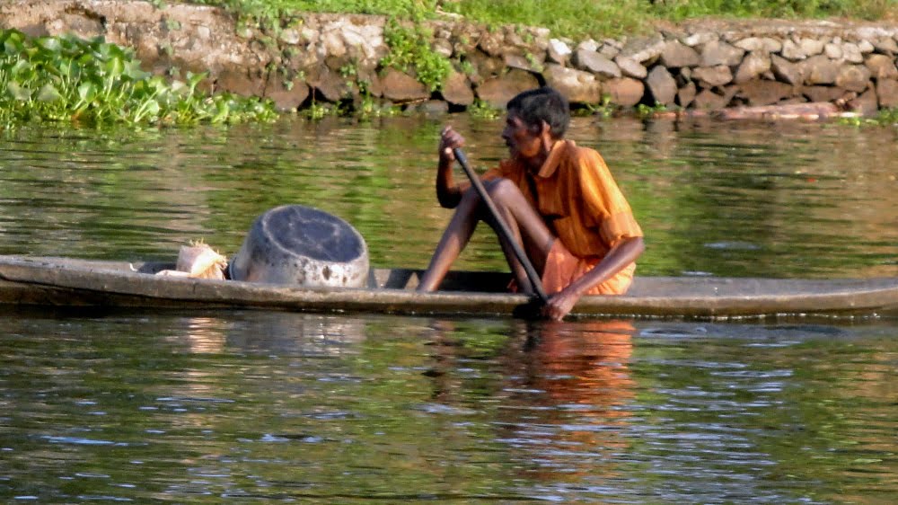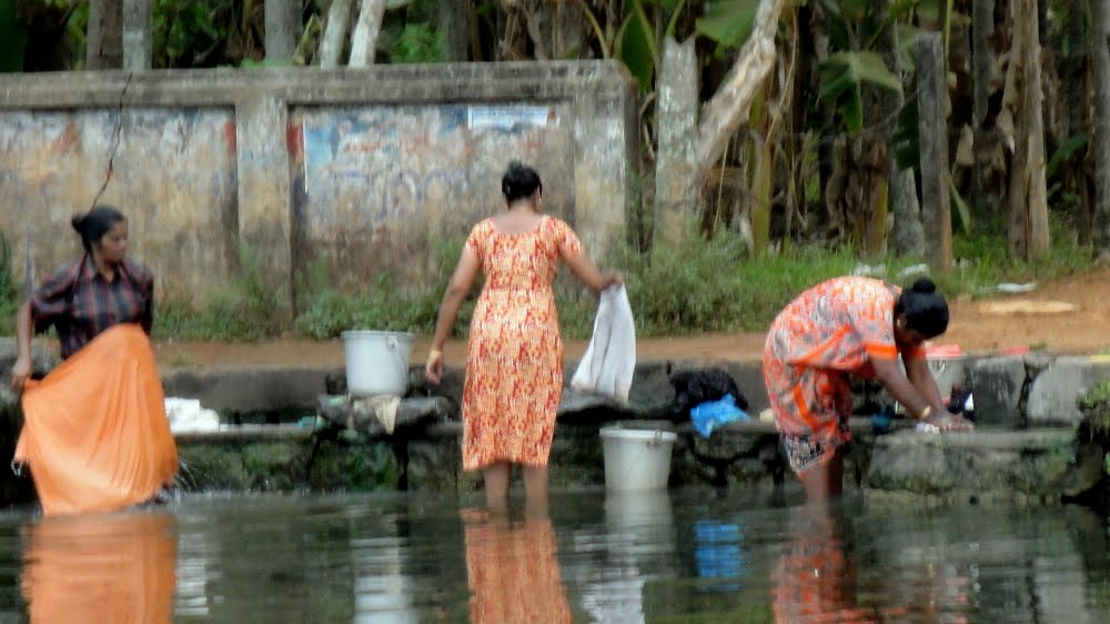 The backwaters are highway, swimming pool, bathtub, tourist attraction, supermarket for herons & egrets & cormorants, seagulls & terns and other water birds; source of income and food for thousands of fishing families…and, above all in my eyes and ears this morning, launderette. Keralan women (plus the occasional man) can be heard and seen punishing the dirt and sweat, drips and dribbles of coconut juice and chutney, grass stains and just plain dirt out of their families’ clothes up and down the length and breadth of every canal and river throughout this vast network of water. That the clothes survive the merciless slapping out of all these stains and dirt must testify to the quality fo Kerala’s spinners and weavers. Many a shirt I’ve worn would dissolve to shreds at such treatment. A woman dunks the offending garment deep under the tepid green water, pulls it out, lathers it with a bar of soap, swings it high above her head in a one-armed lasso motion, then — THWACK! — whips it down on the nearest flat rock, with the fury of one to whom cleanliness truly must be close to godliness…and who has every intention of achieving for herself and her family’s clothing, at least, both states. Lather, rinse, repeat thwack, all along the highways and byways of this watery world.