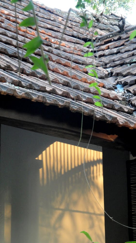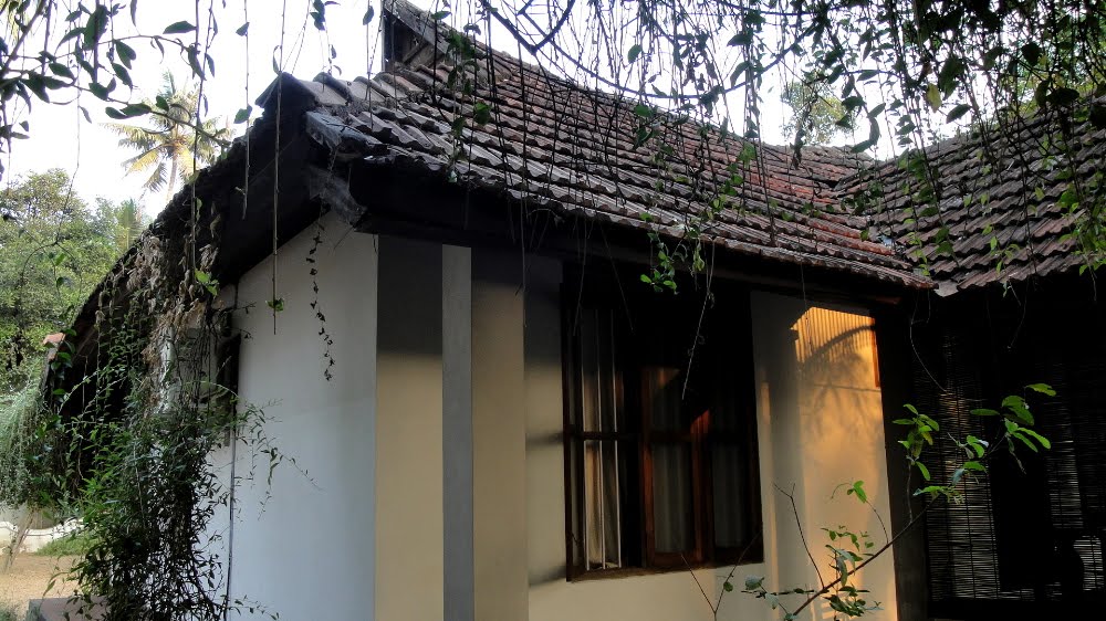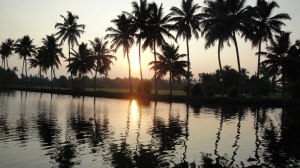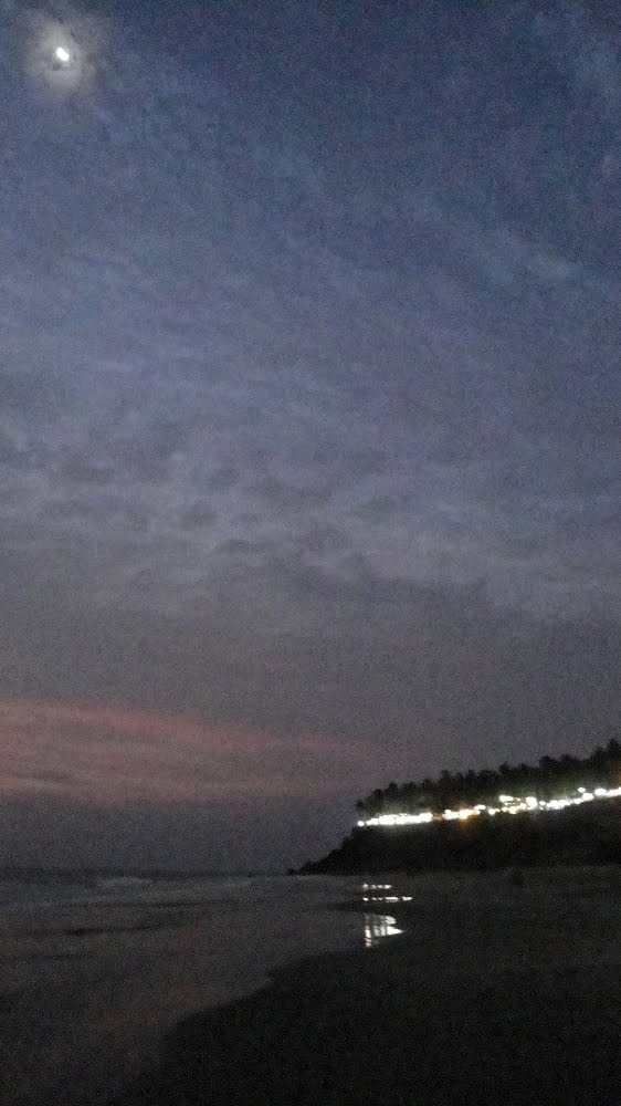 Plunging through the clouds, a definable landscape emerges for the first time since brief reflections of sun on water somewhere over Karnataka or Maharashtra. Closing in on ground level, the seemingly omnipresent carpet of trees resolves itself into dense, endless stands of coconut palms. From the runway, and again from the car driving south to town, the setting sun hangs as an equatorially enormous, red ball glaring at us through the dense haze of cloud at the horizon; so dense is the haze that I can stare directly at the setting sun’s enormous clock face without shielding my eyes at all. It’s a remarkable color, neither red nor yet orange, not fuchsia or pink. Rather like the most vivid and rich color on the top of a ripe summer peach where it shades from orange over to red near the stem, only far deeper and nearly fluorescent. The thick haze that veils the sun and yields this color is quite flat and undifferentiated, except a wispy strand like a dark birthmark reaching into the orb at 7 o’clock.