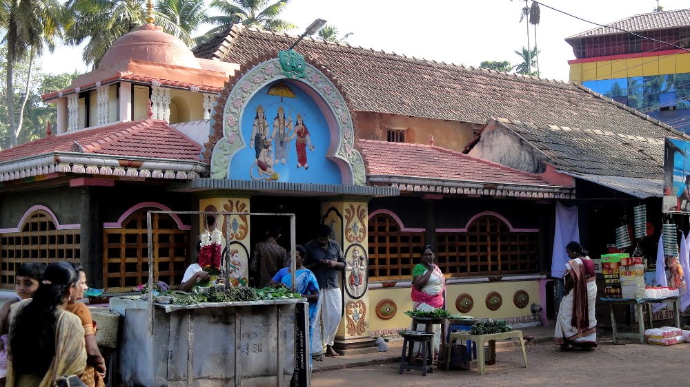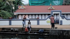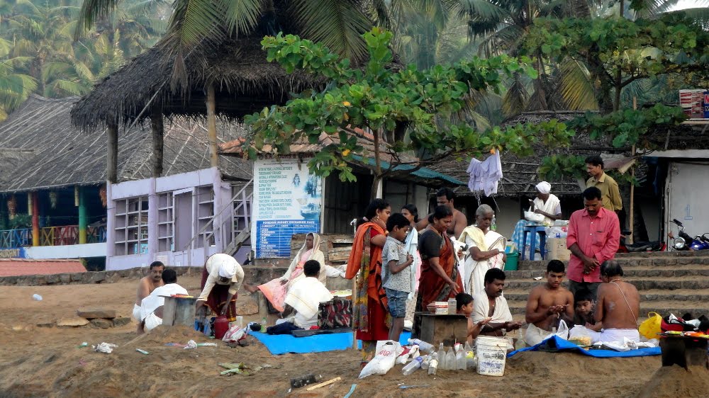 Then there’s the ancient temple town to which pilgrims come to pay homage to Krisha at the 2,000-year-old Janardhana Swamy Temple, a place pure enough of practice that non-Hindus are normally not permitted entry; the town like many Indian beach and river towns where sunrise rites and blessings are conducted by the religious and their teachers at water’s edge. In Varkala, this means the beach has two distinct shifts: the sunrise shift of worshipers and purifying bathers (always quite clothed: religious Indians don’t strip down too much before entering the water, and are NOT thinking about their tan lines) plus the occasional early-rising Euro-American meditator, jogger, or beach-comber (often most incongruous in shorts and sports bra passing through the wafts of incense and chanted prayers).