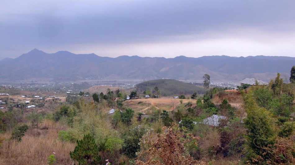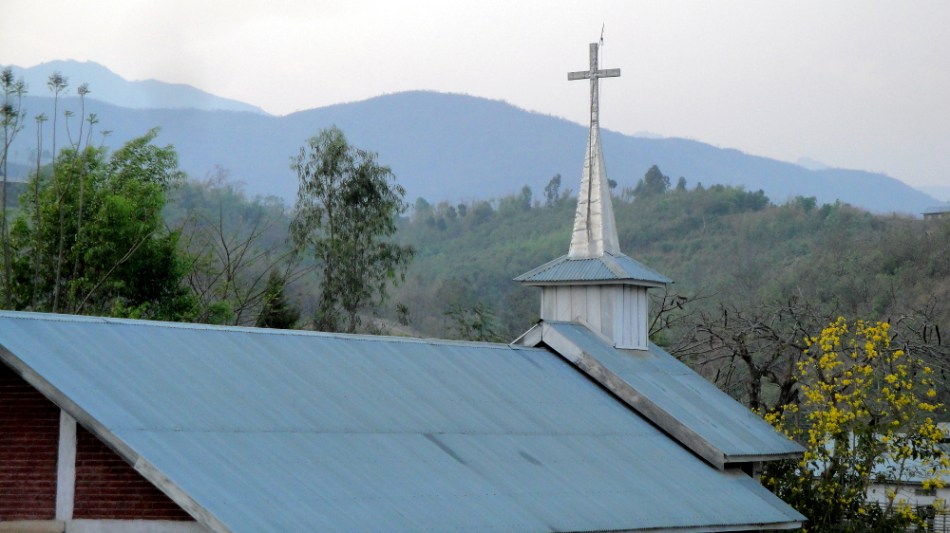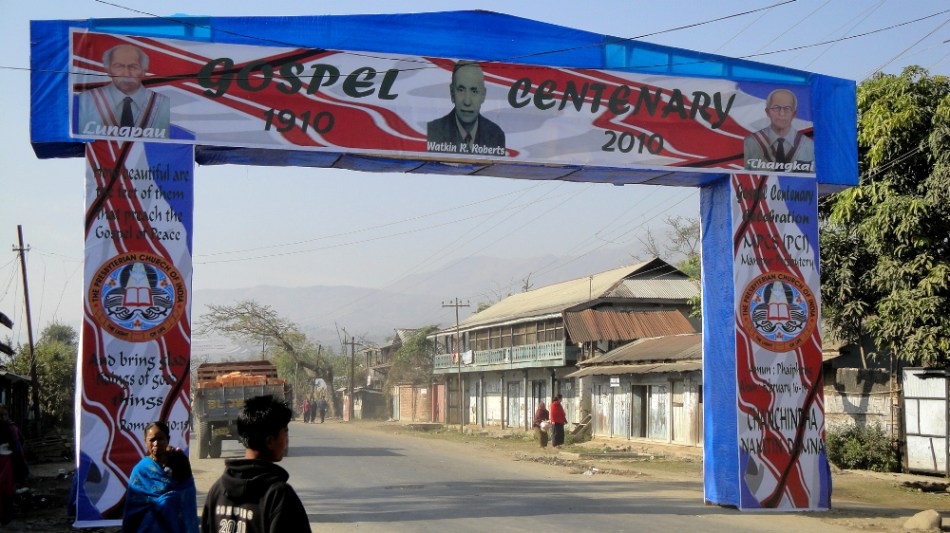 Below is the view from our house, more precisely the view from the bathroom I used most days to shower and brush my teeth and so on. Not a bad view, huh? Quick review & explanation for those who don’t know: maybe 1/3 of Manipur’s total population is made up of people belonging to various hill tribes such as Gangte, Kuki, Miso, Naga, Paite, Vaiphei, Zou etc. (More than 40 recognized minorities make up the 2-1/2 million residents of Manipur.) Nearly all of the hill tribal folks were converted to Christianity by missionaries from the US and UK in the early 20th century – indeed, below you’ll see a festive arch commemorating the ‘gospel centenary,’ i.e. 100 years since those first missionaries introduced Christianity to that part of Manipur. Since we lived, and primarily worked, in Churachandpur and other hill tribal areas, we saw a lot of churches — and they make an interesting visual against the lovely mountains. The majority population in Manipur are the mainly valley-dwelling Meitei or Manipuris, who’ve been living in this little valley for something like 2000 years and have a long history of art and culture of which they are quite proud. The Meitei are about 80% (so I’ve been told) Hindu these days, having largely converted when a king led them to do so in the 18th century (I think); the remaining 20% or so mostly adhere to the Meitei or Manipuri indigenous religion, which existed before the conversion to Hinduism. There are some churches in the valley, but I don’t think many Meitei are Christian.