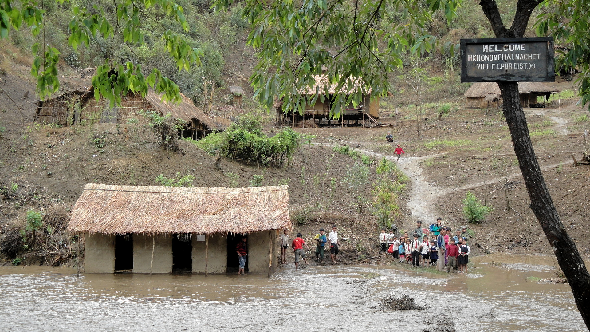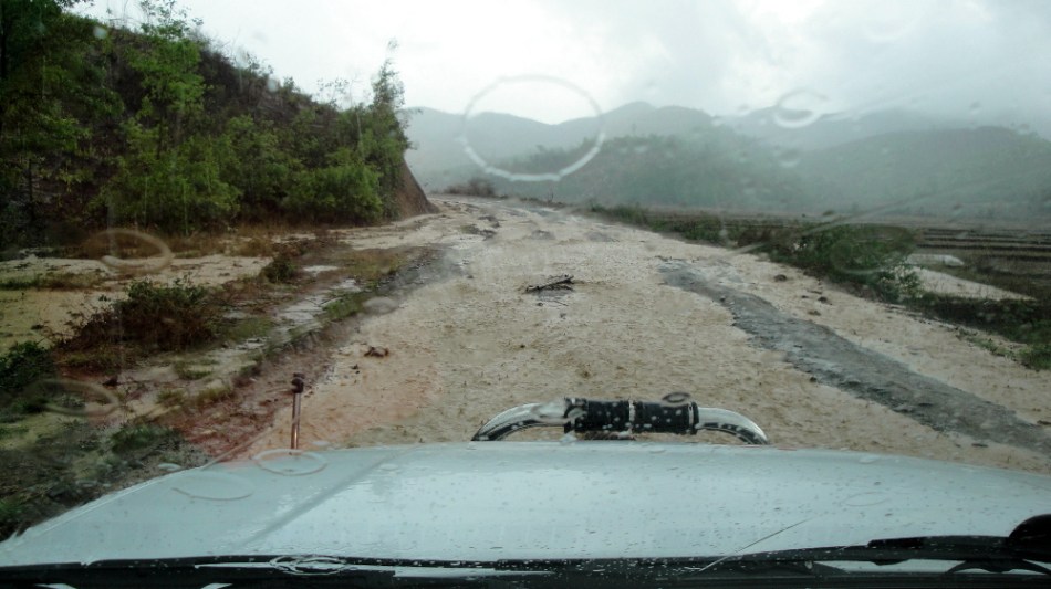 Coming back one day on the road between Sugnu and Tuining, the skies just opened up – hail, massive rain, rivers in the roads. Below is a school being evacuated after the creek by which it sits got a bit too big for its banks from the same storm – the shot below was taken about 10km and 30 minutes down the road after the shot above.
