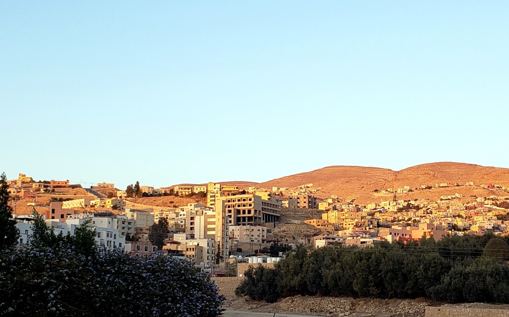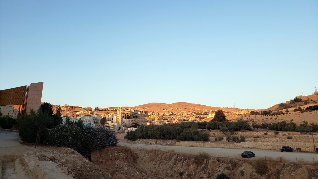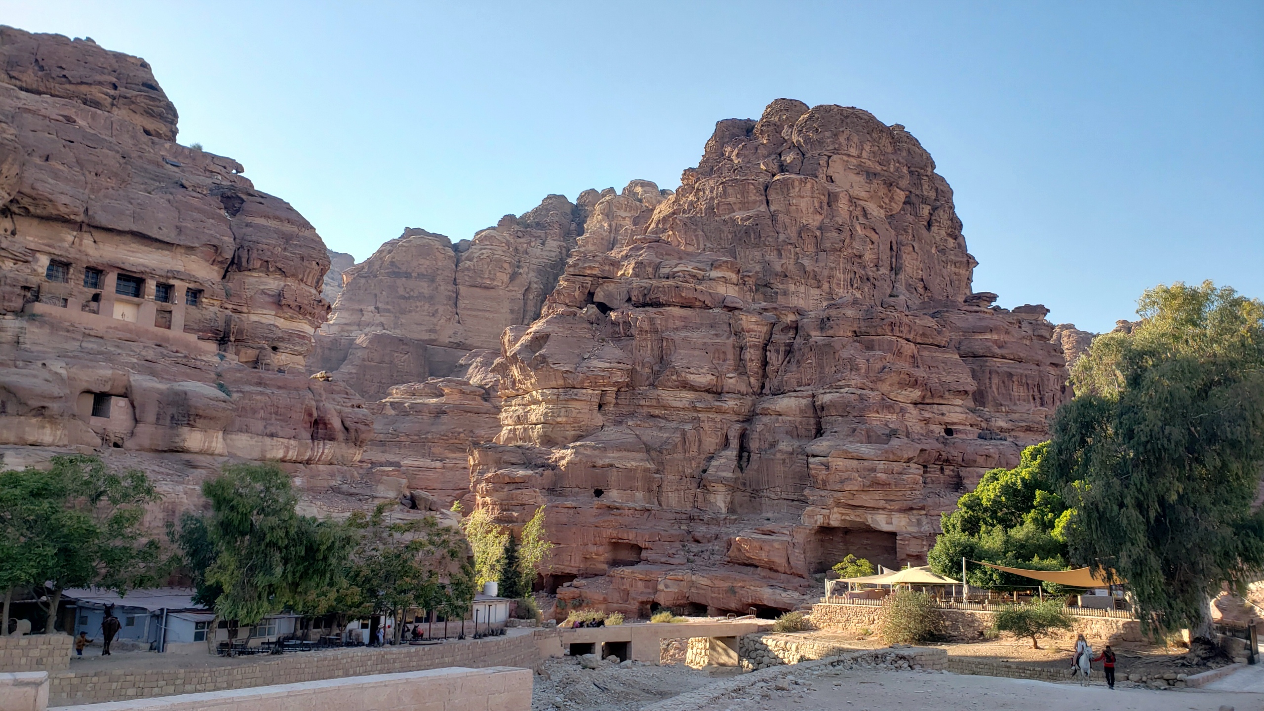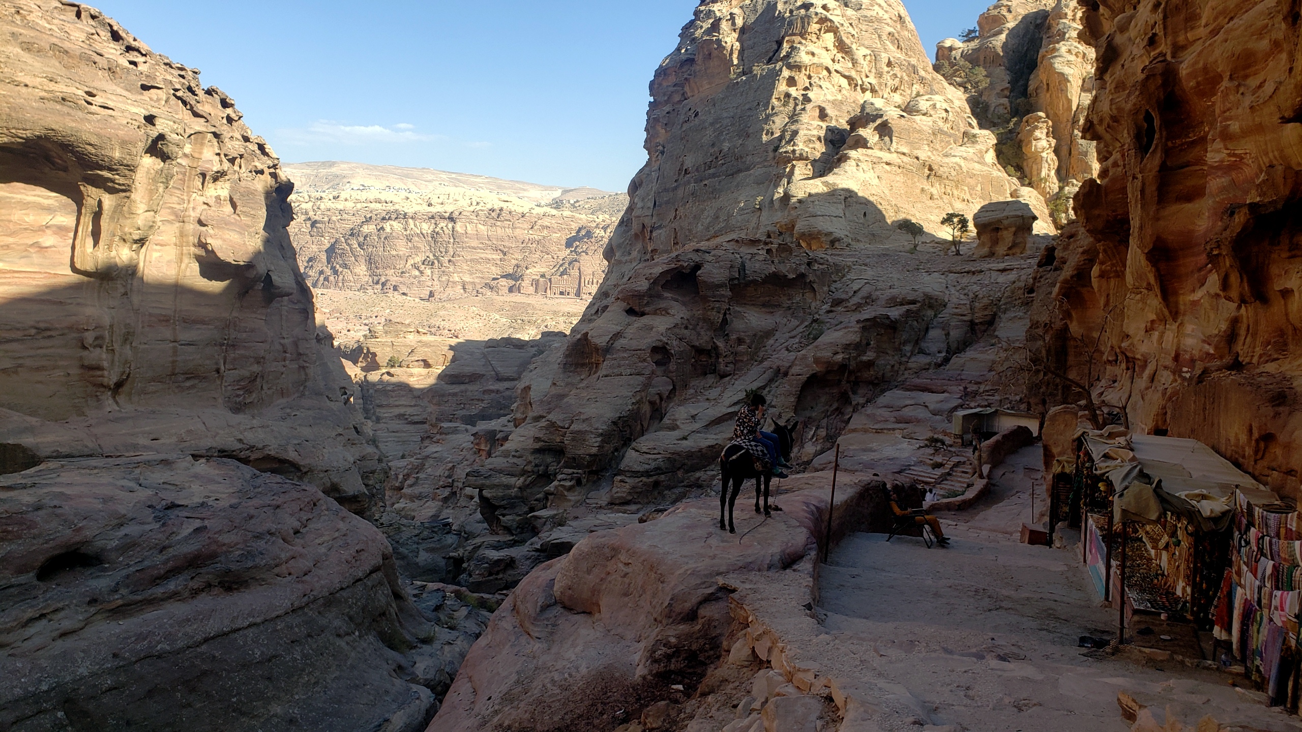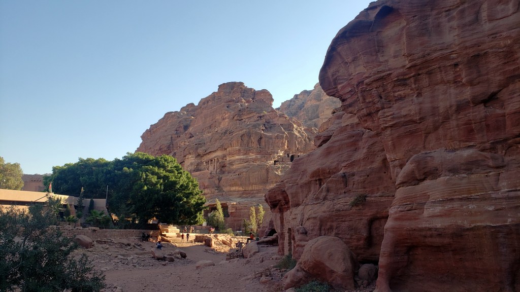 Enlarge on a full screen and you’ll notice again the cliff face of the Royal Tombs in the top left quadrant of this photo. We’re walking back down toward the basin and an exploration of the Great Temple, buying various items along the way in the face of the excellent persuasive sale pitches of these vendors 🙂