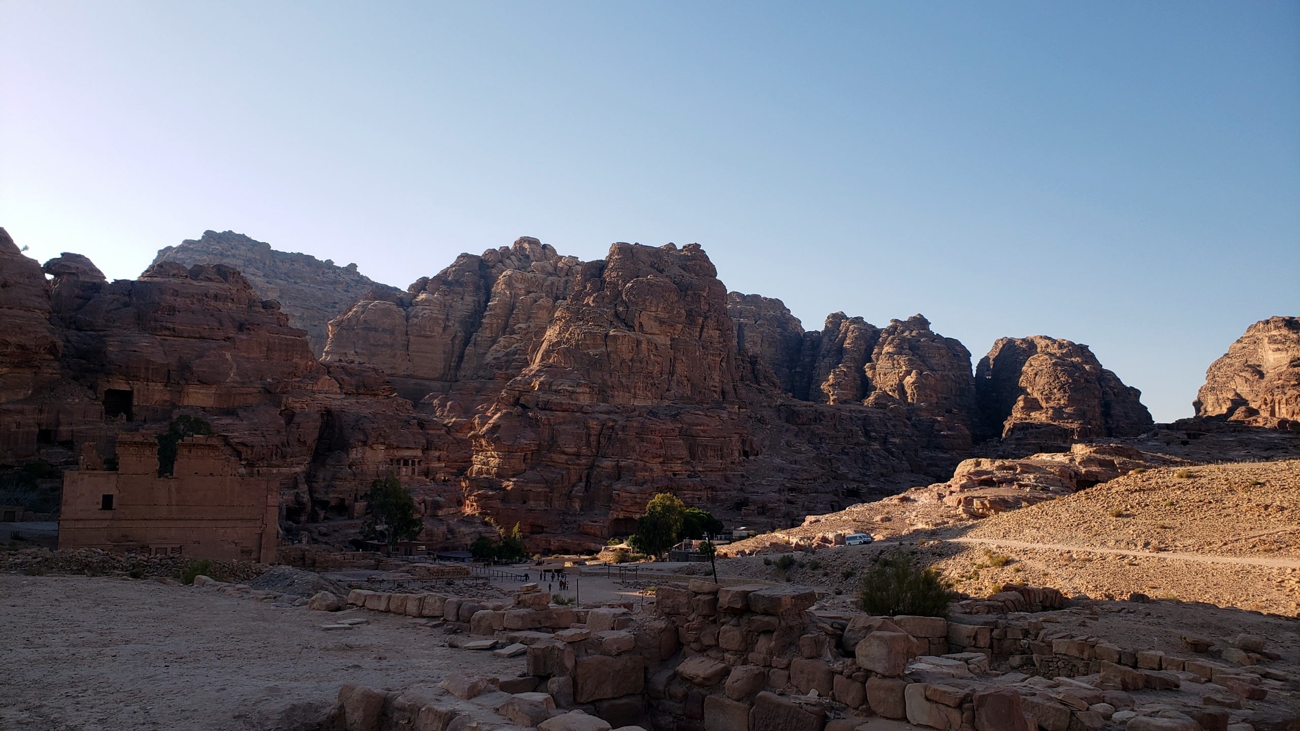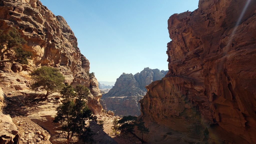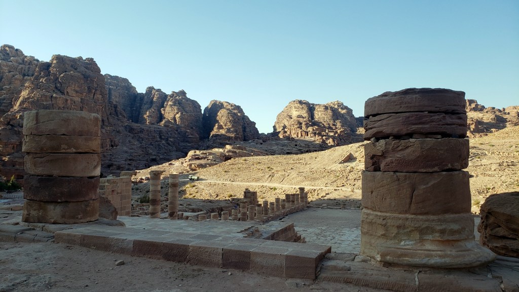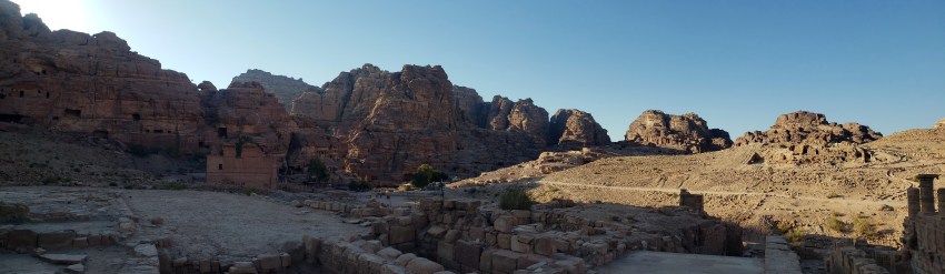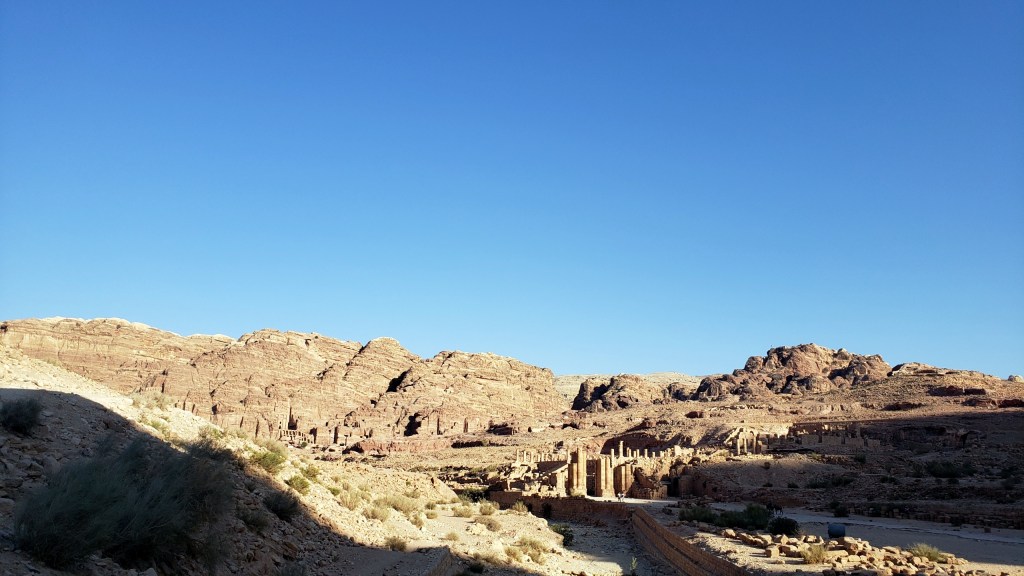 So today you see: above, the area I call the Basin b/c it’s got a restaurant of that name (the low roof on the left), and it’s pretty much the lowest point inside the Petra compound. And below, first the view from the basin back up towards the Great Temple (more of that very soon) with the Royal Tomb cliffs in the distance; and the third photo shows you the view looking back to the start of the Monastery trail and the hills from which came all the solo photos this past week, as seen from within the Great Temple ruihs.