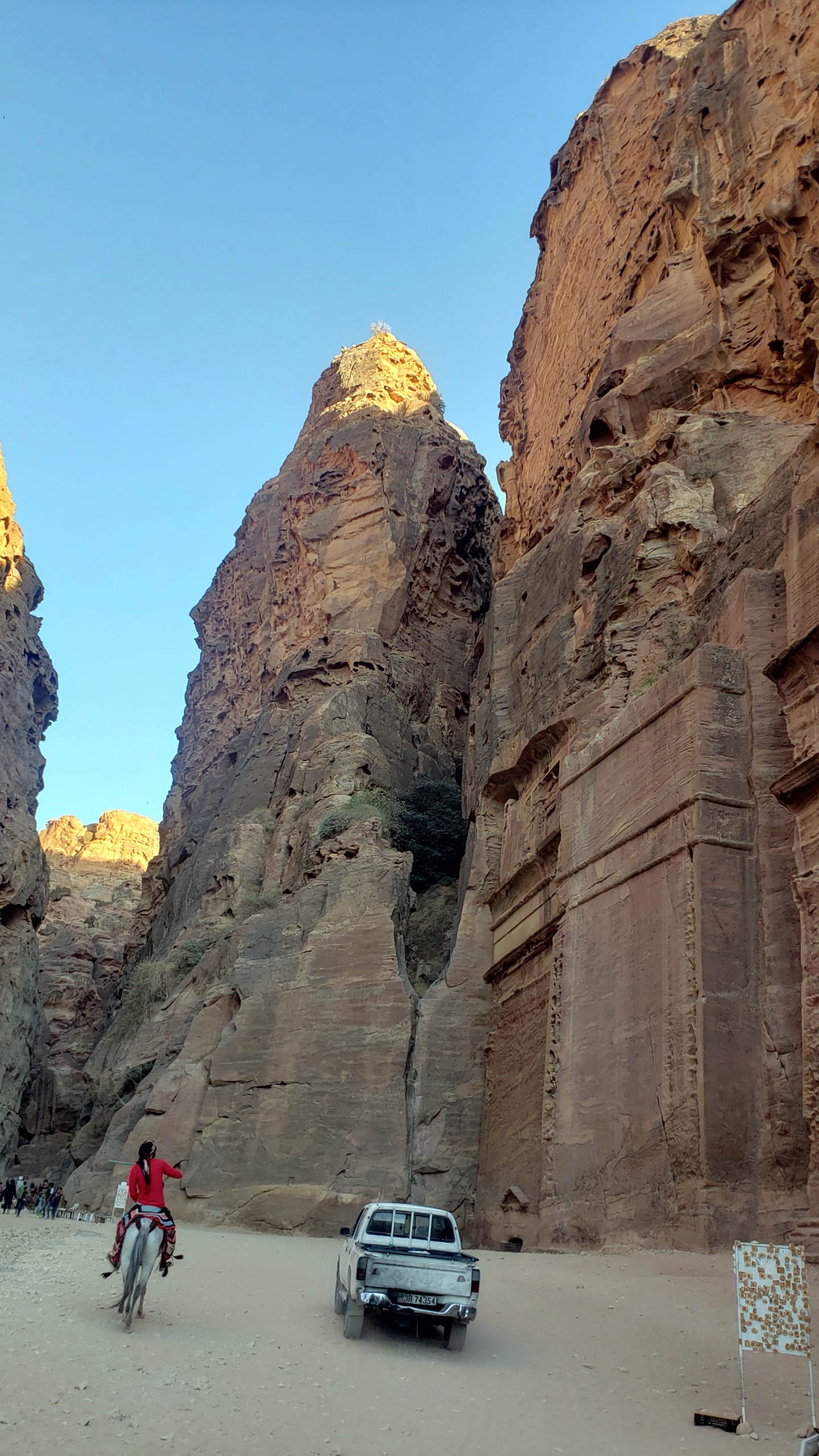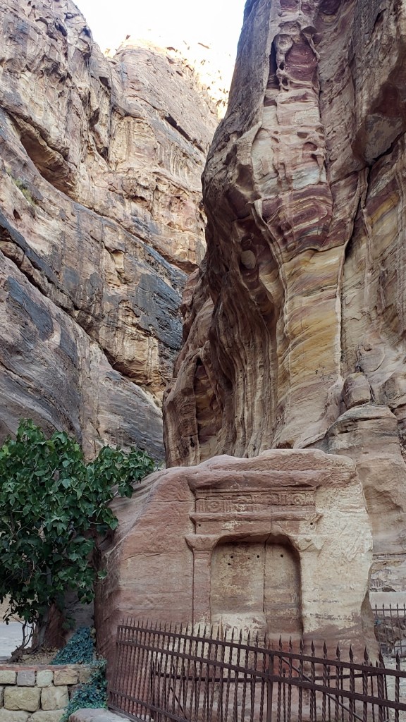 We’ve walked back past the Royal Tombs, the Theater, The Wall of Facades…we’ve turned into the Siq where – this evening, after rushing through it with barely a pause for a photo 12 hours ago on my way to the heights to look down at the Treeasury – this solo tomb stands alone in an odd corner.