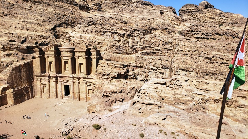 You should imagine Paul, belly full from a pretty decent lunch buffet with plenty of water and tea, now walking up a long path with a welcome amount of shade because I timed this for the afternoon when the cliffs on our left would provide some respite. The path leads to a building that is quite amazing, which is high enough up that it’s less than ten minutes further on to where you can look down over a precipitous drop from the edge of these mountains, over to the Negev Desert in Israel, and north to the Palestinian Territories. The vendors really wanted business. I may have bought more than I normally would, because it was just so clear that tourism was way lower than usual and everyone needs to earn a living. I don’t regret a single thing I bought :-). Below: the obligatory orientation shot to show you where the cliff face of the Royal Tombs sits as seen from this path. You’ll notice that we’re now higher up and farther away.