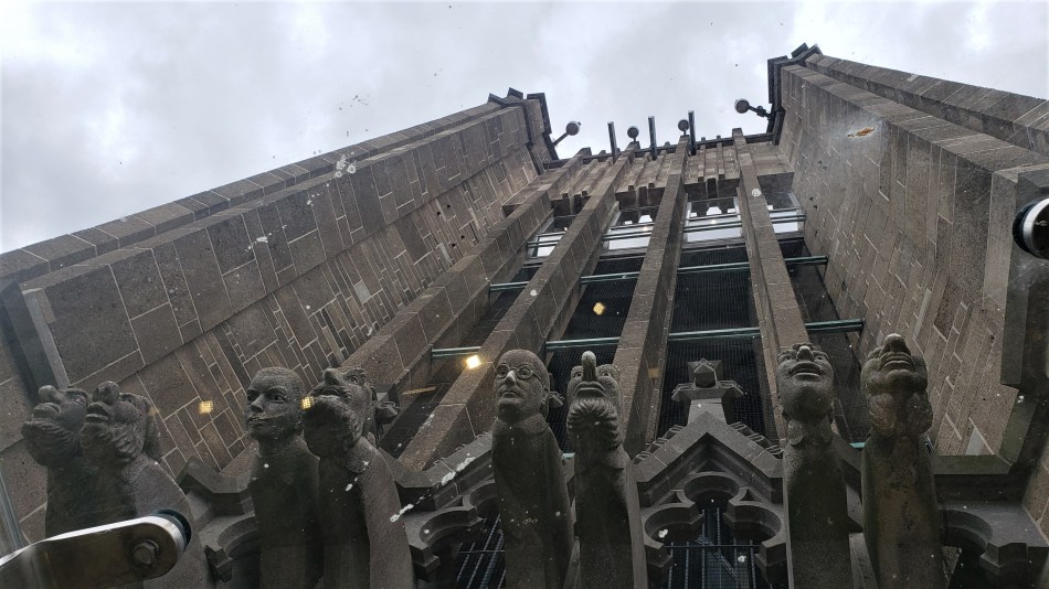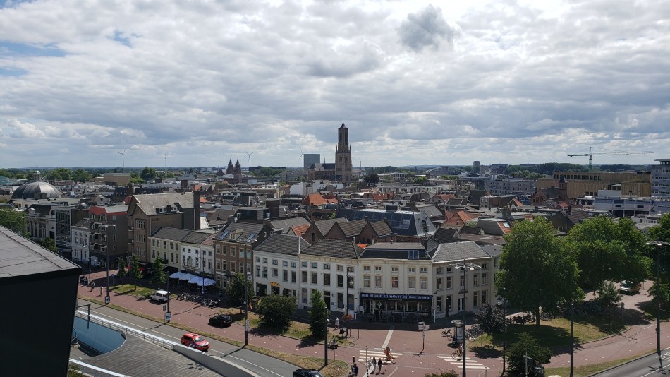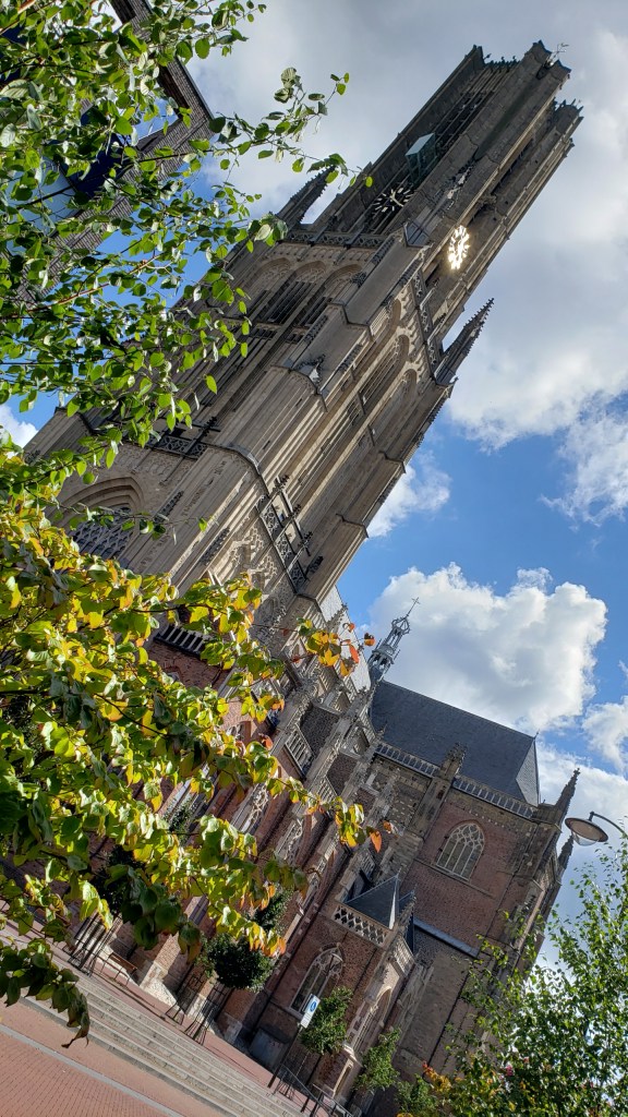 Our penultimate suite of photos from the lovely city of Arnhem, capital of the (by Dutch standards) very large province of Gelderland. My cousin Sam commented the first time I posted a photo of this historic cathedral that he loves the cathedral – simply because it’s a lovely and impressive structure and stands out in the cityscape, as you see. Add the history, to which I referred in an earlier post, and it gets even more interesting. But then, ask yourself how I got close enough to photograph the interesting sculptures of individuals you see in the photo above? And then look closely just above the left-hand clock in the photo below. Yes, that is one of two “glass balconies” built into this structure, and yes, I walked out onto both of them, and yes, even I who am really not afraid of heights found it a wee – bit – freaky. I do very highly recommend the experience and have already told Sam that we need to go when he visits. We’ll see if he can fit into his itinerary or not :-). In the gallery below, more photos from Arnhem as taken either from the church tower & glass balconies, or from my walks around town.