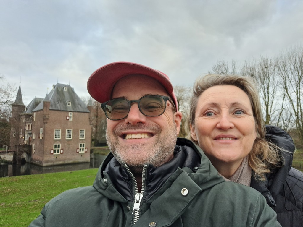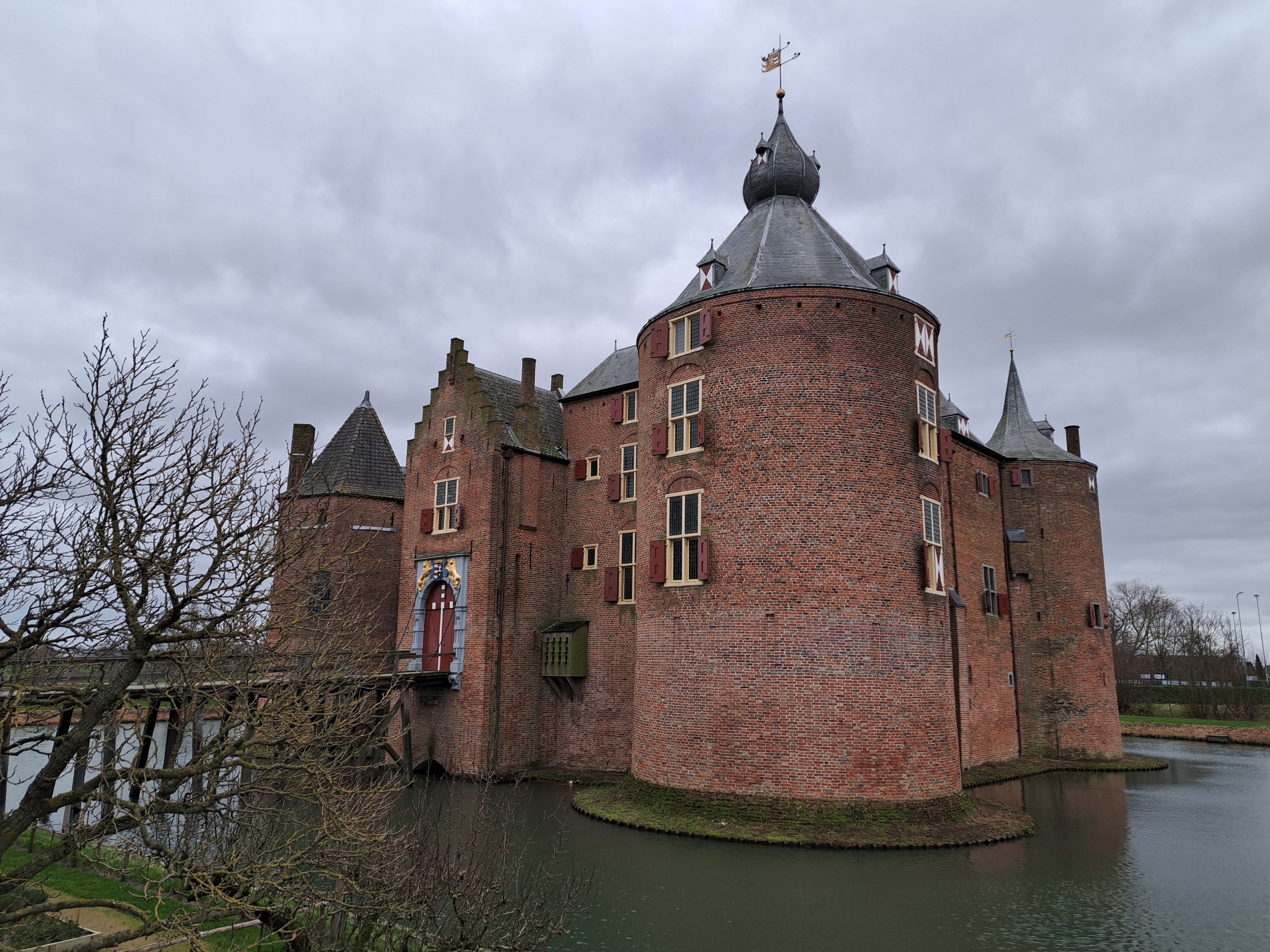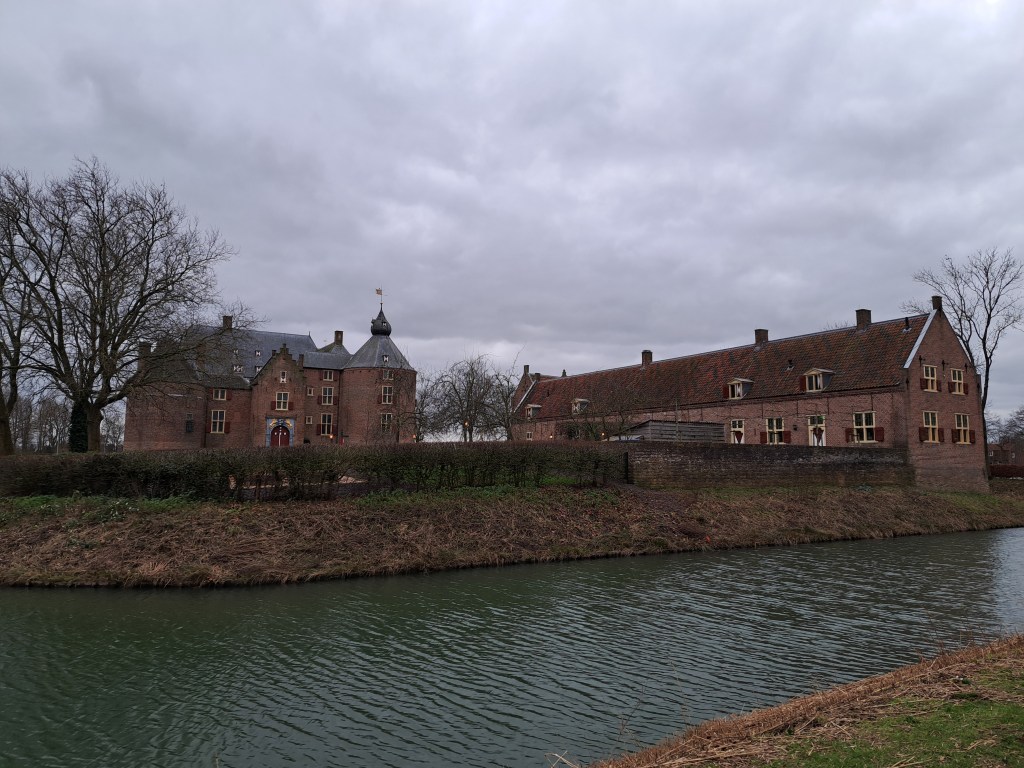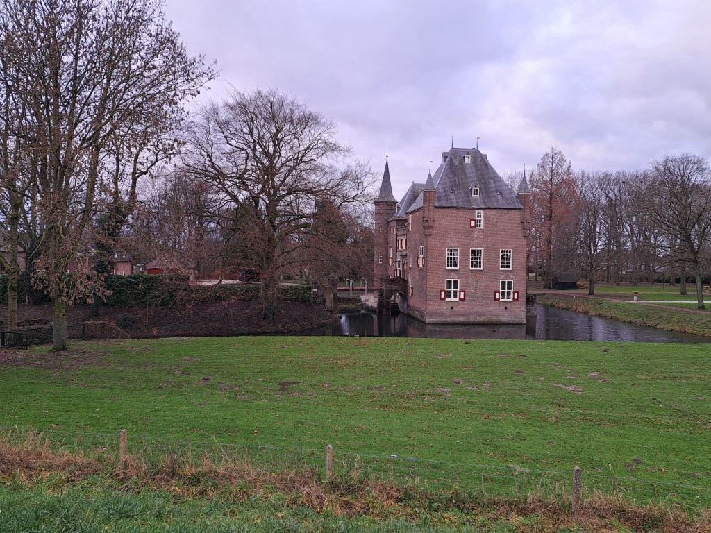 The heavily-flooded Maas (Meuse), which here functions as the border between the Dutch provinces of Gelderland (to left, north in this photo) and Noord Brabant. Took this, plus the shots of two different castles in two different villages below, during a 26 December walk with my friend Kiki while visiting her for a lovely Christmas-holiday afternoon.