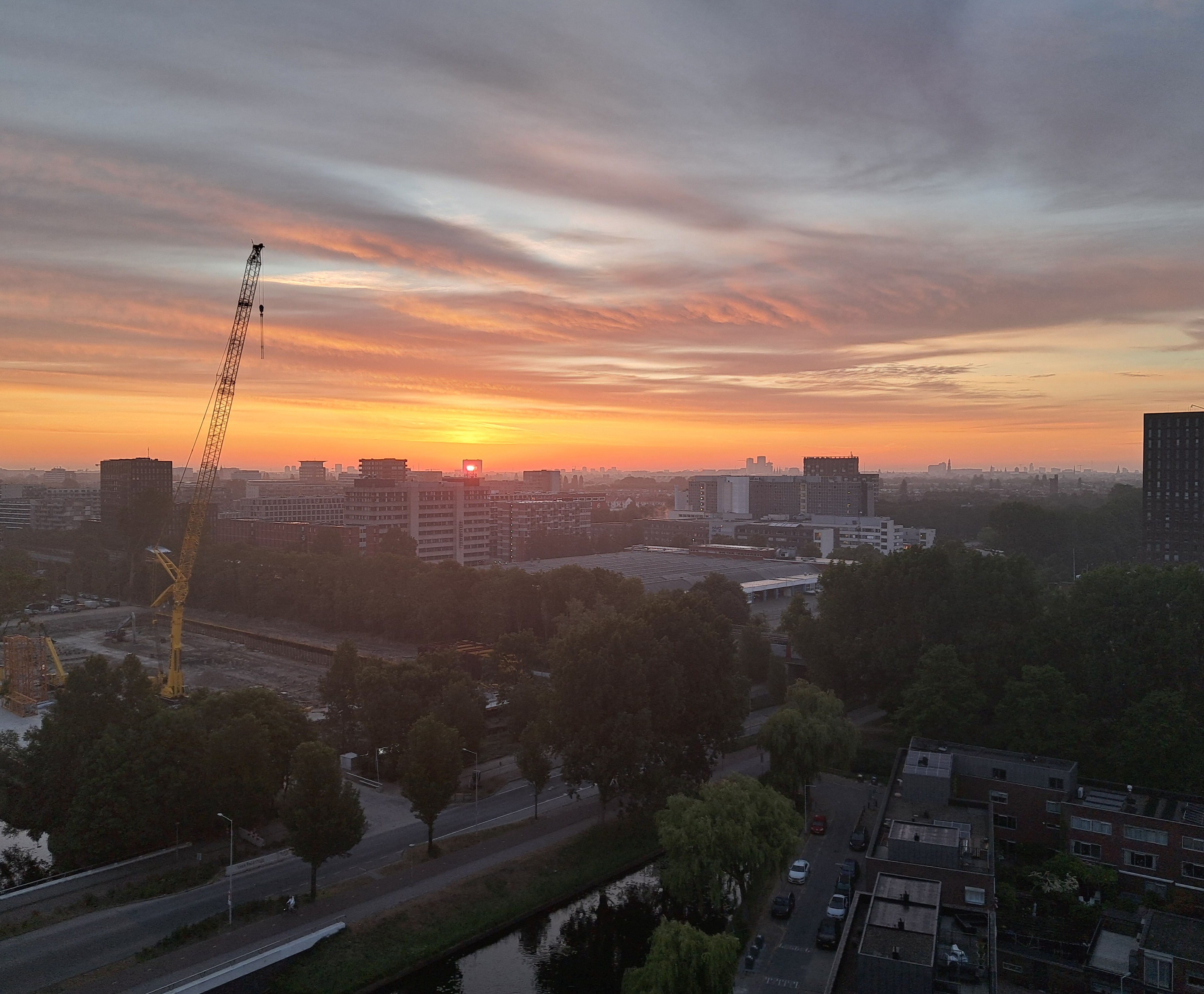 That was 5:21am on May 21st, as the sun was still moving further north; it passed back through this building on its way back south, about July 21. I was out of town then so I missed it. As I miss the sun almost entirely these days, since we’ve reached the period of the year where it doesn’t shine through on this north side of my apartment, but only for a short bit of the afternoon from my western and one southern window. Ah well. Below, you can see both how the building site across the street from me was progressing three weeks later, and how much farther the sun had moved north, by the 12th of June. I should remember to take a photo so you can see how far they’ve come on that construction – it’s moving fast.