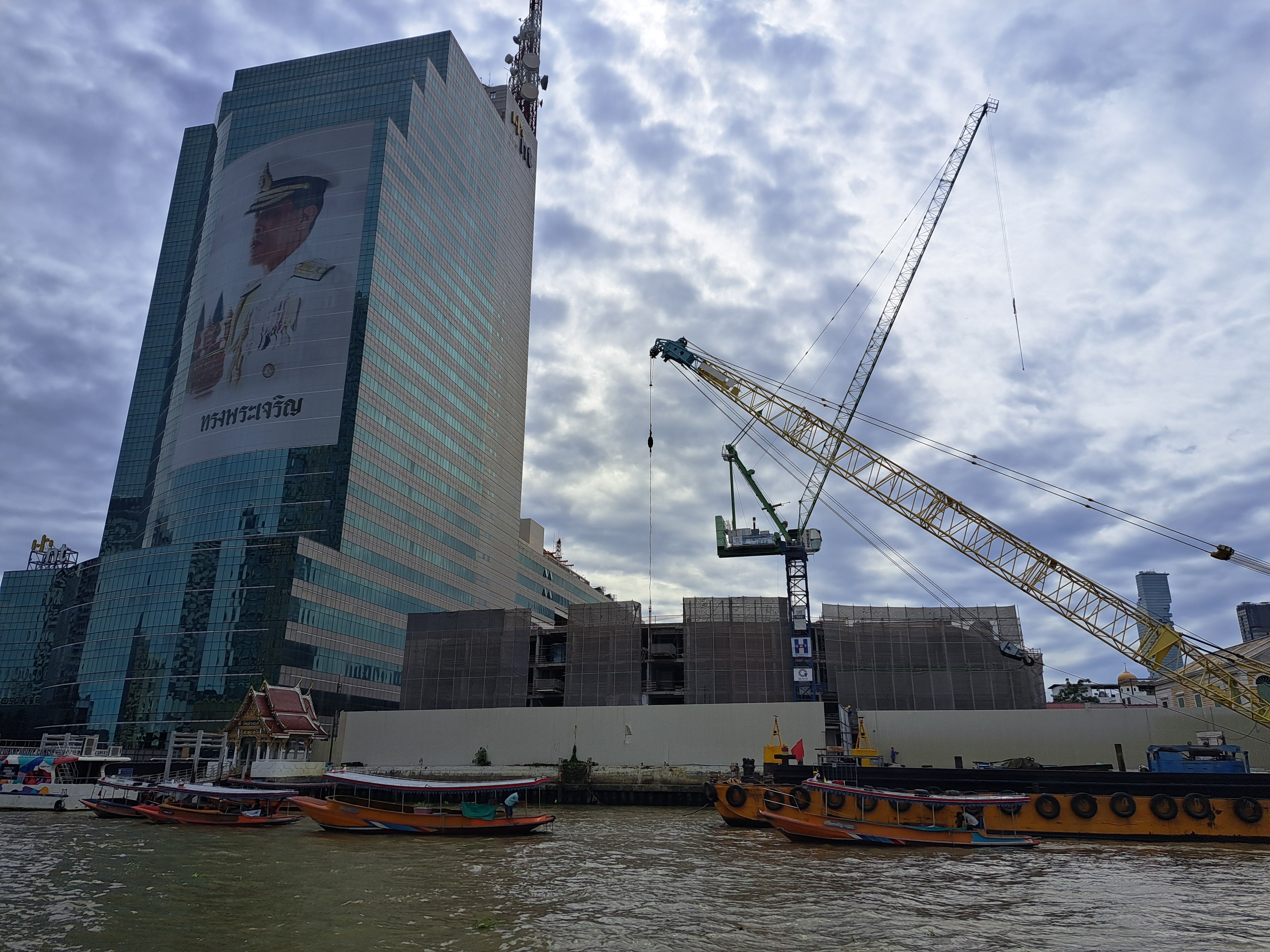 Above, the former King of Thailand in his youth as seen on the wall of a restaurant here in A’dam where I had dinner with an old friend last month. Below, his son the current King of Thailand as seen from my boat en route to Wat Arun :-).