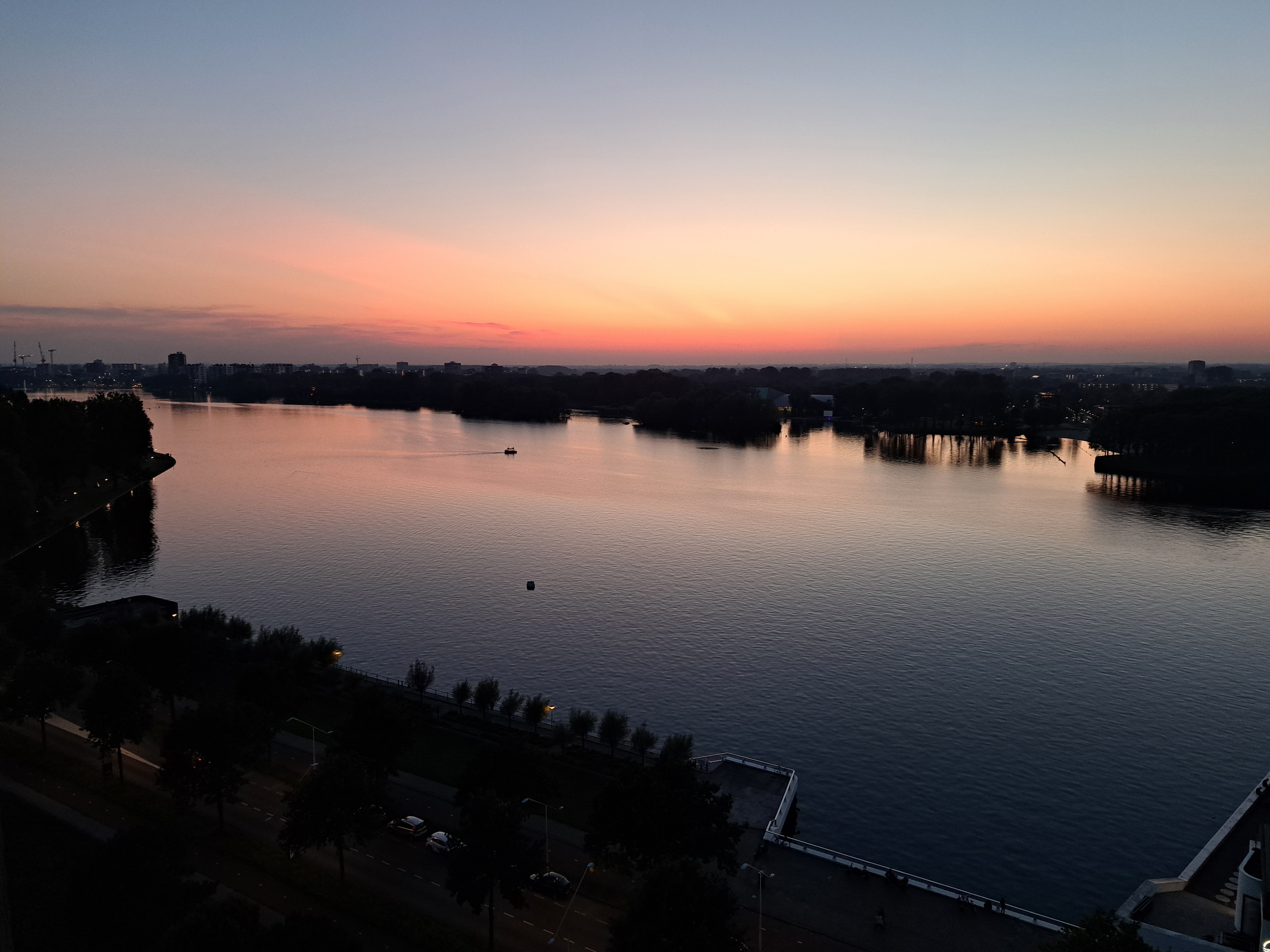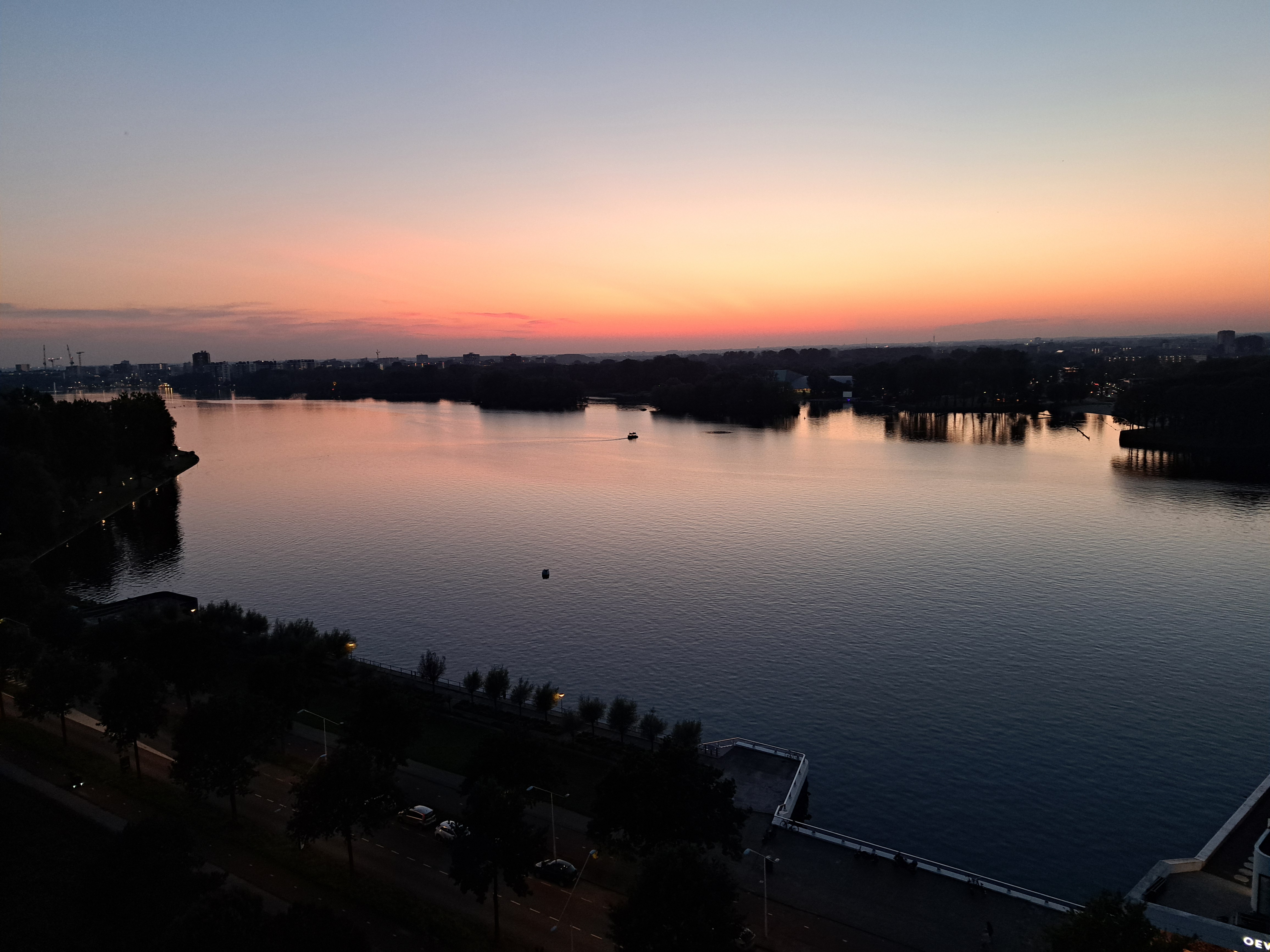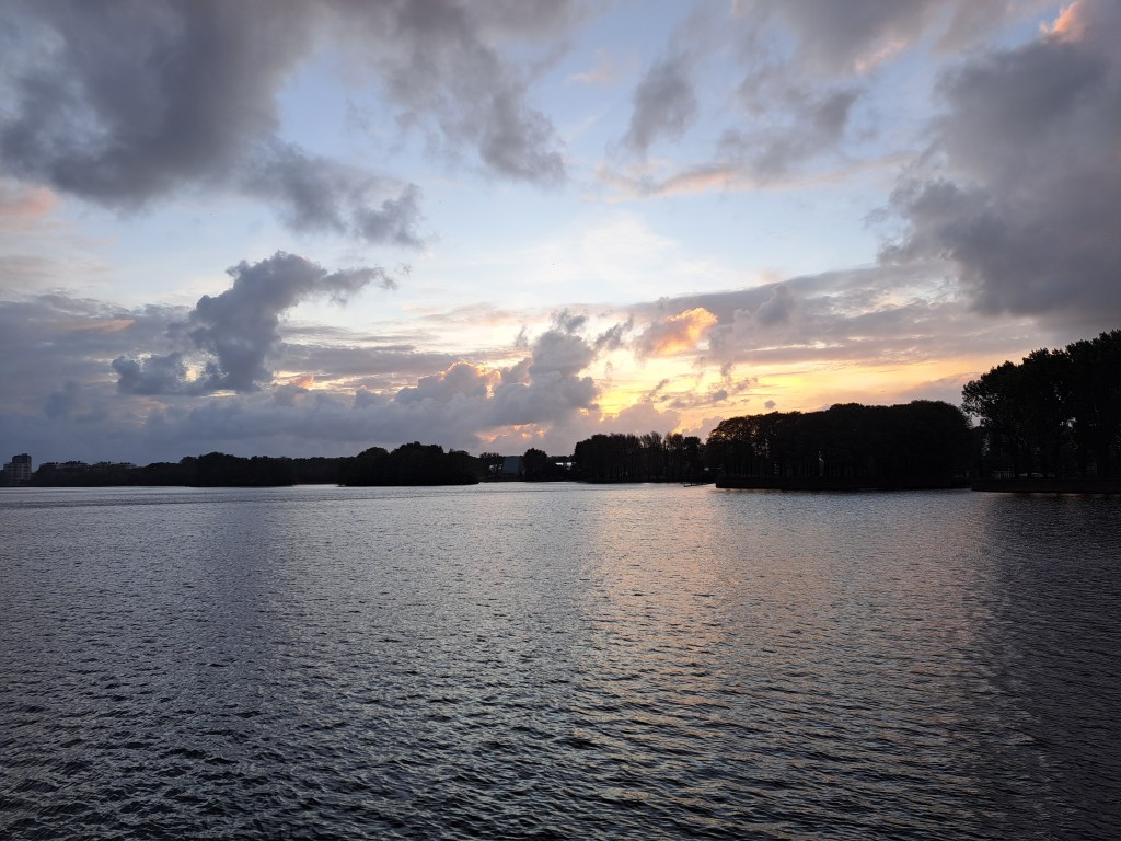 It took me a year but I’ve finally concluded that, yeah, I live by a lake now just like my brother does during his summers in Wisconsin – where this series had its genesis. (But just to be clear, it’s also part of the canal and water-management system, as is all fresh water in NL, aside from mud puddles in the street.) Above came near the end of my Friday-evening cirumnambulation of said lake (11,000 steps); compare the level of sunset at 19:18 on Friday the 27th to that at 20:00 in the other two from Saturday the 21st: ah, how the days shorten rapidly around the solstices! And the other was going to be part of a Signs of the City entry but it fits as nicely here. Yep, that’s my local swimming hole, unofficial though it may be.