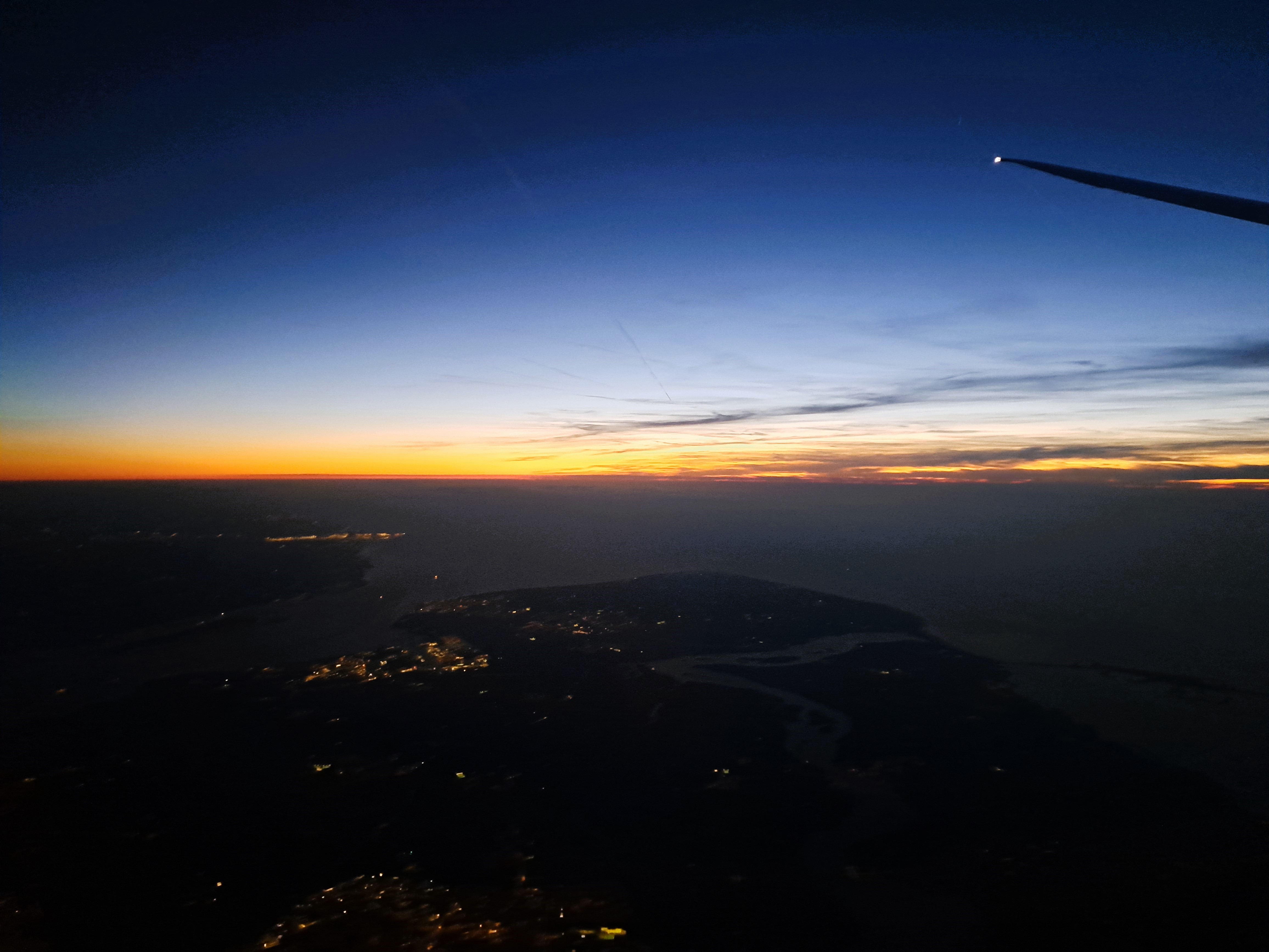 So after a very careful study of the map against this photo, I have concluded that I can at last legitimately add at least the category “Zeeland” to my blog, even though I’ve not yet been on the ground in Zeeland. (It’s now the only province in the Netherlands that I haven’t at least passed through in a train or car, and most I’ve now done some real activities such as overnights, culture, tennis, performances, museums, etc.) I’m confident that the land on the left is the beginning of Zeeland, as you head south, while the area on the far right under the wing-tip of the airplane is the end of Zuid Holland, just south of the port of Rotterdam which I showed you in a previous post from this flight back to A’dam from Geneva. If you also choose to study the map as I just did, you’ll no doubt agree that the image below, taken less than two minutes before the one above, shows the fingers of land just south, also in Zeeland – which, if you do study the map, you’ll notice is really a lot of peninsulas and islands between the various channels of water that represent the main end of what would be the delta of the Rhine, if the Dutch hadn’t been engineering it for centuries.