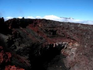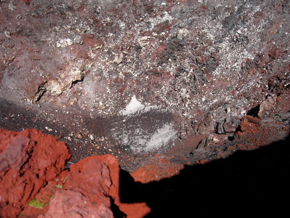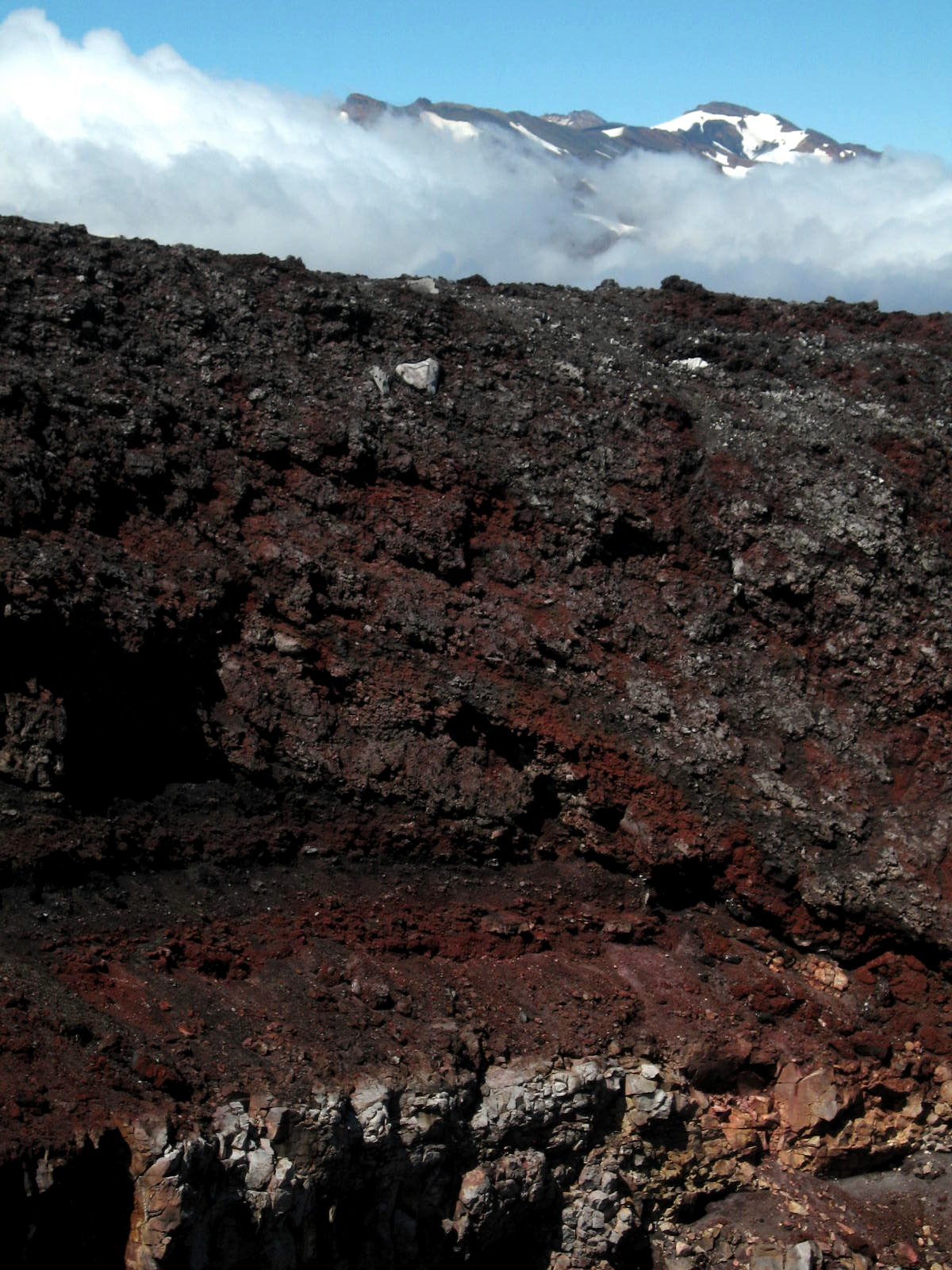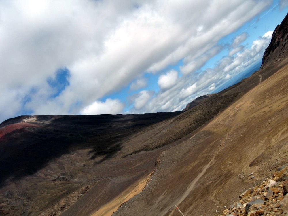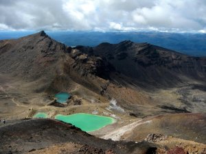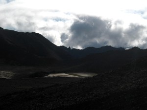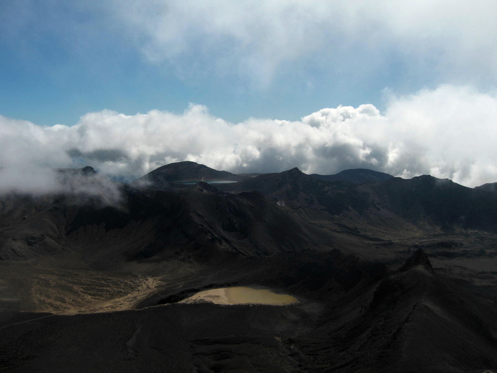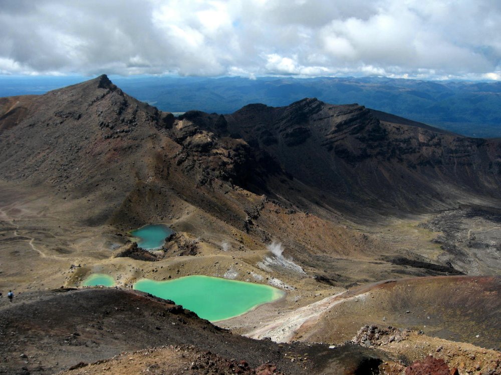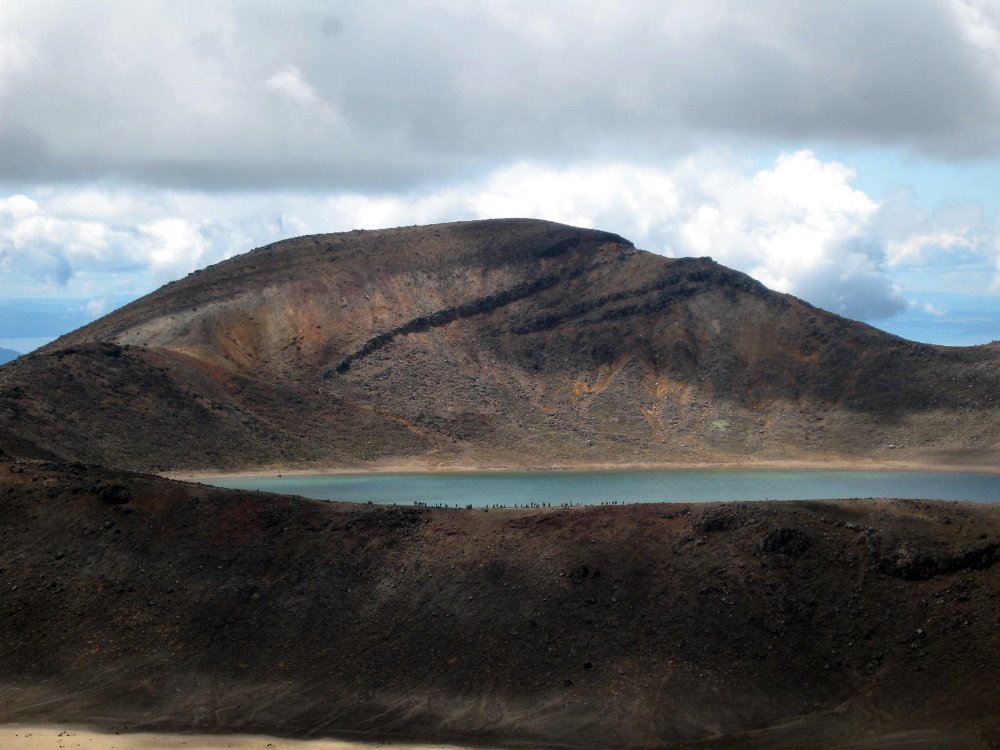 That there is looking down into the actual crater, from the summit. The text I wrote above is really about what I did on the rainy day before I did the official “Tongariro Crossing,” which is an almost 20km day hike almost all above tree line that goes from the west side of Mt Ngauruhoe up and over to the north side of Mt Tongariro; to clarify: Ruapehu, at about 2800m, is the southernmost, most active, and most snow-covered of the mountains; Ngauruhoe, at about 2200m, is in the middle and the most obviously volcanic, seen from a distance; and Tongariro, after which the whole park is named, is at about 1800m the shortest of the three but very large with several active craters over and around which we walked, and is the northernmost of the three.