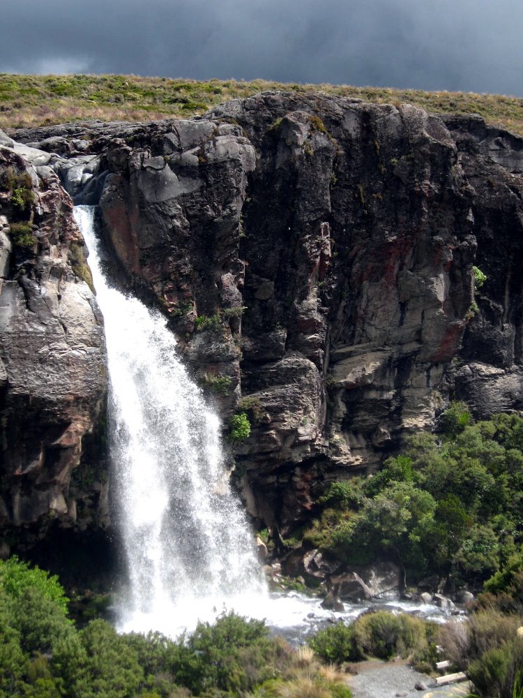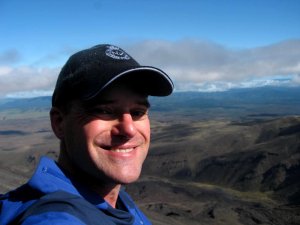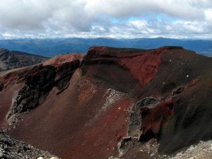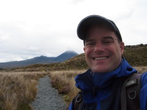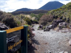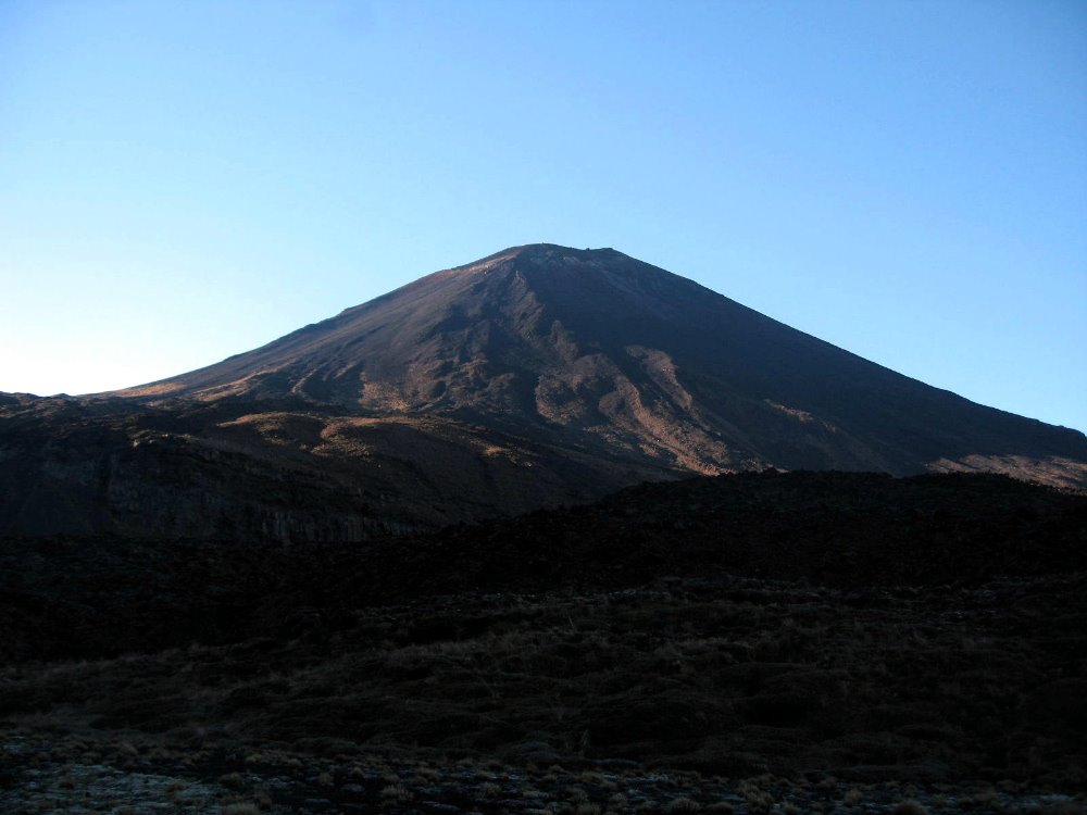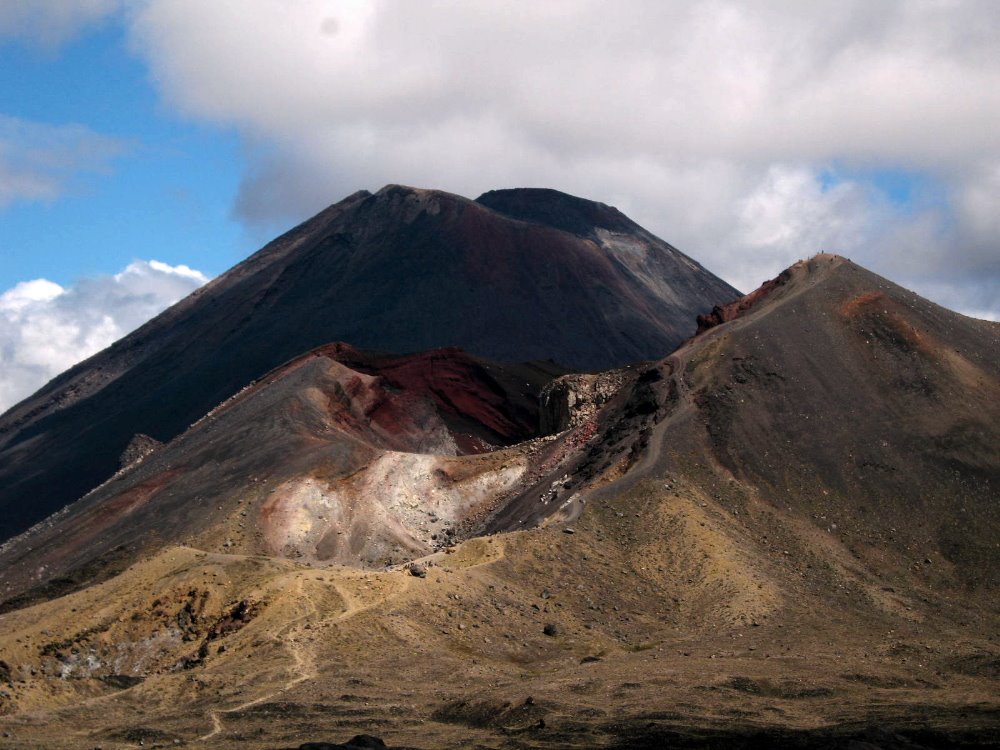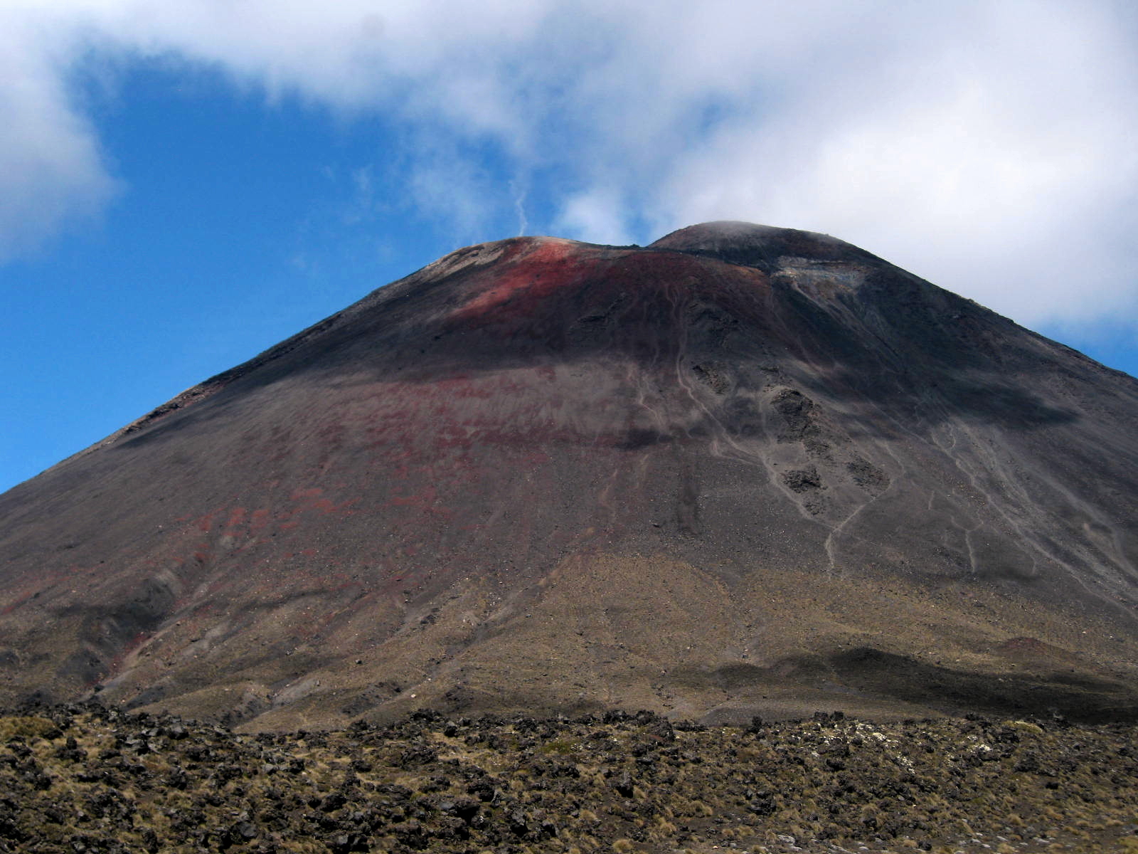Of the three active volcanoes in Tongariro National Park, Ngauruhoe is the second highest but by far the most classically-proportioned. It’s a pretty imposing sight, isn’t it? Imagine seeing it as I did: Climbing up a ridgeline from a bright-yellow stream (made yellow by all the minerals in the water, like at Yellowstone), suddenly at the top of the ridgeline I can look across a sparse scrubland of alpine plants to the towering even cone of Ngauruhoe, whose summit and cone are shrouded in cloud. Hearing the rotors of a helicopter clack-clacking away to my right, seemingly on the snowy slopes of tallest Mt Ruapehu, I look over and see that the helicopter is trailing some kind of long flat payload from a cable hanging below it. Has someone been evacuated after a fall while climbing to the 2800-meter summit of Ruapehu? Or is it something more mundane, like logs being dropped somewhere for trail maintenance? Then I look again ahead of me at the summit of Mt. Doom, no Orodruin, no Ngauruhoe (yes: a digitally-altered image of Ngauruhoe was indeed the image of Mt Doom/Orodruin the Lord of the Rings movies – small wonder, huh, seeing it in real life here!), and…wait a minute, the cloud has cleared a bit, but isn’t that a small trail of steam rising directly up out of the cone? Is that helicopter, perhaps, part of some general evacuation? Is all hell about to break loose with flowing lava and an explosion on the summit of one or all of these volcanoes? 🙂