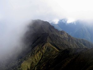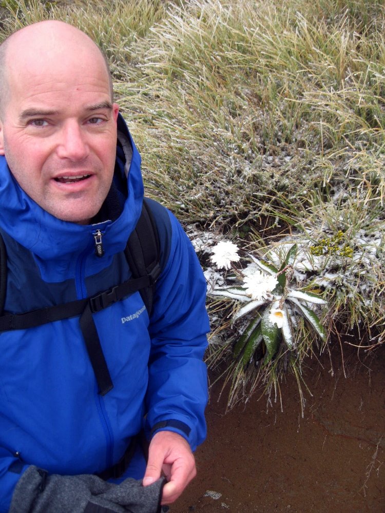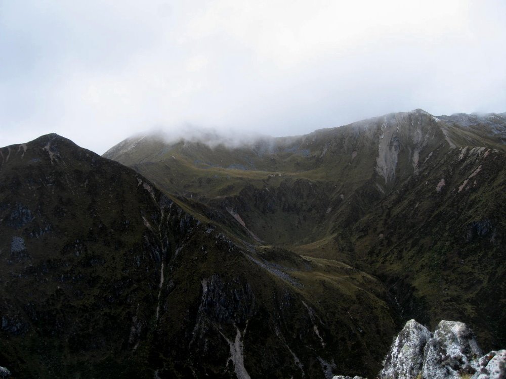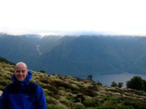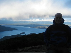 Above and below, clearly the same view (south arm meets main body of Lake Te Anau, looking across from Mt Luxmore toward the Te Anau town side) and shot almost the same time but with very different fog or cloud cover, when Howard & I took a break from our card game with some of the folks at the hut to check out the apparent break in the clouds and nice sunset views. Throughout the day and a half or so of alpine (above tree line) crossing on this track, we’d have periods where dense clouds and fogs or snows would suddenly part to allow a glorious glimpse of just amazingly beautiful vistas on all sides…and we’d all rush our cameras out, knowing that soon it would be fogged over like the shot of me at the summit of Mt Luxmore, a few down from here.