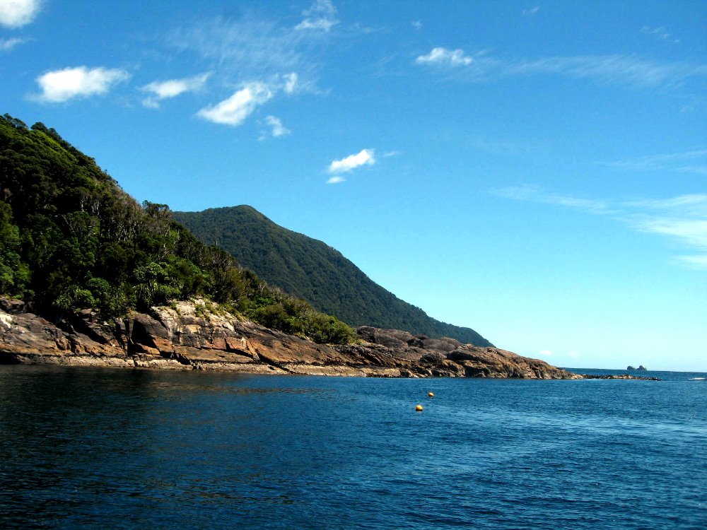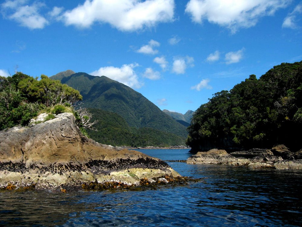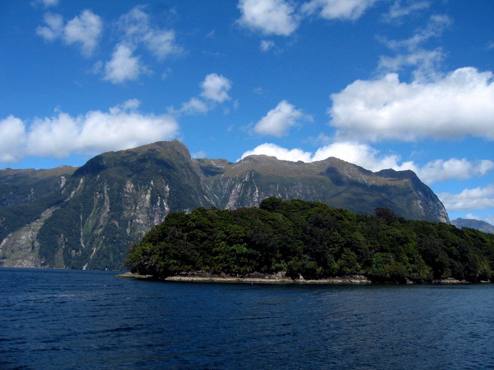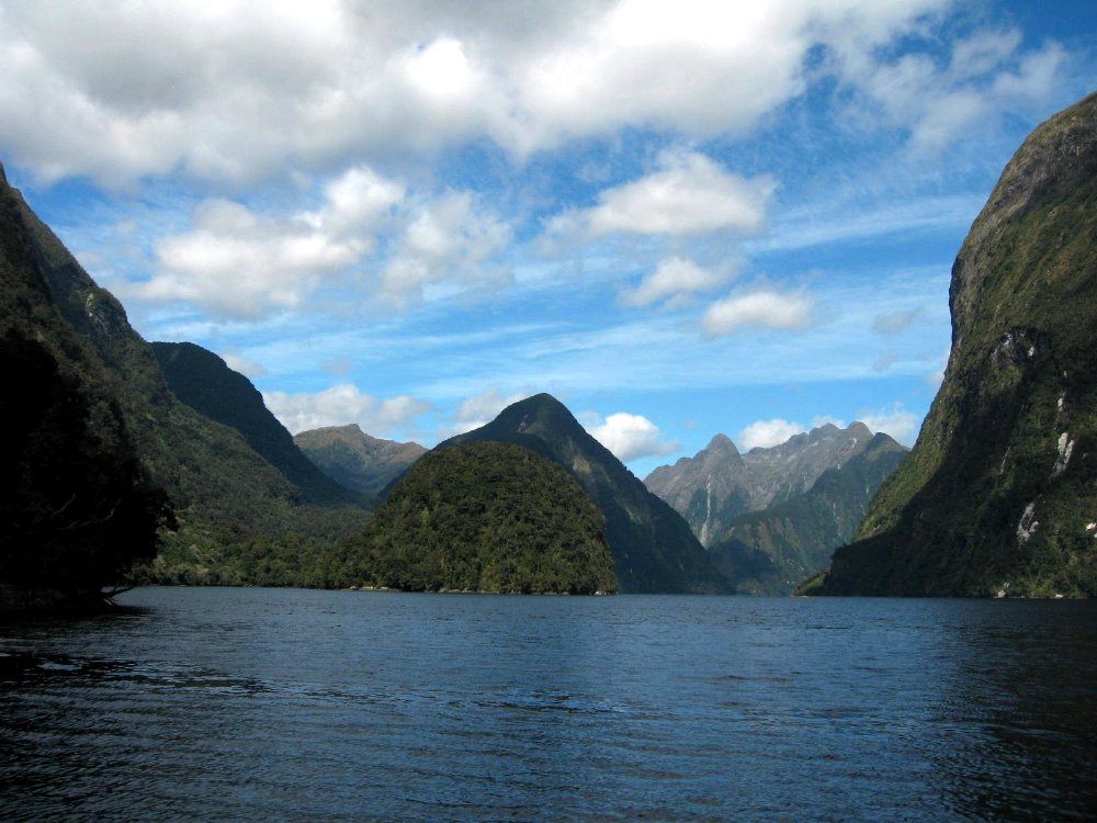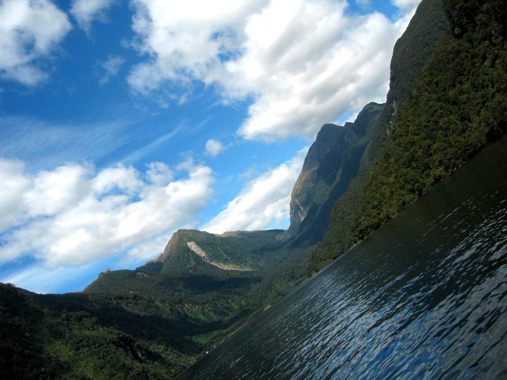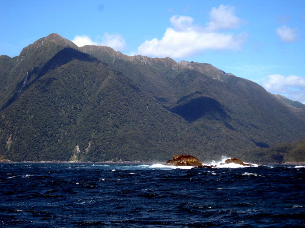 Doubtful Sound is so named because James Cook, when he first encountered it, doubted he could navigate his ship both in and out safely, past the swells and rocks at the ocean entrance to this very long and stunning fiord. (Our guide said that technically a sound is one thing, but this is a fiord, which is another thing, only when they named it the English language hadn’t yet adopted the term fiord.) Above, you see the inland-most end of the Sound, called Deep Cove, from Wilmot Pass; and you see Wilmot Pass from the Sound. East of Wimot pass is the west arm of Lake Manapouri, which you’ve already seen in my shots taken on the easternmost bay of Lake Manapouri, where the last night’s hut of the Kepler Track was located. I thought that was remote — and it was. But Doubtful Sound is across that lake, up and over a 4WD-0nly, unsealed (that means dirt, to Americans) road and back down to this awfully beatiful and very remote corner of the world. There is so much rain in this area (the figures boggled my mind: Te Anau sees something like 2, 3 or 4 meters a year [yes, they measure in meters! not centimeters], while this west side of the mountains can easily see NINE meters in a year!), running off all these incredibly steep mountains and down to the sound; and the sound, though definitely tidal and connected to the Tasman Sea, is protected enough by its narrow entrance from the churning tides of the open ocean, that the entire sound is covered, full time, by a deep layer of actually FRESH water — a meter or more, which – being lighter than salt water – floats above the surface of the sea water below it. The Sound is very deep so there’s tons of salt water there, but the surface is all fresh, it seems, and ocean animals often come in here to clean off since apparently fresh water is cleaner than saltwater, and helps kill things like barnacles. But I’m no marine biologist, I’m just reporting what I heard, and it all stuck me as new and fascinating.