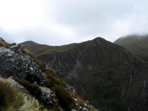 In the fiordland area, with all that rain, one has occasional tree-slides: when the thin ground cover gets so wet it just all slides down those steep slopes, leaving the solid rock face exposed, as above.