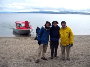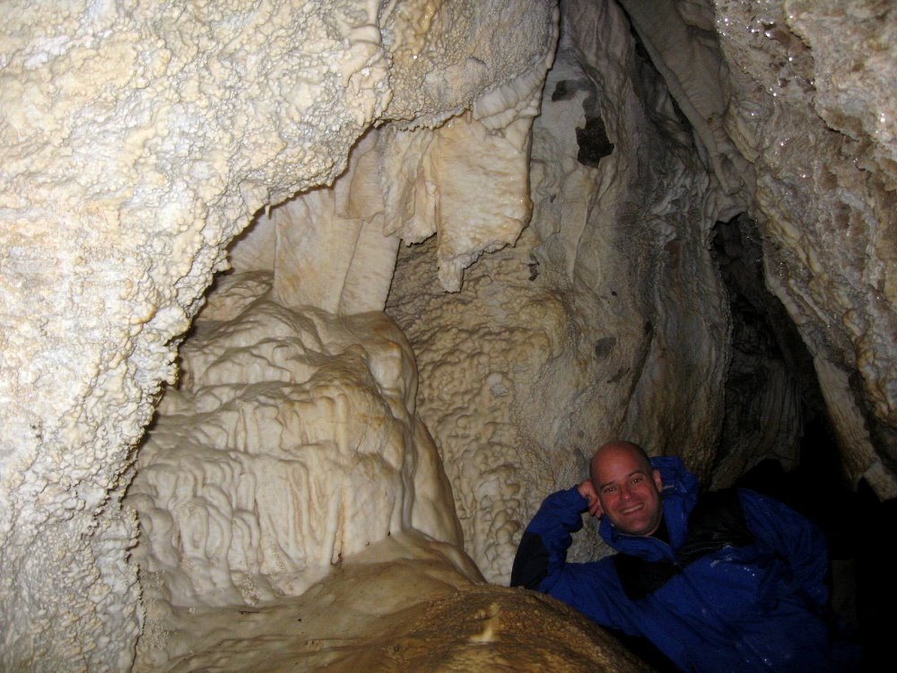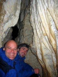 A ridge or two down from the summit of Mt Luxmore — which is only at about 1500m or so, not really that high, but it’s well above the tree line at this southern latitude — is a large system of caves which we explored along with two nice guys we met in the hut, Jamie (aka Luther, with me above, a mighty fine bass player also I might add) and Bob. The Luxmore Hut is situated on a ridge above the tree line, surrounded by small alpine ponds and stunning views over the lake and the Murchison Range to the north. I’m nearly certain this shot below captures the ridge on which Luxmore Hut sits, if you look at the tallest notch (that being summit of Mt Luxmore, where I’m photographed in snowy fog a few shots down) and just come down a bit. I took it from a boat on the lake the night after I finshed the track.