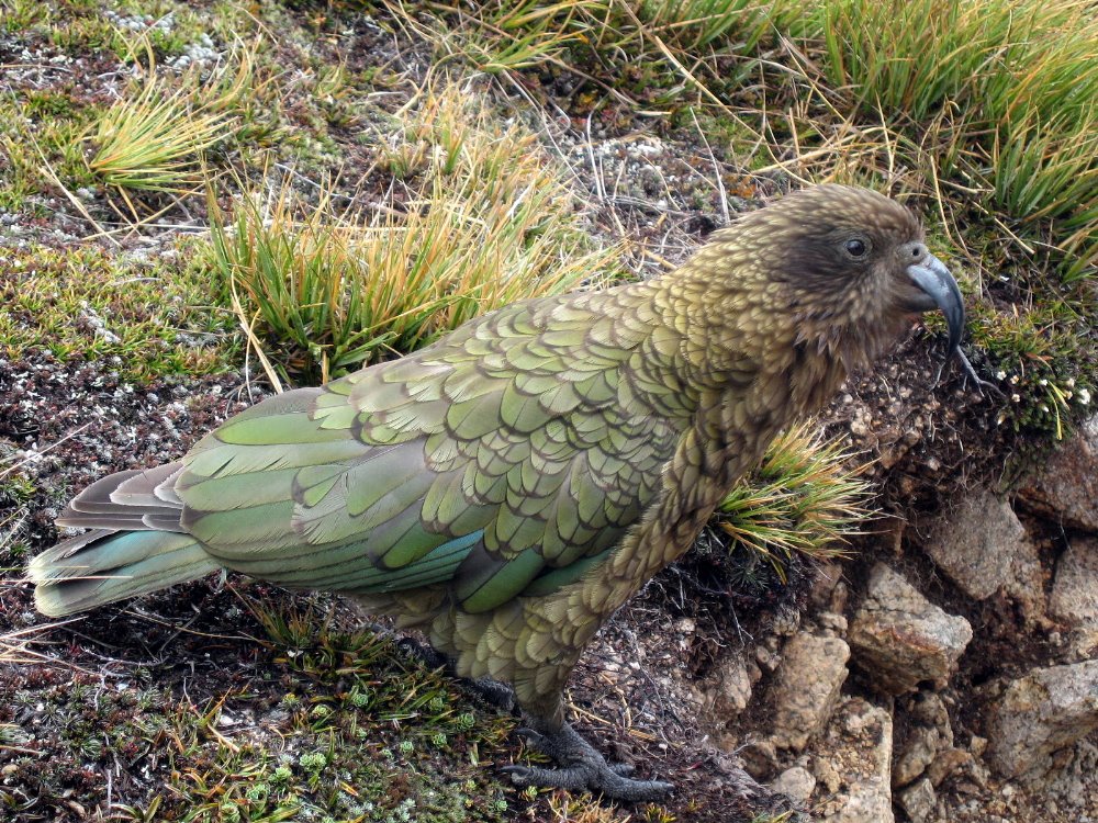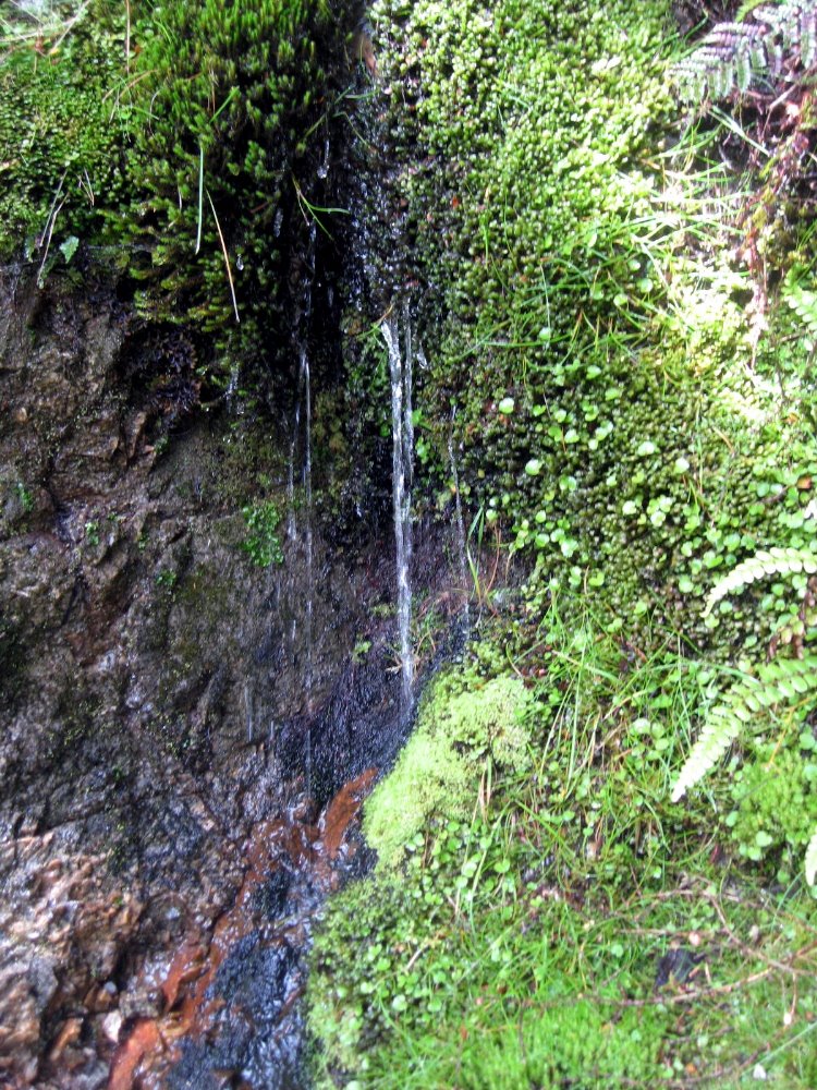 As you’ve seen, this track includes strolls through lovely verdant valleys and clambers along dramatic alpine ridgelines with sharp, breathtaking drops on either side. Since it’s quite far south and in an area of rapidly changing weather, small changes in exposure (the south face is the colder, darker side down here) or elevation can lead to radical changes in vegetation and micro-climate. Below, a small green mossy trickle on a hillside barely a hundred meters below the treeless alpine zone that, when I crossed it, was characterized by icy plants — and yes, these shots were taken within less than an hour of each other but at different elevations. That bird up there is one of the world’s few alpine parrots, the Kea: NOT people-shy and rather mischief-prone if one’s careless enough to leave a backpack lying around; and as you can imagine that beak is sharp. Mercifully I only heard stories and didn’t directly experience a Kea raid on my own pack.