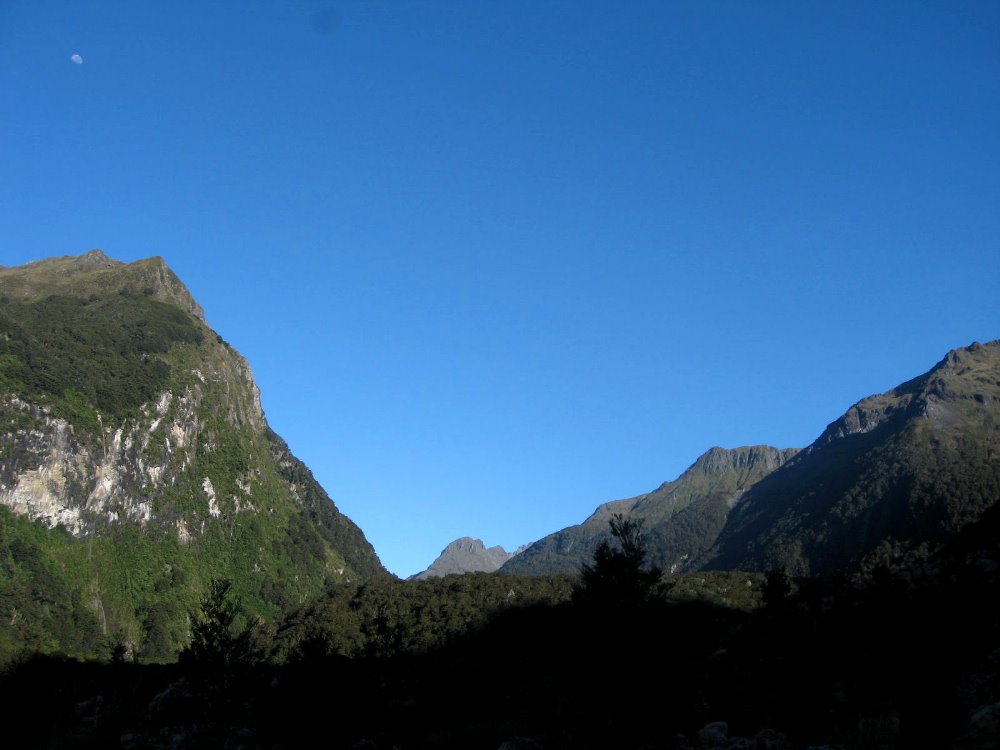 But allow me to say this, of the Milford Track: it is indescribably wet. We hiked it in the midst of the southern summer, during peak season. Peak season is also, strangely, the rainiest season; but even the driest season has plenty of rain. And the drier winter season is, we were told, the season of such landslides as the one just below where you see the trail marker placed to navigate walkers across the rubble field. I can imagine that a mostly-dry hike over this trail would be an unbelievably great experience. And I can certainly attest the truth of that oft-quoted adage that rain makes waterfalls, which are the joy of the trail. But can I just say that my own brain can only really appreciate xx-many waterfalls, and after a certain point both my feet and my soul wish to be dry, warm and comfortable again? So I ended this trail – which, indeed, gave me more spectacular scenery than most other hikes I’ve done – with the sense that it won’t likely call to me again…whereas the Abel Tasman, for all its comparatively mundane (hah!) scenery, is one I’d readily return to again and again – in part because it’s just so much more warm and comfortable as a hiking experience. (Even the Kepler, another Great Walk within the extraordinary Fiordland National Park, showcases a wider range of terrain with a lower preponderance of heavily rainy days — witness this post: https://somuchworldsolittletime.wordpress.com/2009/03/05/kepler-track-fiordland-national-park/