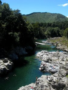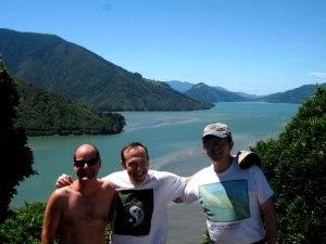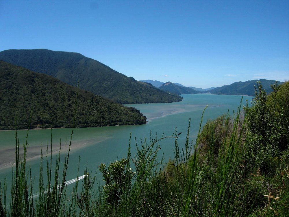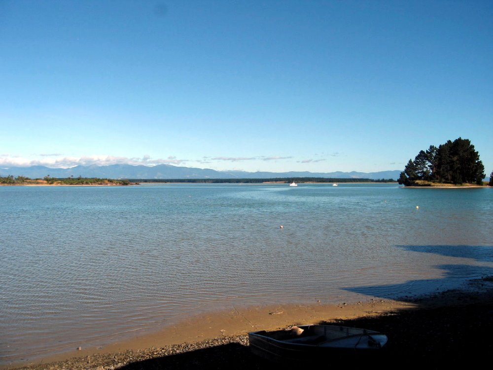 At the north end of South Island is a region called Marlborough. It’s New Zealand’s main (of several, for such a small country) wine-growing region, and home to Picton (a little town where the ferries from North Island arrive), and Nelson — to which Howard, Gene & I flew after regaining our bearings with a day or two in Auckland and a walk on Rangitoto Island (below — I’m messing with your minds if you’re trying to follow my itinerary here; I’m putting up regional segments based entirely on how visually appealing they are and how important they were to my experience in NZ…deal…). Nelson is just south and east of Abel Tasman National Park, for which we sadly did not have time; I’ve included, below, a few shots of what I think are the mountains from that beautiful area, as seen from our overnight hub of Monaco, on the Western edge of Nelson. I have included some of the nicest shots of vineyards around Nelson and Blenheim, a swimming spot along the Pelorus River (which, Wikipedia tells me, is known for its ‘magnificent’ river swimming – but we didn’t know that when we crossed the bridge in our rental car and decided we just HAD to join the folks at that swimming hole), as well as some shots of both the Pelorus and the Queen Charlotte Sound, which are among the Marlborough Sounds — yet another amazingly beautiful region on the northeastern corner of South Island, near Picton where those ferries from Wellington dock.