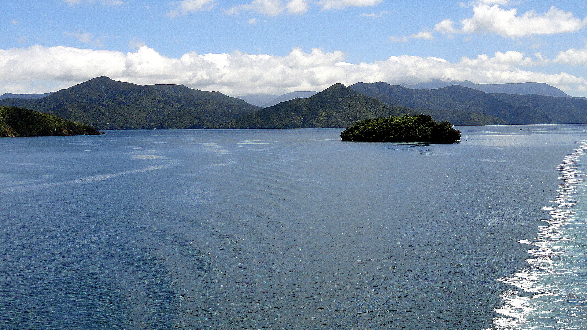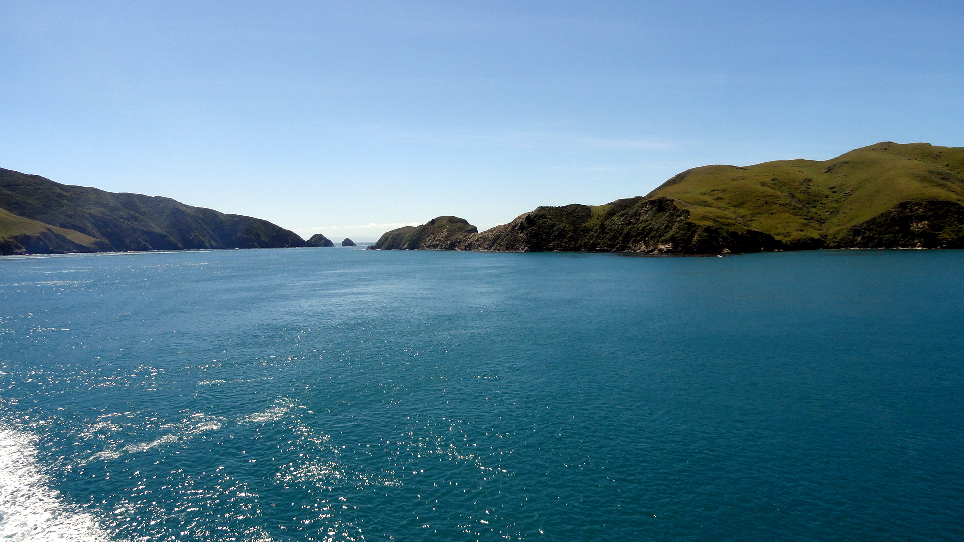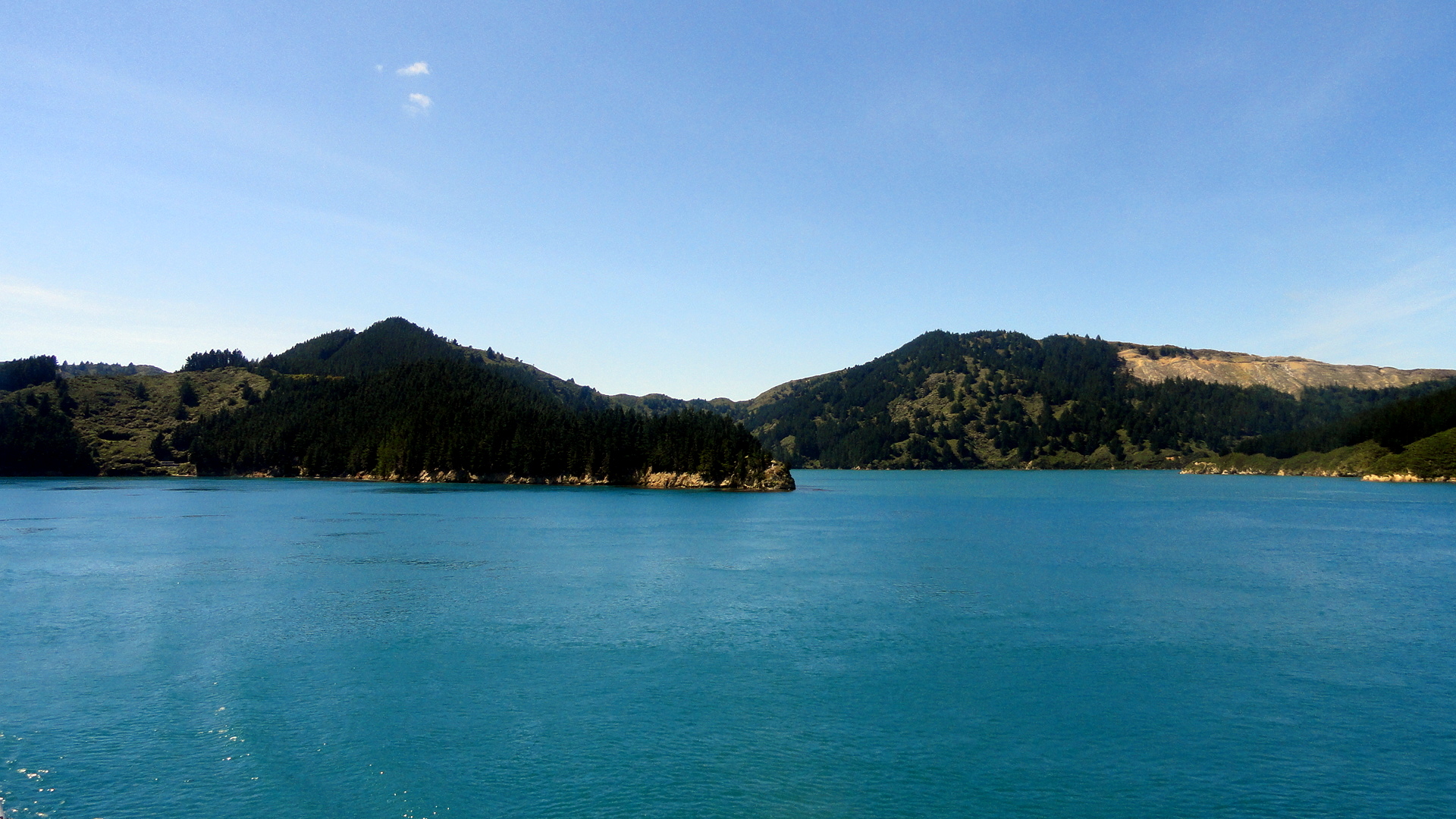 And here some shots again of the Cook Strait as we departed South Island and headed back to North Island: below, Picton Harbor from on board; and a few shots below the exit from Tory Channel into Cook Strait with North Island in the distance; and further down a panorama shot in which you see both North and South Islands from the boat in Cook Strait.