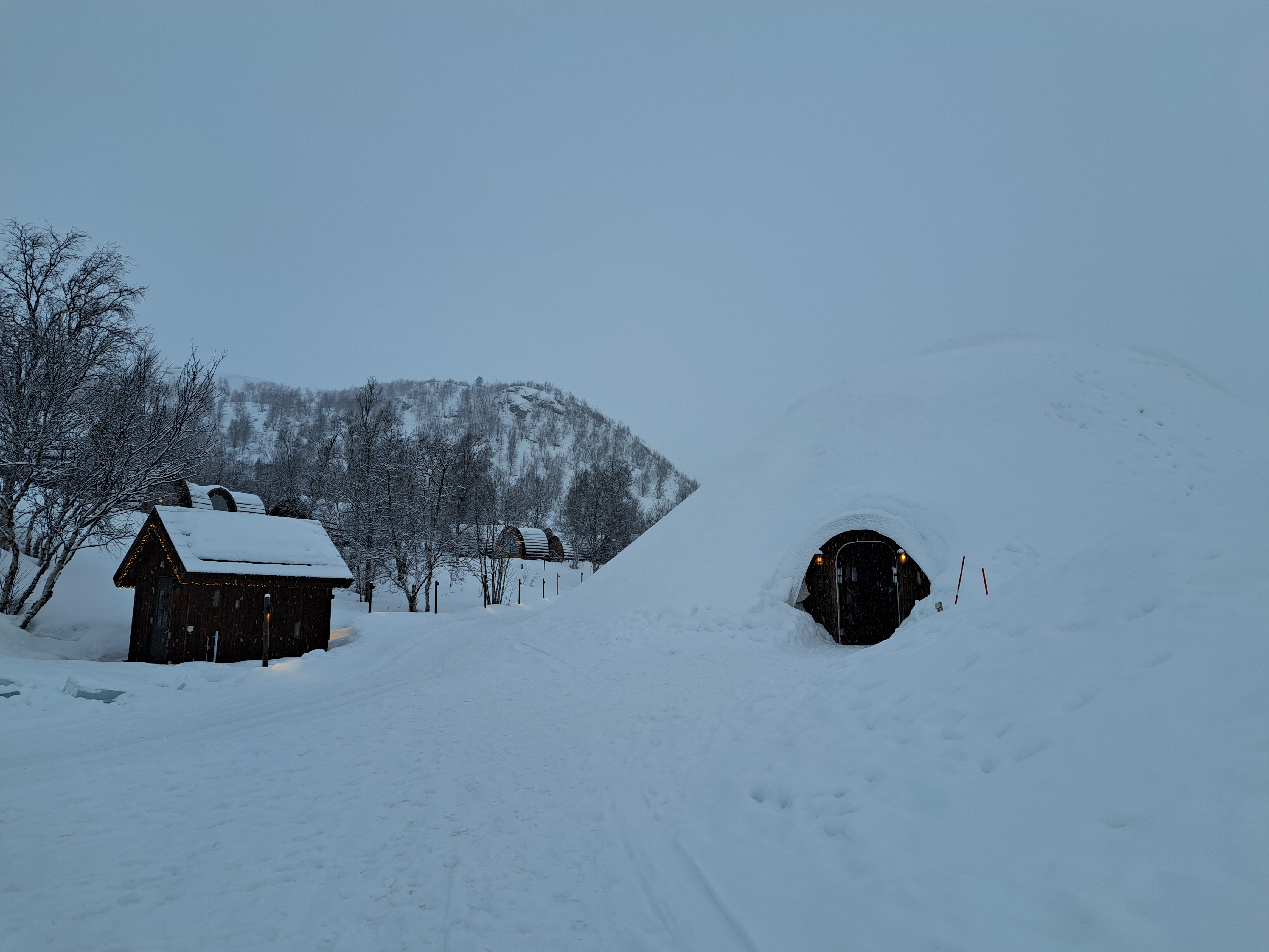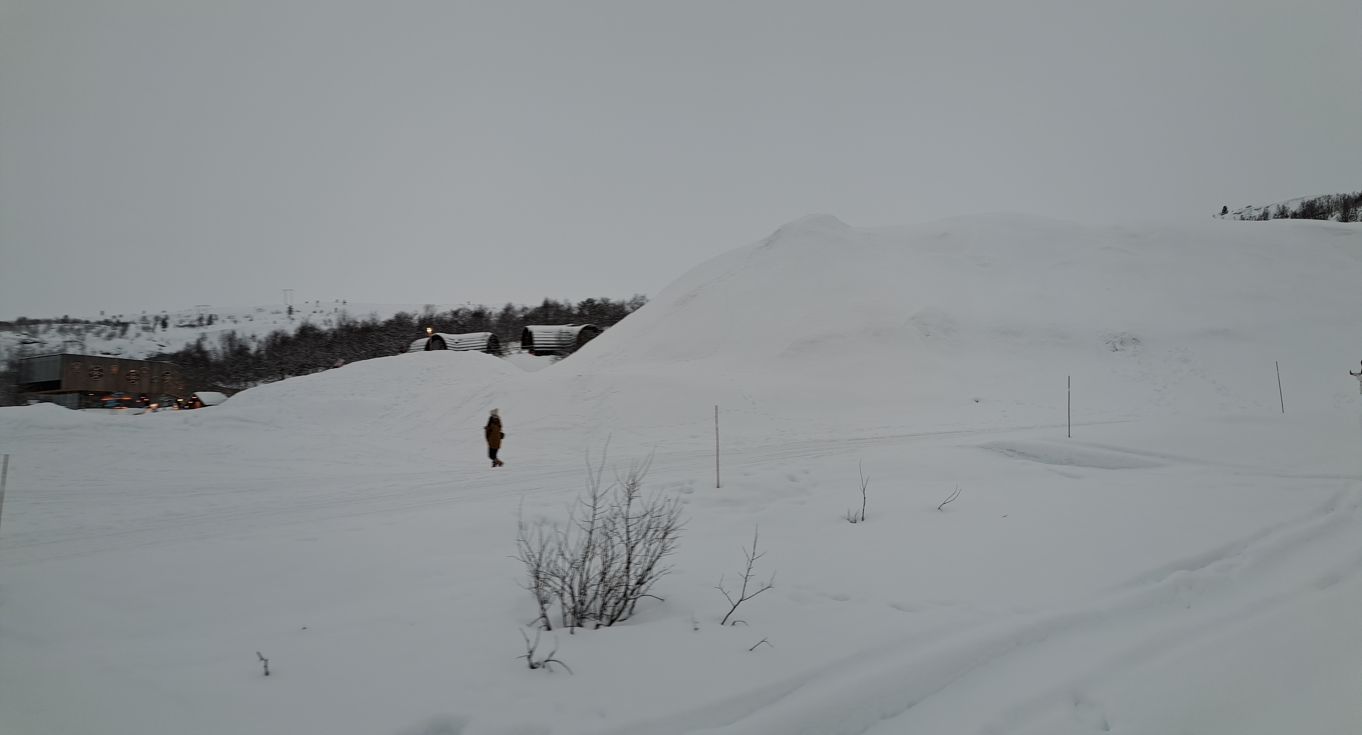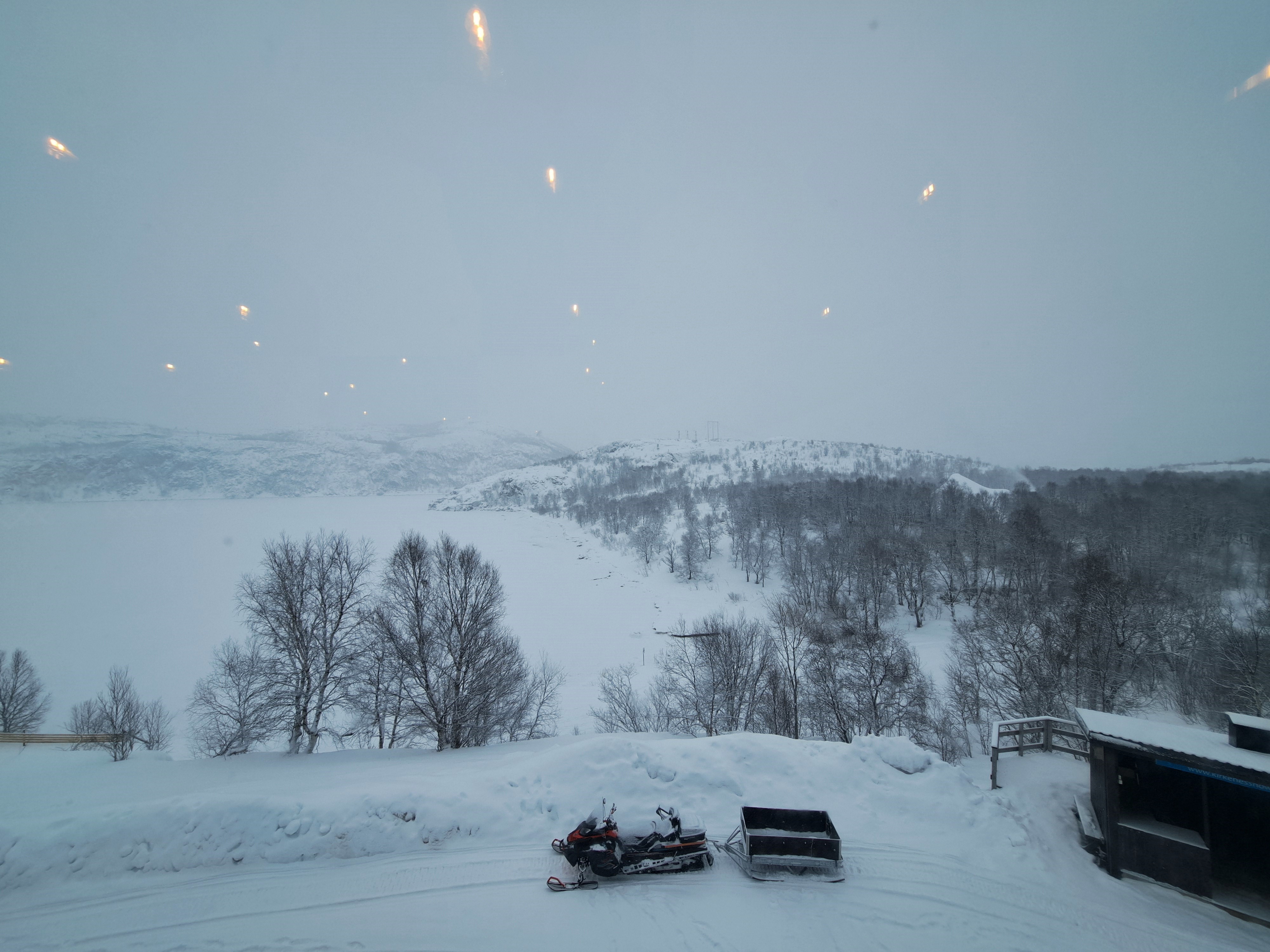 Last snowy-landscape shots from the Snowhotel Kirkenes, in Norway’s Finnmark county. Above, we’re looking out from the lovely big windows in the dining room over the frozen, snow-covered fjord that runs south from the harbor, on which we also did our King Crab outing that day. At the bottom of this post, for those interested, is a panorama of the compound in which you can see, at the far left, a conical-roofed cafe building which is next the sled dog kennels (shared in our prior post from Kirkenes), then the larger modern glass & brick structure that houses check-in and tour-group visits (tour groups do short trips for the King Crab, Husky Sled Dogs, etc.), then the heated modern lodge hotel building with rounded roofs up the hill from left to right, then the large bulk of the actual frozen Snowhotel itself (where we slept on our ice beds), and at the far right the building with restaurant, sauna, changing and warming lounge reserved for overnight snowhotel guests.