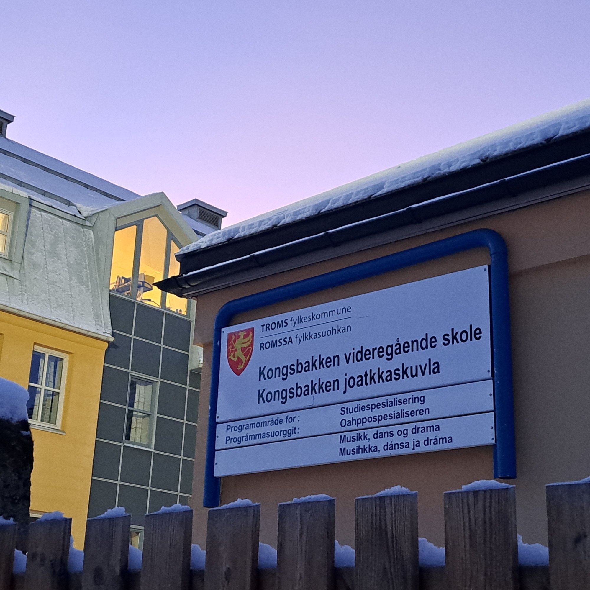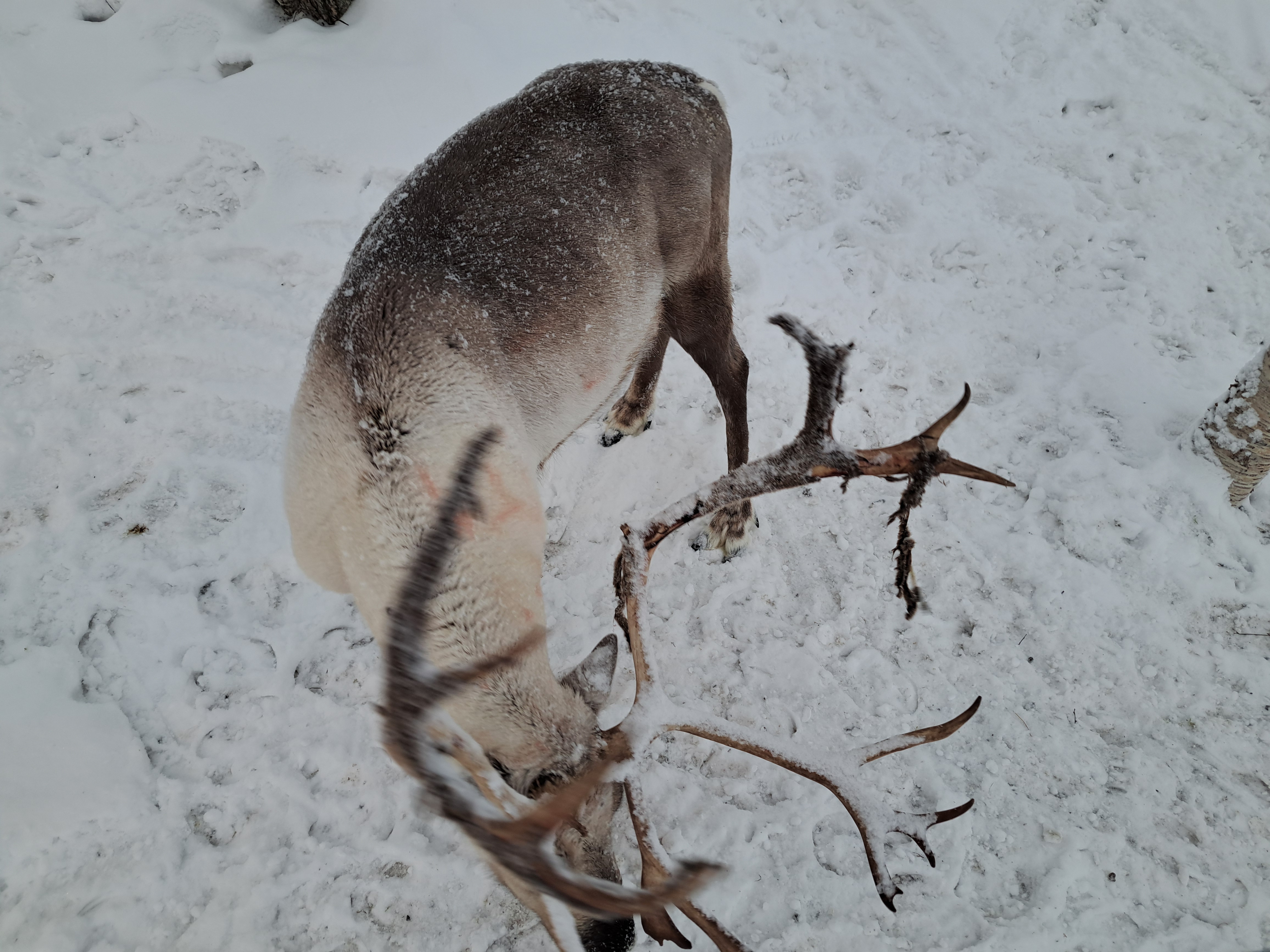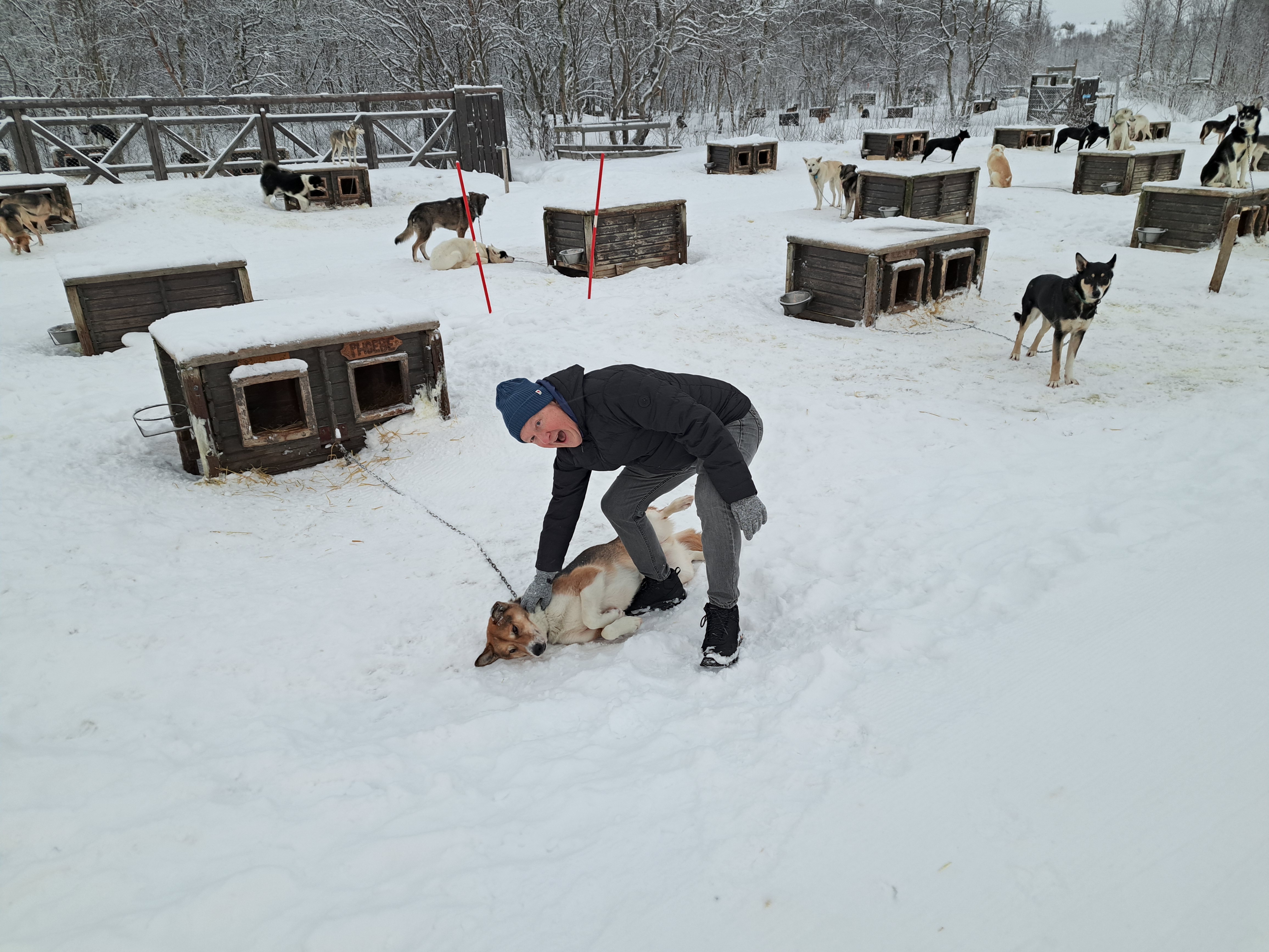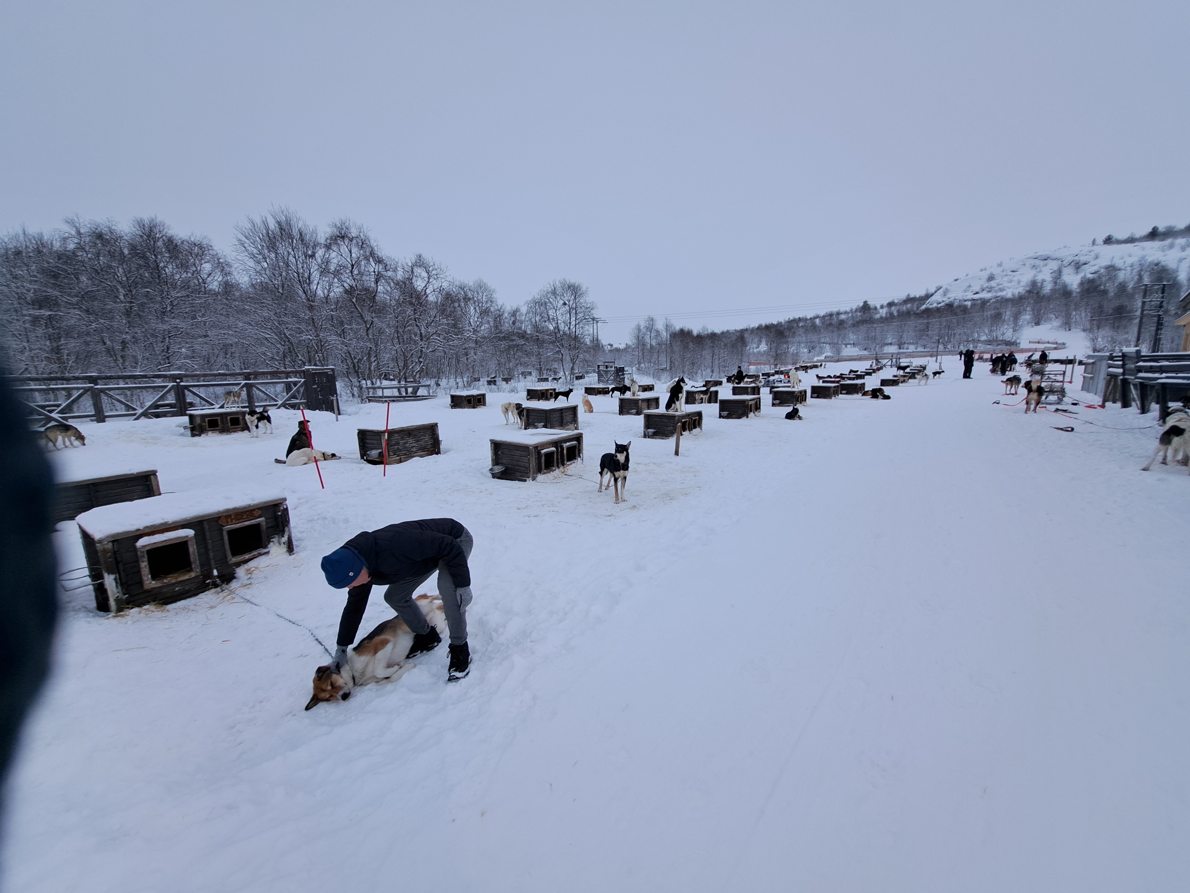 Last snowy-landscape shots from the Snowhotel Kirkenes, in Norway’s Finnmark county. Above, we’re looking out from the lovely big windows in the dining room over the frozen, snow-covered fjord that runs south from the harbor, on which we also did our King Crab outing that day. At the bottom of this post, for those interested, is a panorama of the compound in which you can see, at the far left, a conical-roofed cafe building which is next the sled dog kennels (shared in our prior post from Kirkenes), then the larger modern glass & brick structure that houses check-in and tour-group visits (tour groups do short trips for the King Crab, Husky Sled Dogs, etc.), then the heated modern lodge hotel building with rounded roofs up the hill from left to right, then the large bulk of the actual frozen Snowhotel itself (where we slept on our ice beds), and at the far right the building with restaurant, sauna, changing and warming lounge reserved for overnight snowhotel guests.