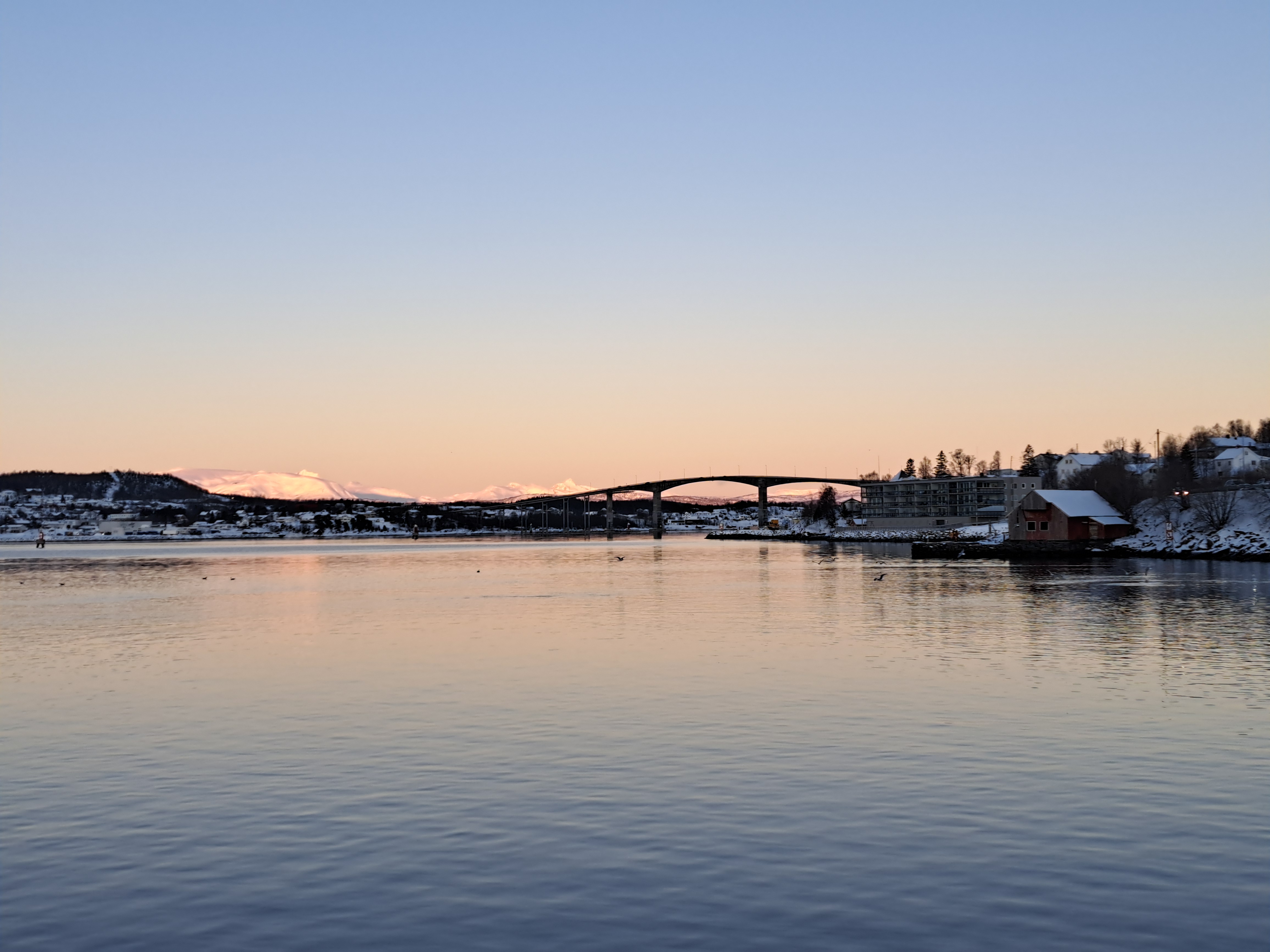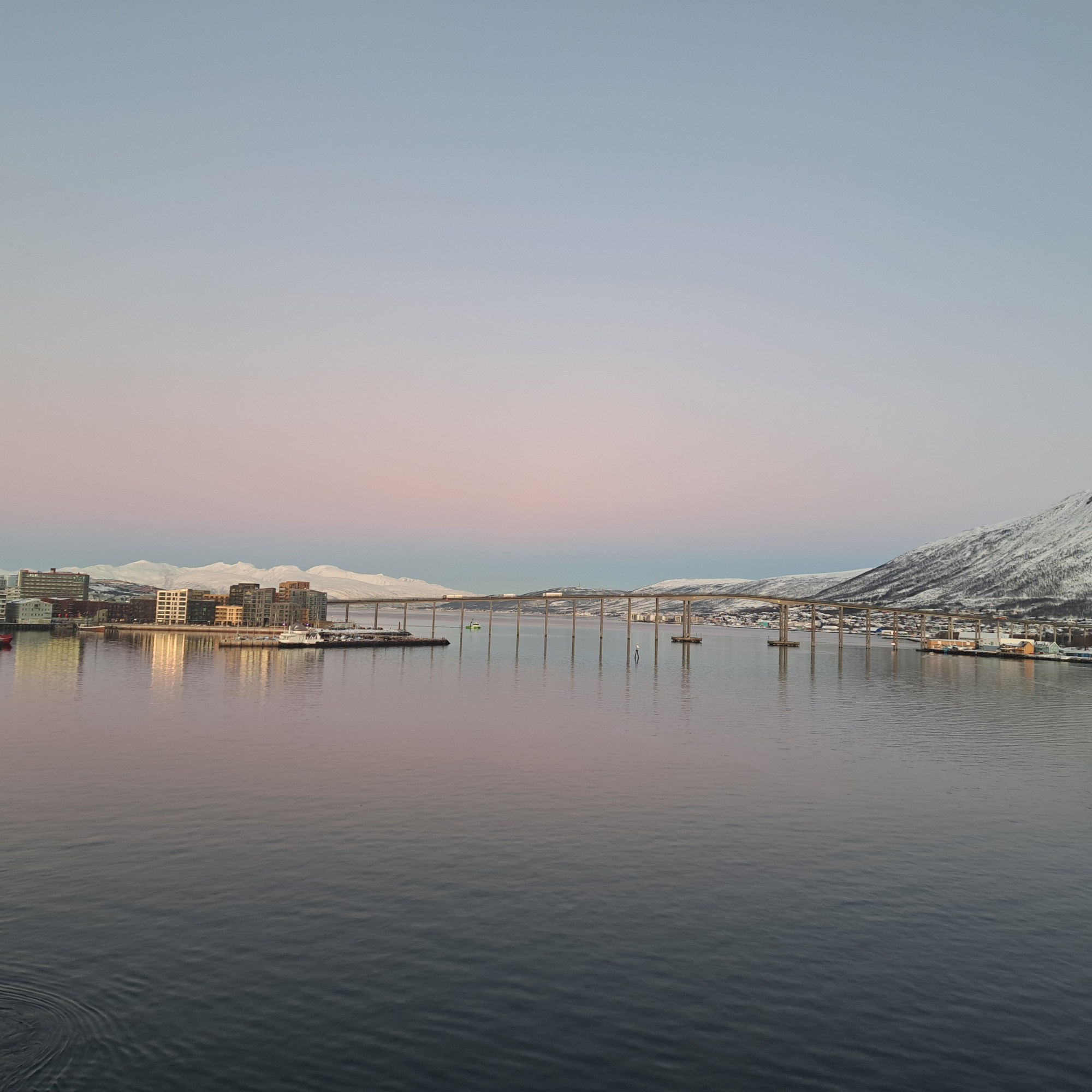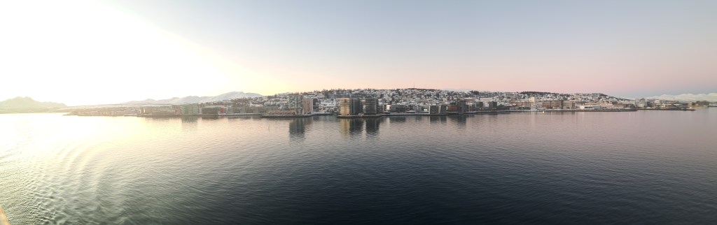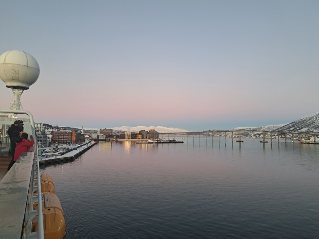 The main city center of Tromsø is actually on the island of Tromsøya (Romssasuolu in the Northern Sami dialect of its first nation inhabitants). In the photo above, the island and thus main city center is to the left, taken as we pulled into the port. Leaving, a few hours later, we passed under that bridge you see above, and during our several-hour port call we walked a bit more than halfway across that bridge, on the other (mainland) side of which is the iconic church you’ll see in some photos below.