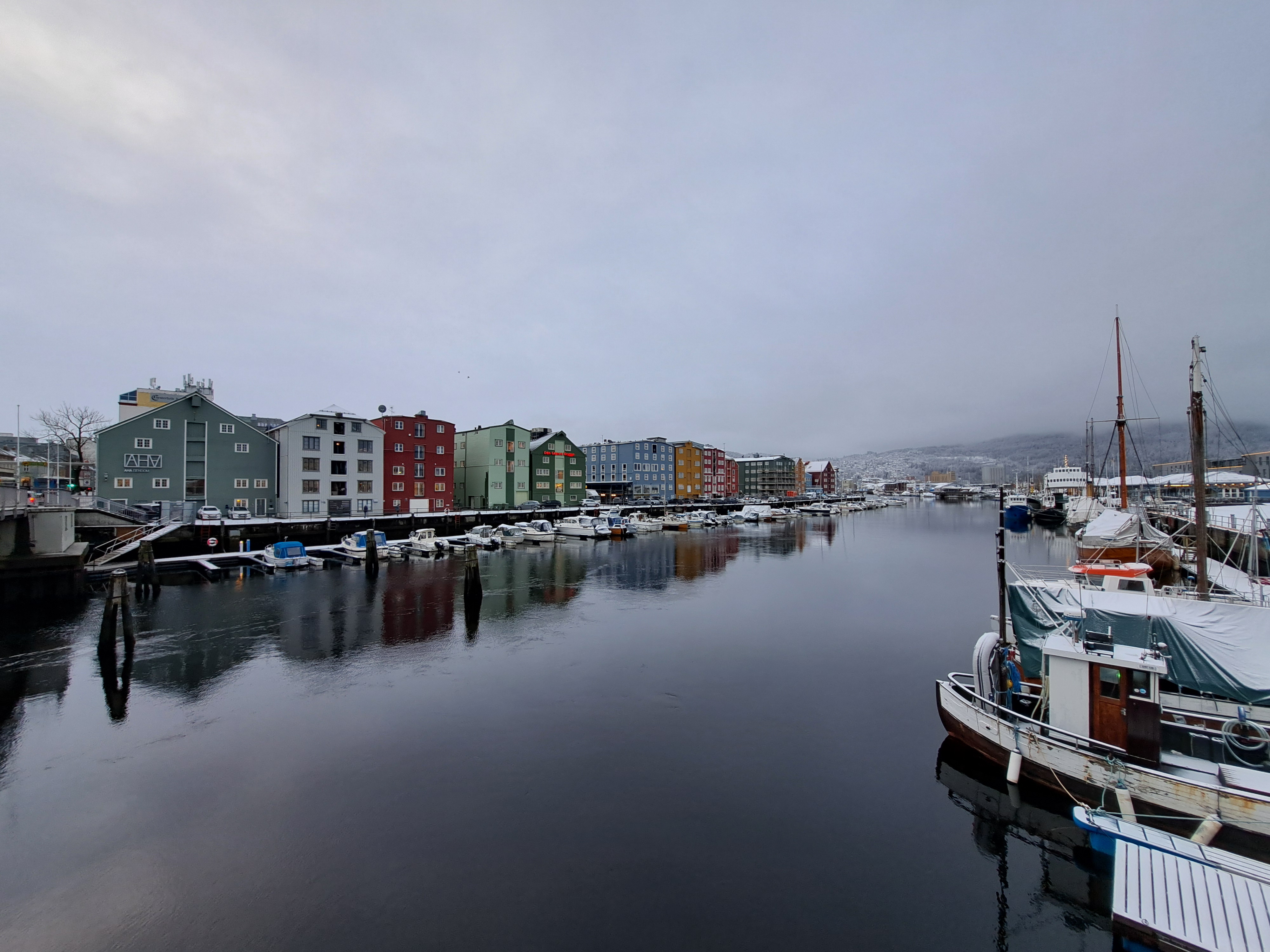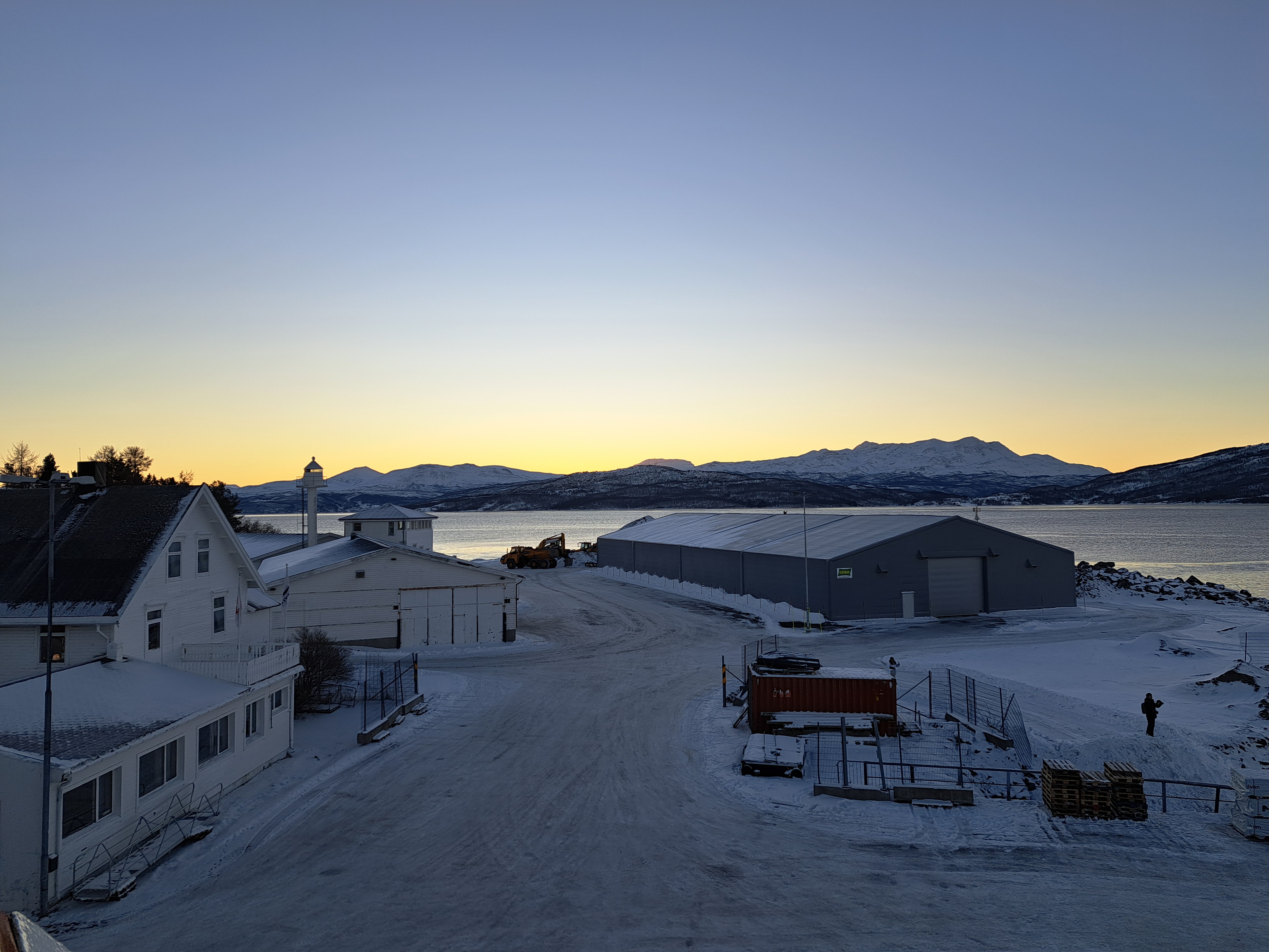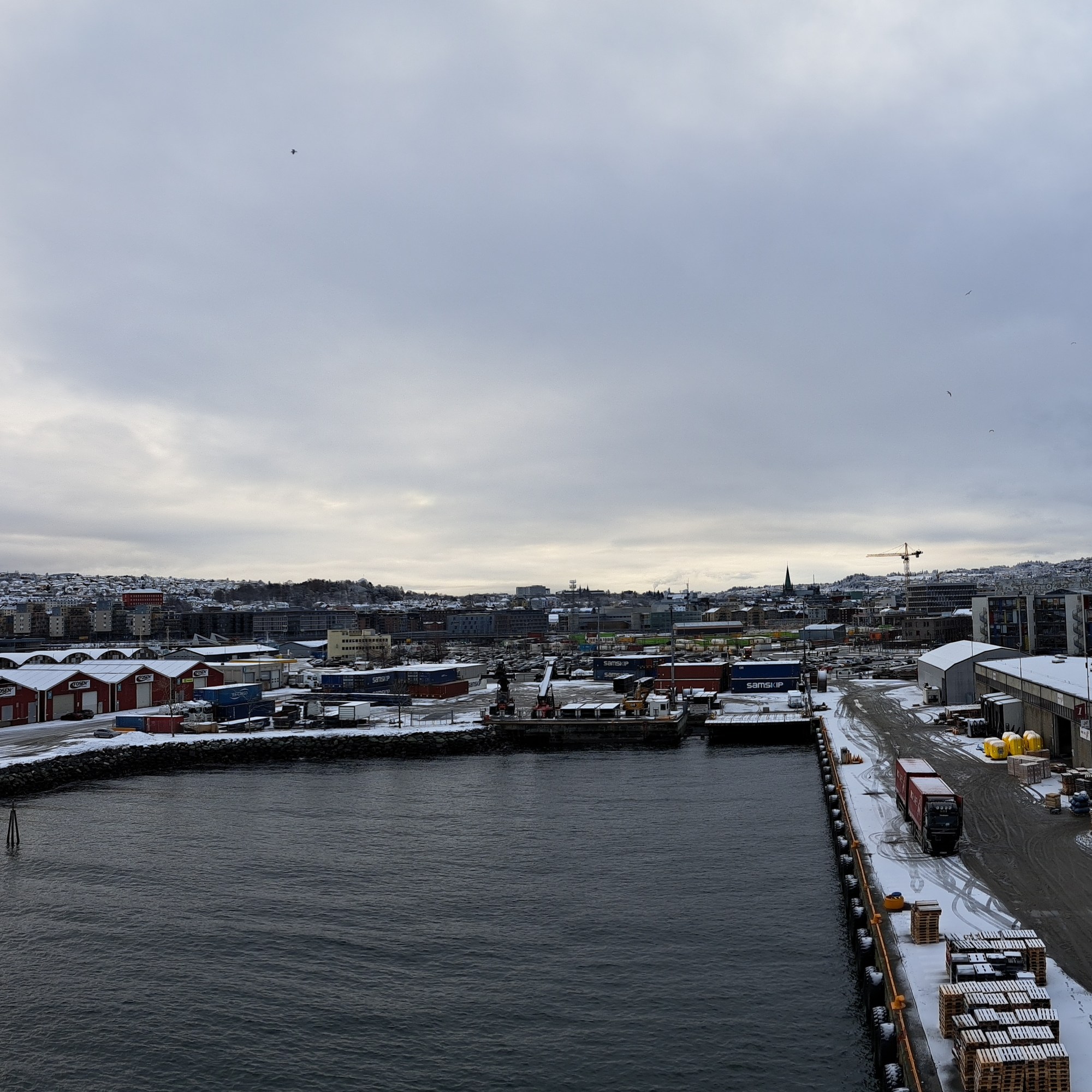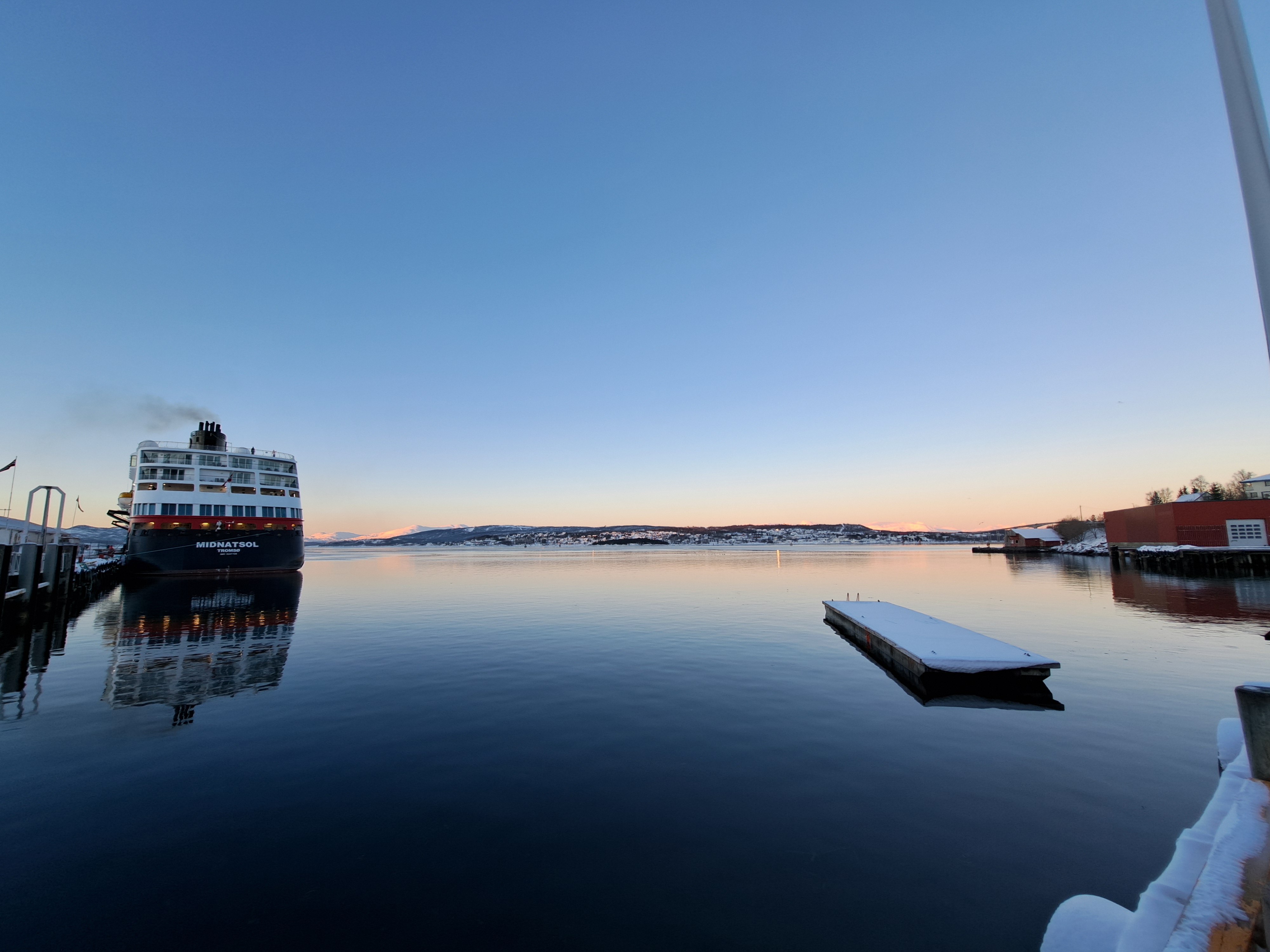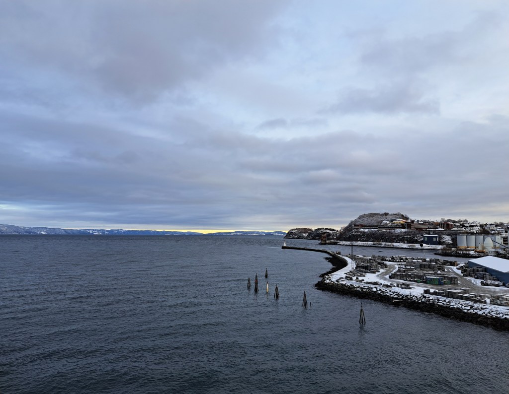 Pulling out of Trondheim shortly after noon back on January 22, and continuing our northward journey along Norway’s spectacular coastline. Had we done the journey a week earlier, I believe I’m right that when we woke up inside the arctic circle the following morning, the sun wouldn’t have nipped above the horizon at all for the rest of our journey. Glad we timed it as we did, for that and various other reasons such as storms and weather which meant our journey was both calmer and more northern-lights productive than the same boat’s journey had been going both up and back on its prior rotation :-).