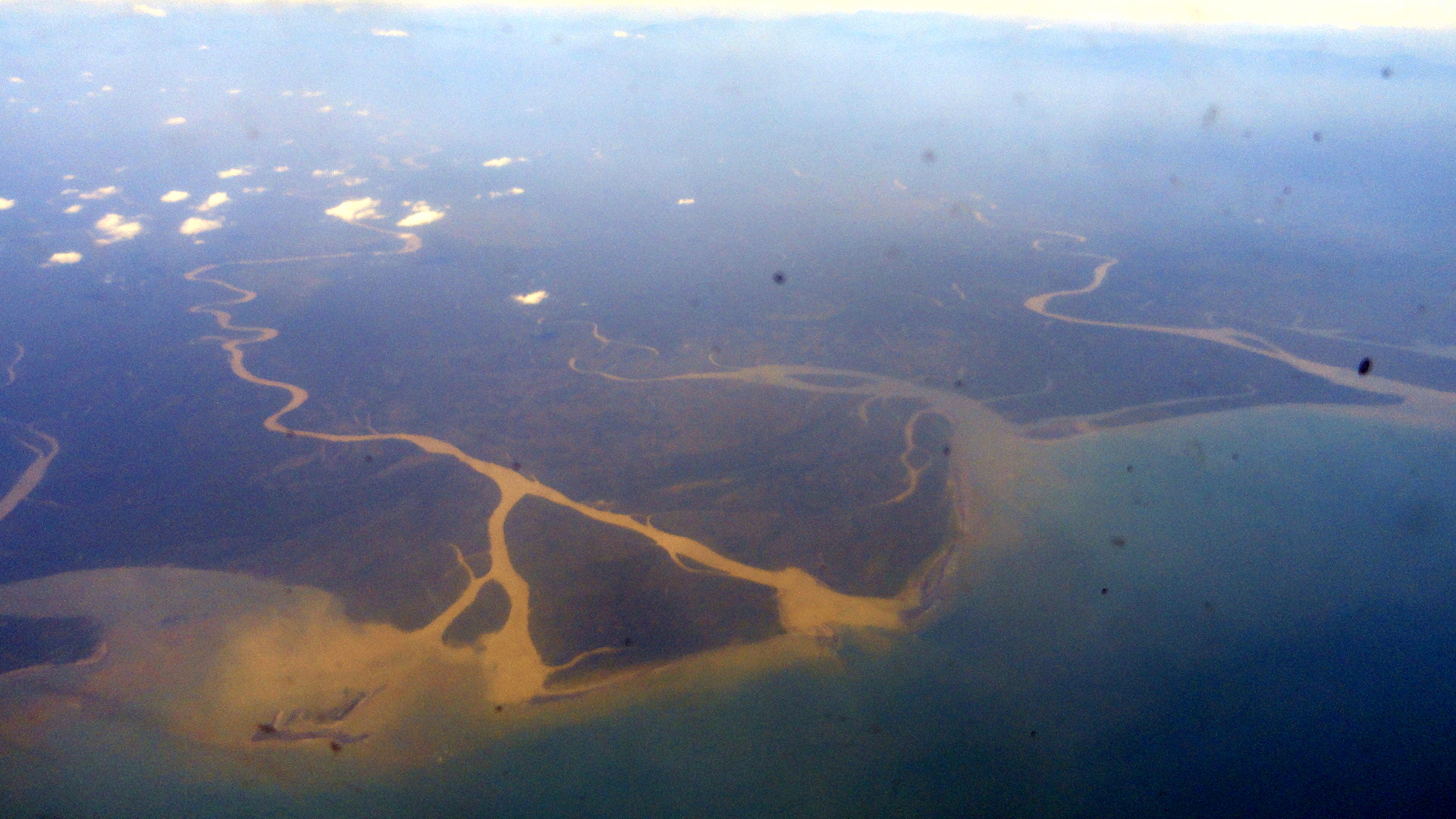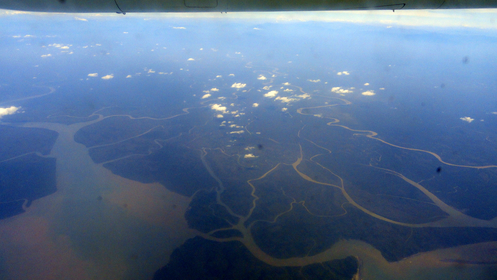 Thence, one turns right – sometimes offering excellent views of downtown POM if you’re seated on the right-hand side of the plane, though of late they’ve tended to cut directly over it which provides poor angles for good aerial shots (how rude, huh?…) – and heads along the coast of Central and Gulf Provinces until one cuts sharply inland to fly up into the Highlands and Tari Airstrip. Though Western Province — with the mighty Fly River — or East Sepik Province (with the mighty Sepik, previously showcased for you here: https://somuchworldsolittletime.wordpress.com/2012/08/06/along-the-sepik-river/) contain the estuaries of PNG’s mightiest and best-loved rivers, still I find the coastal estuaries of Central & Gulf fascinating to view from above. I find myself thinking about sedimentation, rising sea levels, the fertile highlands and all that soil slowly washing out to sea, and all the little fishies which I so loved viewing (you know the link…Neutrally Buoyant is what I called it…) being buried in waterborne mud.
