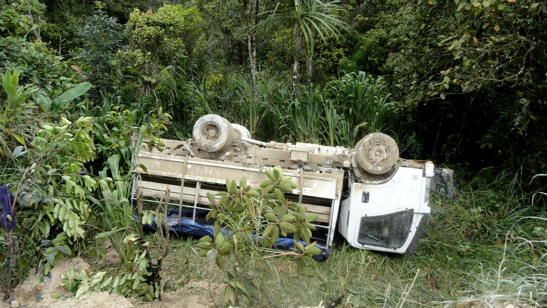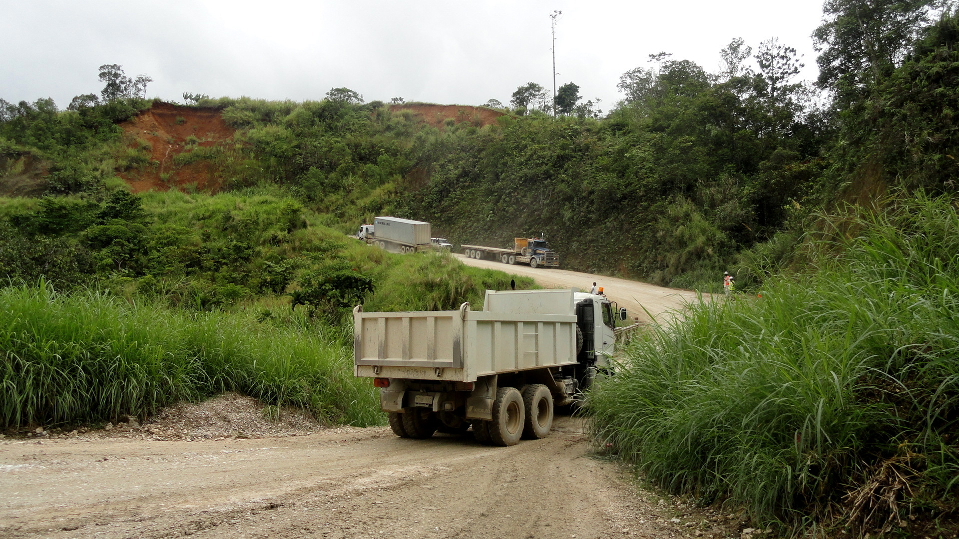 When you see the big trucks carrying ocean-going freight containers over the one-lane bridge across the river which you see directly below (that river shot was taken from the bridge while it was temporarily closed to clear some planks or reinforcement of some sort or other), or the truck that’s gone off the edge of the road and overturned itself, keep in mind that until about 30 years ago there was no road here. I’ve not researched when the highlands highway reached Komo, but I sense it was roughly 30 years ago. The LNG construction started…about 3.5 years ago.