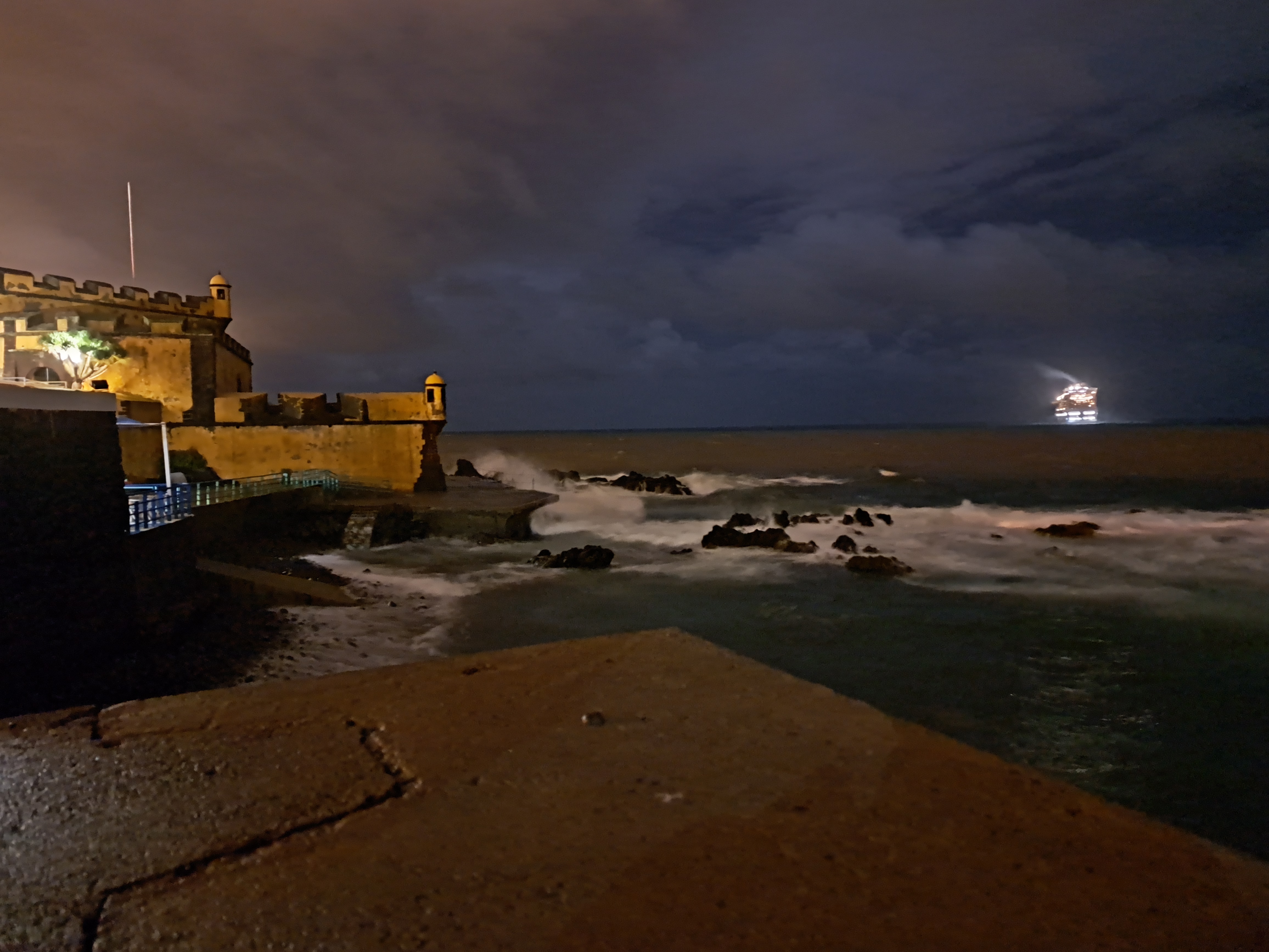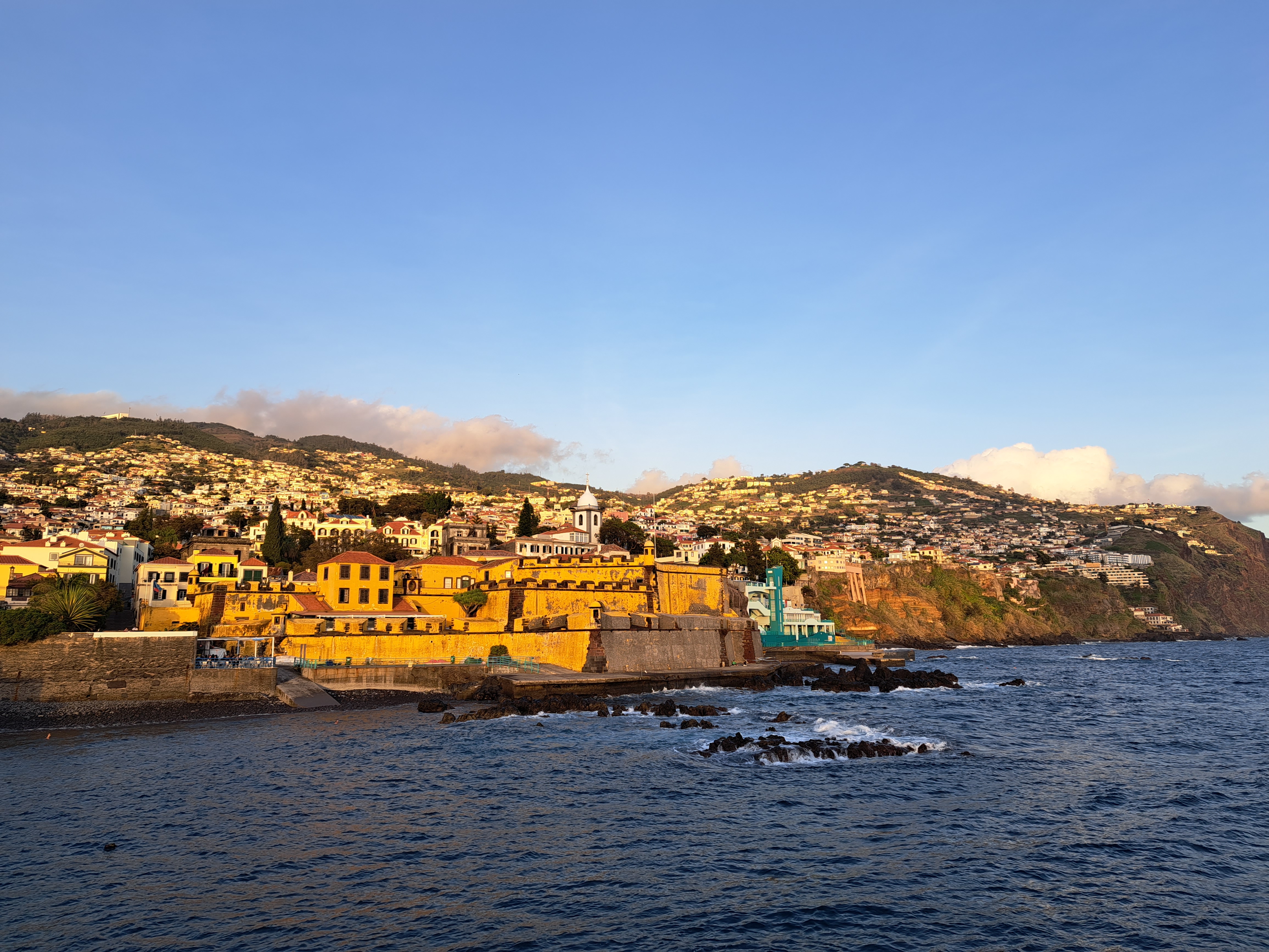 Sunset looking both at (above) and from (below) Funchal’s Forte de São Tiago, which I called “the older fort” in a prior post. The “newer” fort will feature in a future post.