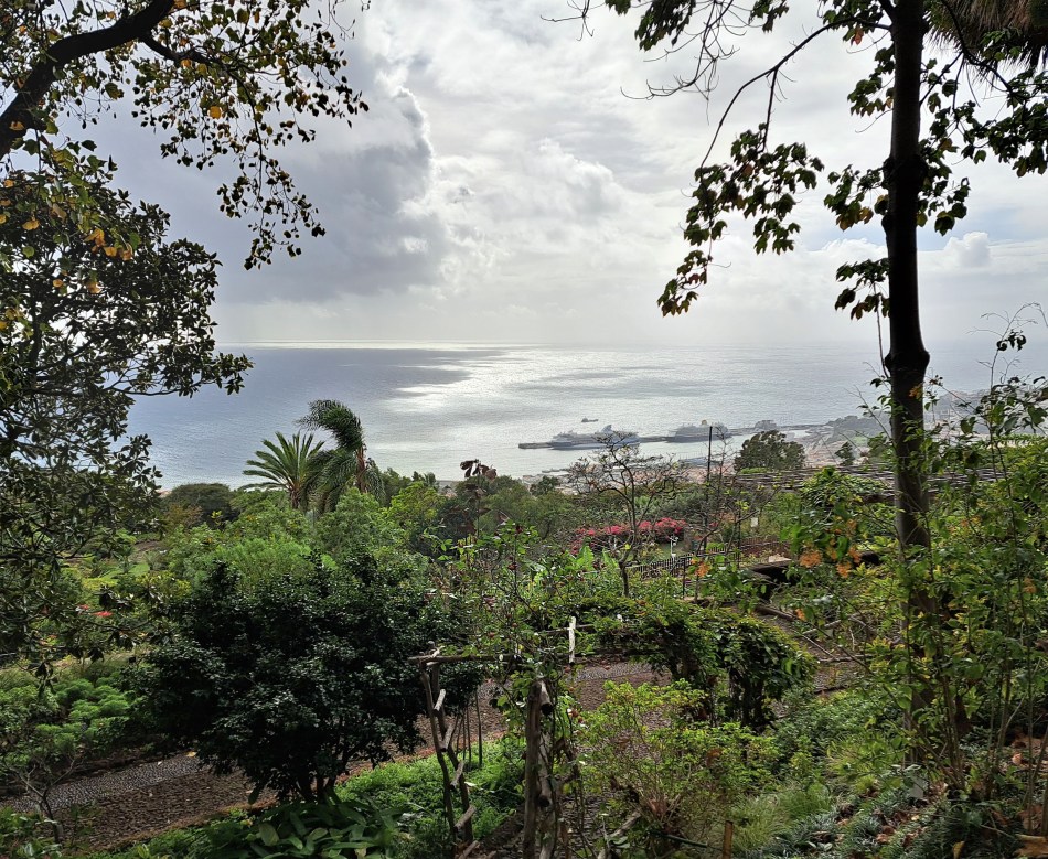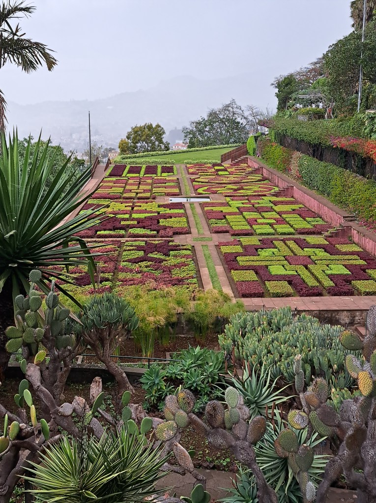 Above, the port of Funchal with several cruise ships visiting, as seen from the Jardim Botânico da Madeira, i.e. Botanic Garden of Madeira. Below, one of Madeira’s most-photographed sites and certainly the most-heavily visited part of the gardens. (The words on the far side, which you’ll see again below, are too fuzzy to read but I believe I recall that they say Jardim Botânico da Funchal. Below that, various photos demonstrating not only the lovely gardens themselves but also the remarkable views and impressive civil engineering of roads, tunnels, home and towns on Madeira.