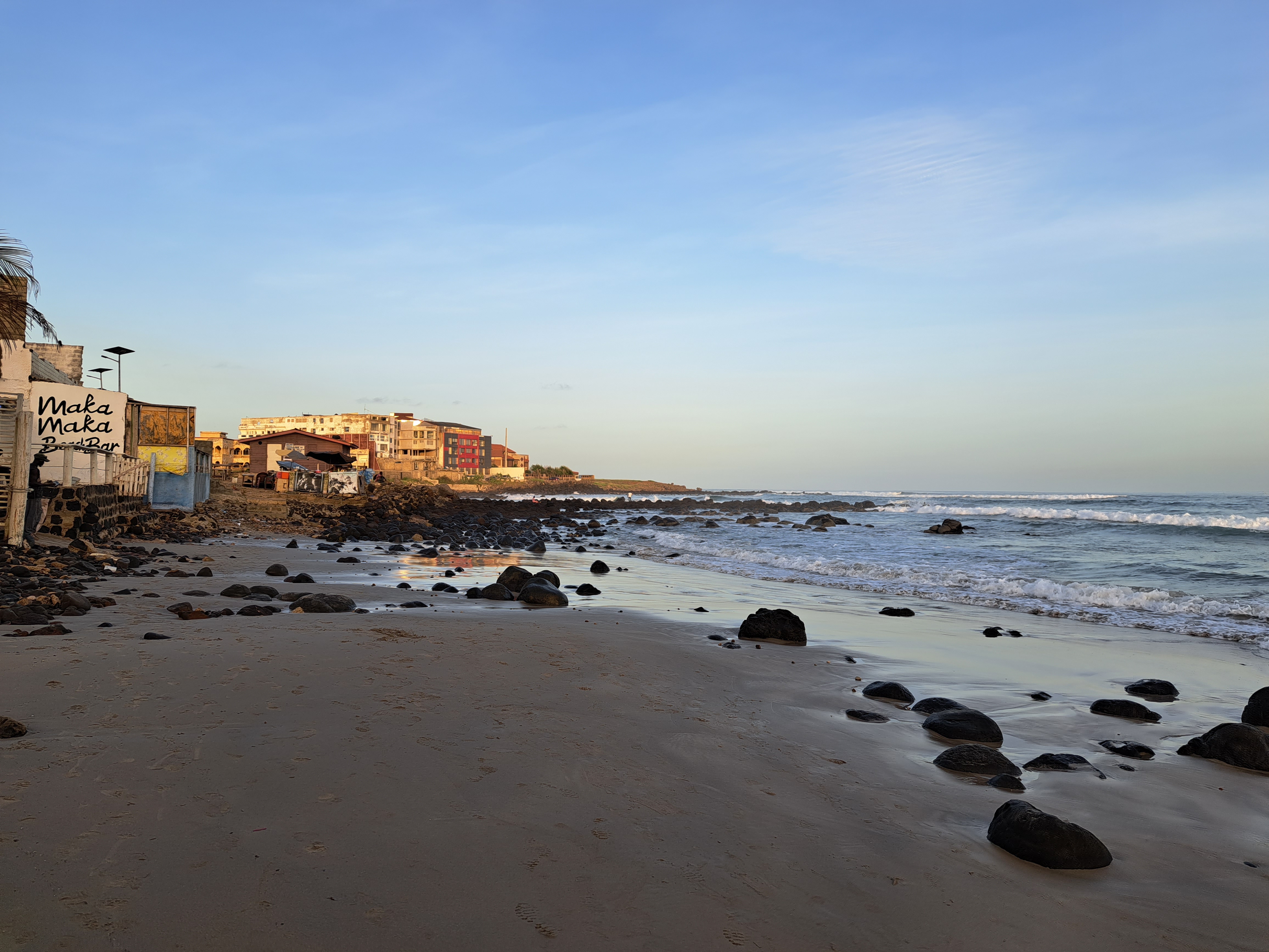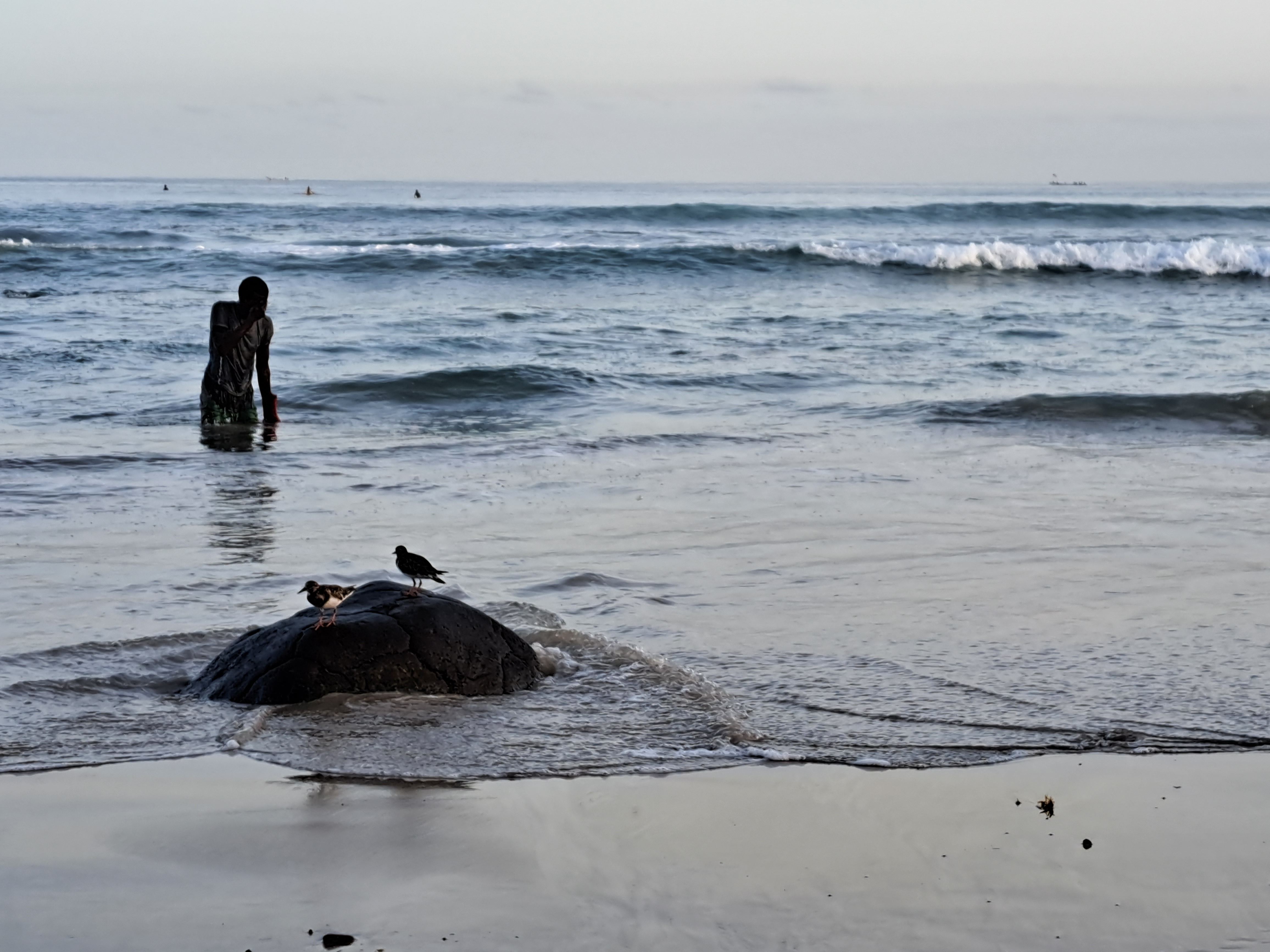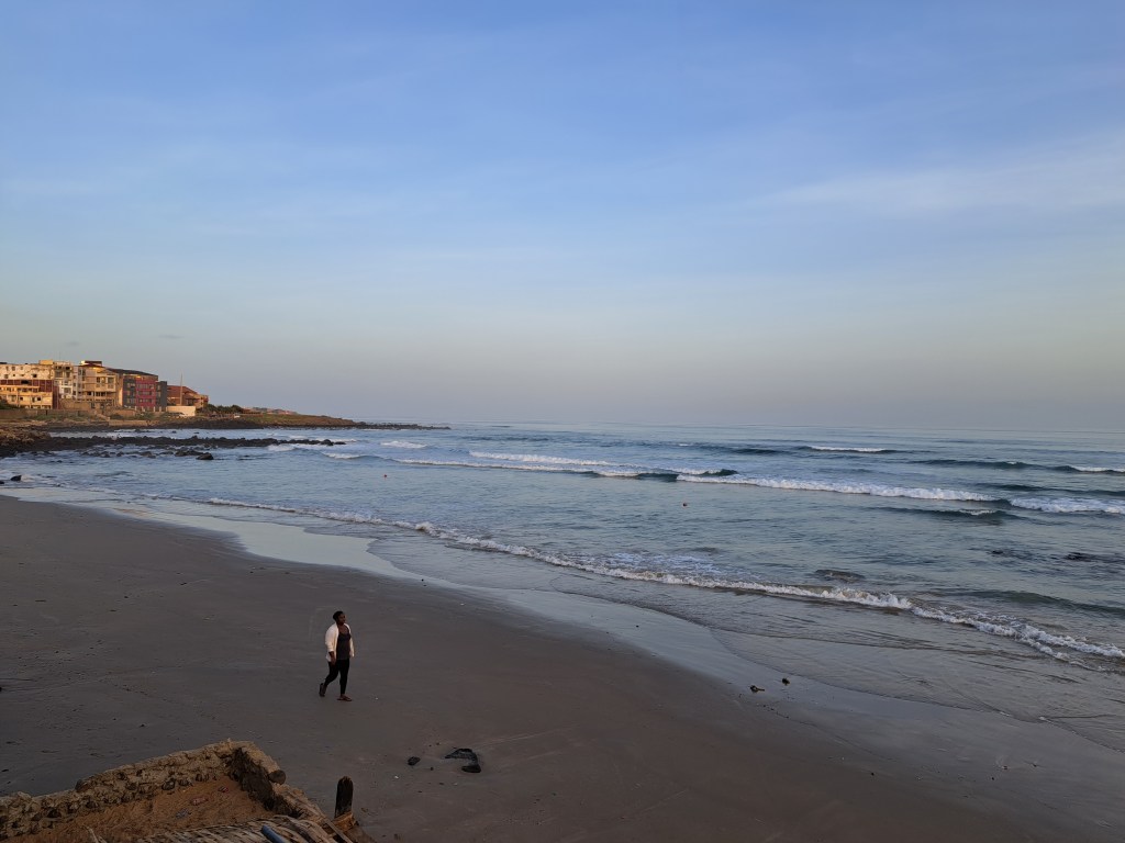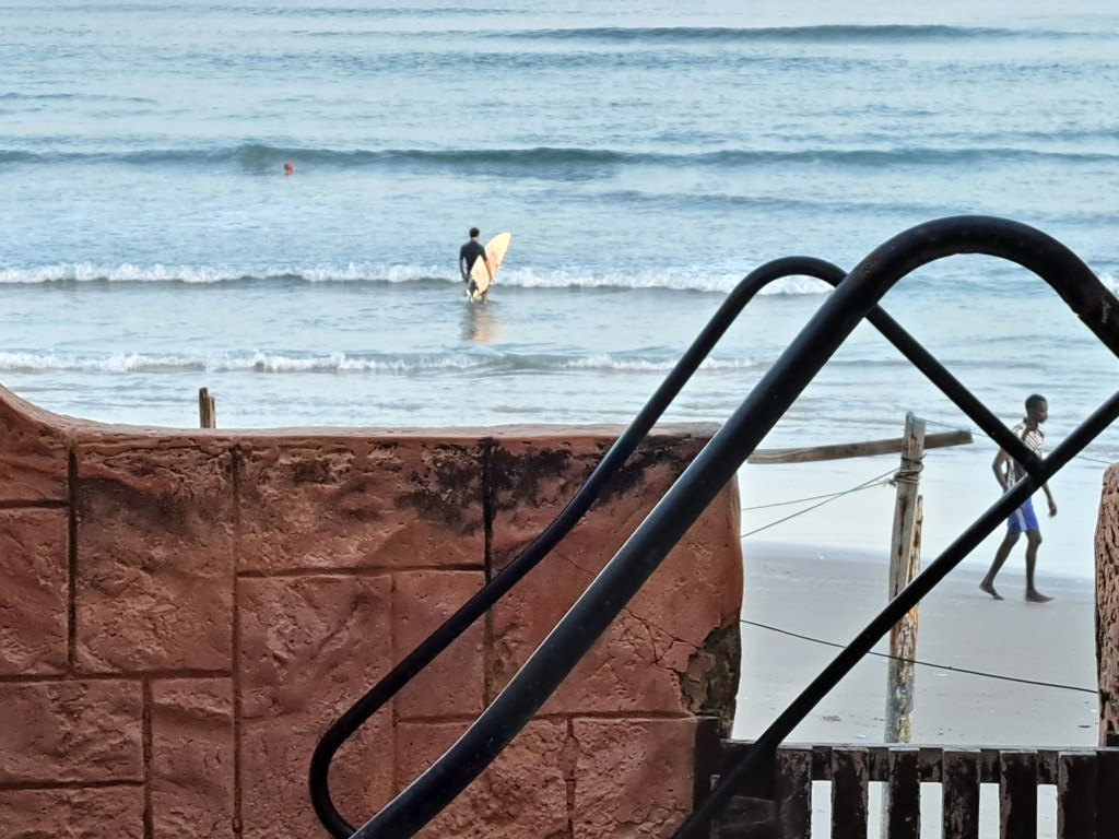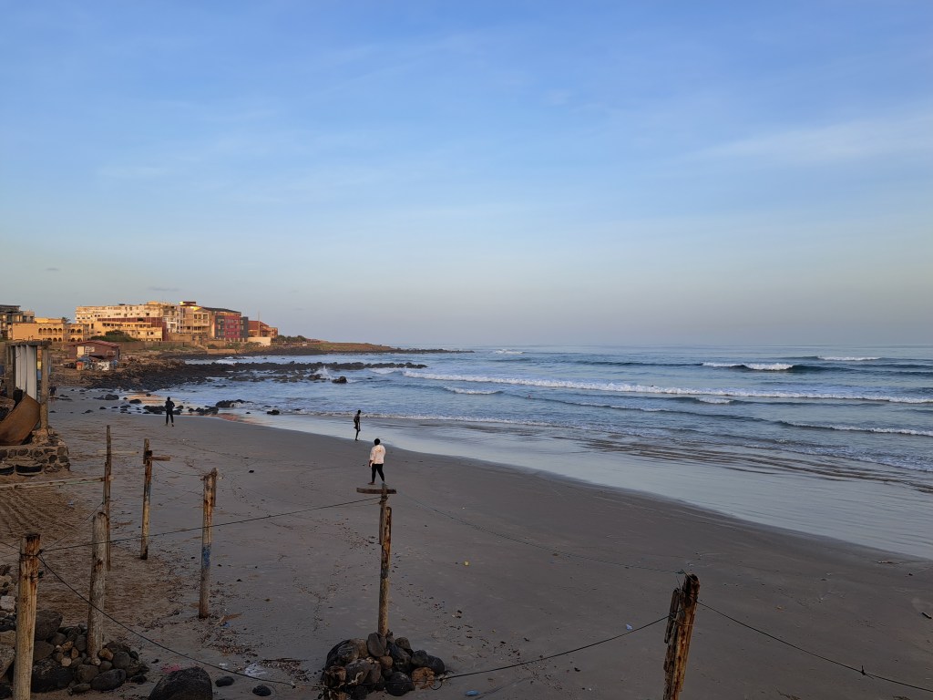 Like most ocean beaches I’ve ever visited, Dakar’s also exhibited early-morning shorebirds seeking food, and early-morning strollers enjoying the waves. But Dakar also featured a remarkably vibrant surfing scene, which I greatly enjoyed watching.