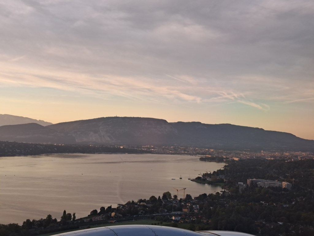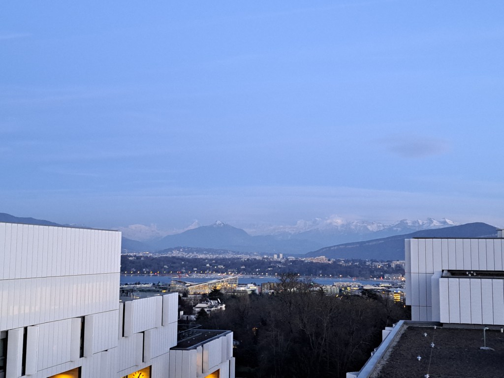 Our last post was my first view of the alps, looking west-southwest as our plane started to line up along the French-Swiss border for its final dawn approach to land in Geneva. Thanks to an ungodly-early departure from my home on Thursday (after a late return from a delightful bassoon recital with Sam the prior evening), we arrived in viewing proximity to this magnificence at just the right time to enjoy that pre-sunrise glow without having to deal with the glare of el sol shining directly into the phone’s lens. These were taken the following day after a meeting downtown, when I got to see Mt. Blanc rising behind the city – last month when I was there the clouds were too to experience this, though friends told me it happened often. Wow.
