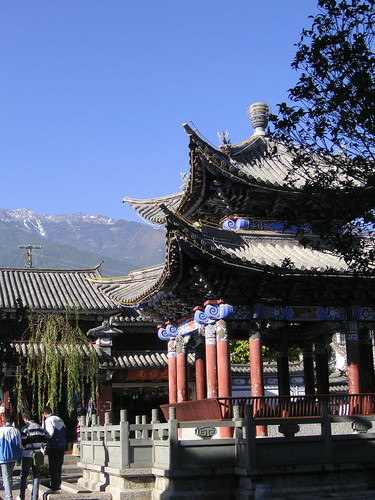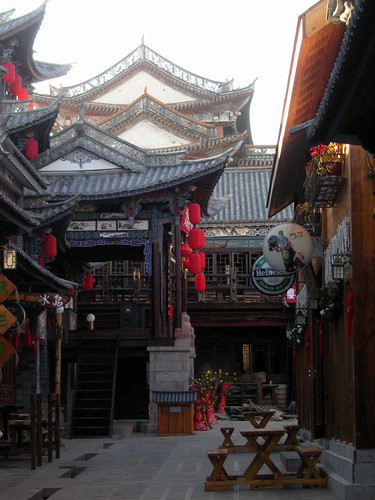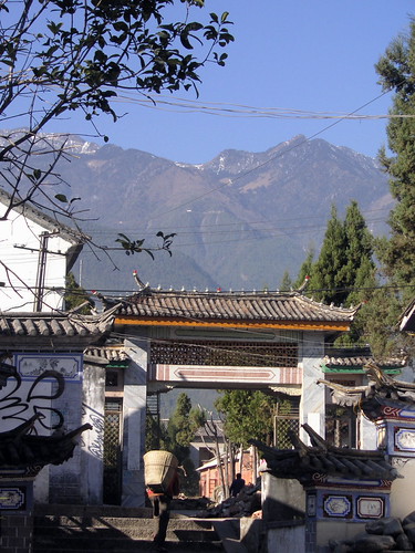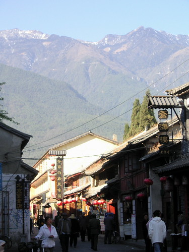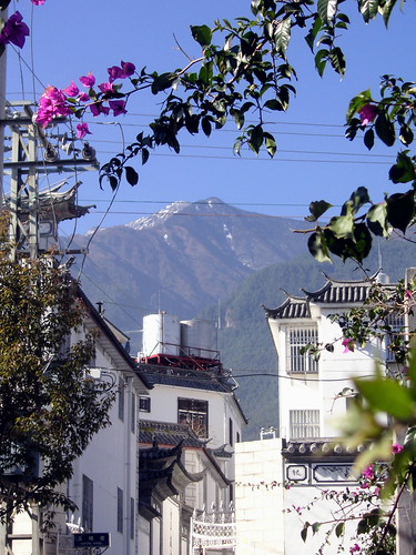 showing, it gives a sense both of how touristy and how lovely old town Dali is. It’s easy to criticize Dali as highly touristed…yet, when you come to think of it, it’s often true that places are touristed because they’re very appealing. The beer sign here tells you a bit about the crowd that’s being appealed to, but at the same time isn’t the architecture lovely? And when you pair it with the backdrop scenery and all the lovely angles and views I’m showing in the next several shots, you can see how Dali’s become so popular. If you then add how dirty and dusty so very many cities in China are…and ill- maintained…you can see how for an expat living here, it’s rather nice to be in a place that demonstrates the kind of civic pride shown by the lovely architecture, clean street, flower beds and so on!