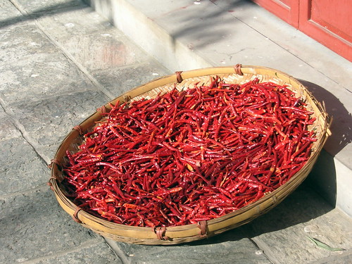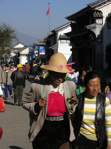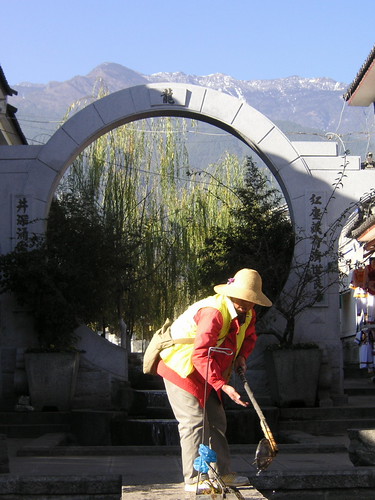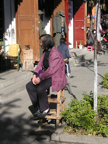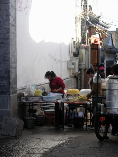 I thought I’d end the Dali set with a few shots I took of the people of Dali. When we first arrived in town, we drove past a Bai minority funeral procession, which was an interesting and unusual way to be greeted in town. This shot shows a woman cleaning one of the many canals that run through the old town. In the next shots you’ll see some vegetable vendors (note the green showing from the baskets they’re wearing on their backs), some women preparing noodles and other street food, a woman walking up the steps with a work basket on her back (you have to look hard since I never got a good closeup of one of these: they are used throughout southern China to carry everything from chickens going to market, to produce coming back from the market, to probably clothing or electronics equipment for all I know), and an older woman sitting on a stool in one of the shopping parts of town: I