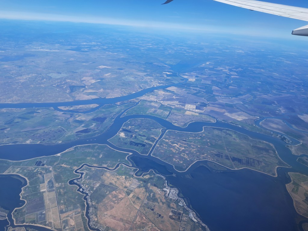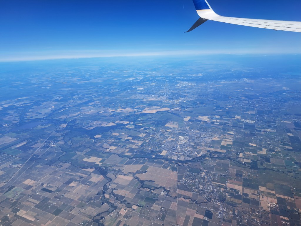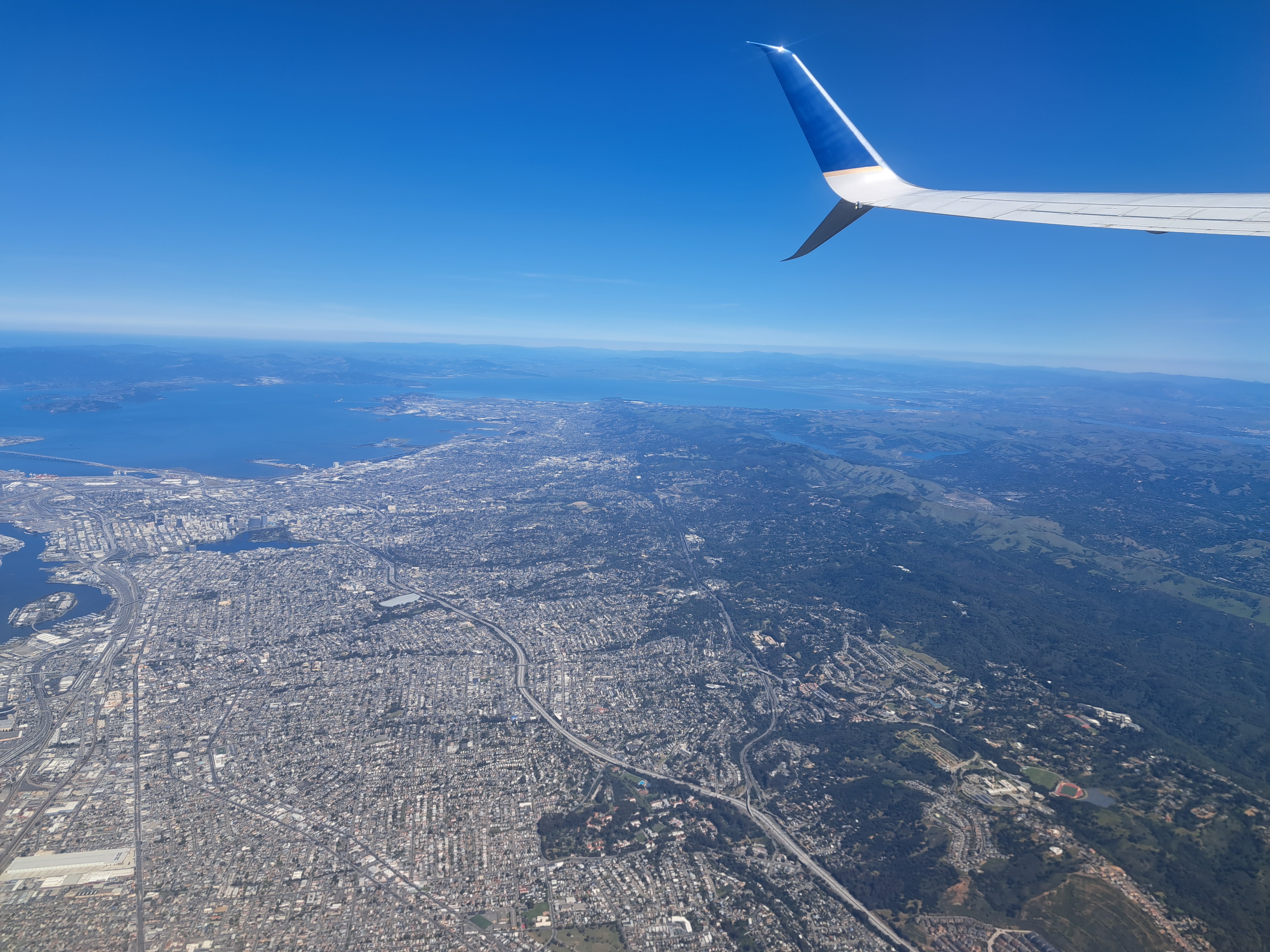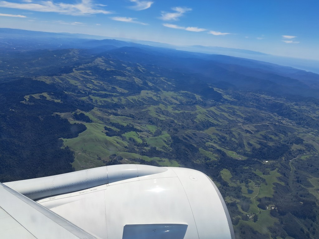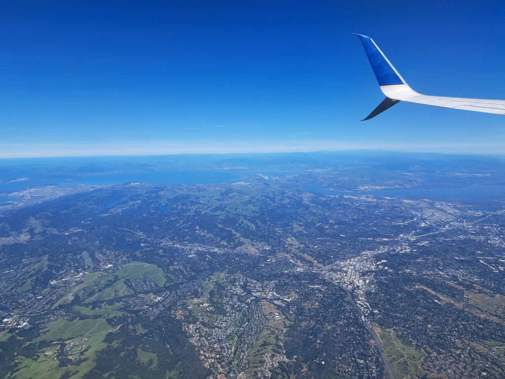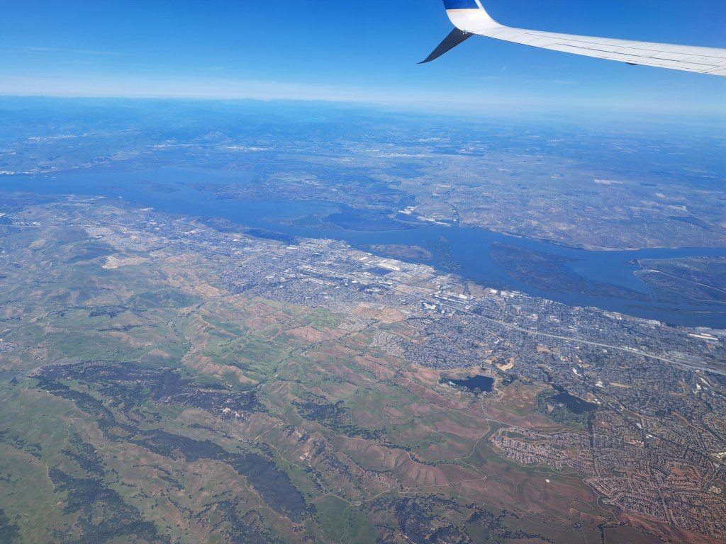 If look closely at the above photo, you’ll see a bay coming in from the Pacific at the top right, carving inland to the top-center. That’s Monterey Bay. I’m posting all the remaining photos from our mid-April approach to SFO, following the flight from Amsterdam which, as we’ve shown you in prior posts, cut over the norther half of Greenland before plunging south along the Pacific Coast. This photo was taken in the midst of our complex circling in order to line up for (north-facing) approach to SFO. If you’re interested in better understanding the geography, just open a map and see how the “peninsula” sits between the (more enclosed) SF bay and the open, further south Monterey Bay. Here we’re beginning a clockwise circle from our southbound course, so I’m looking south and we’re still turning west and north. The shots below follow the rest of that trajectory in order, although the first shot was taken a minute or so before the one above. Enjoy 🙂