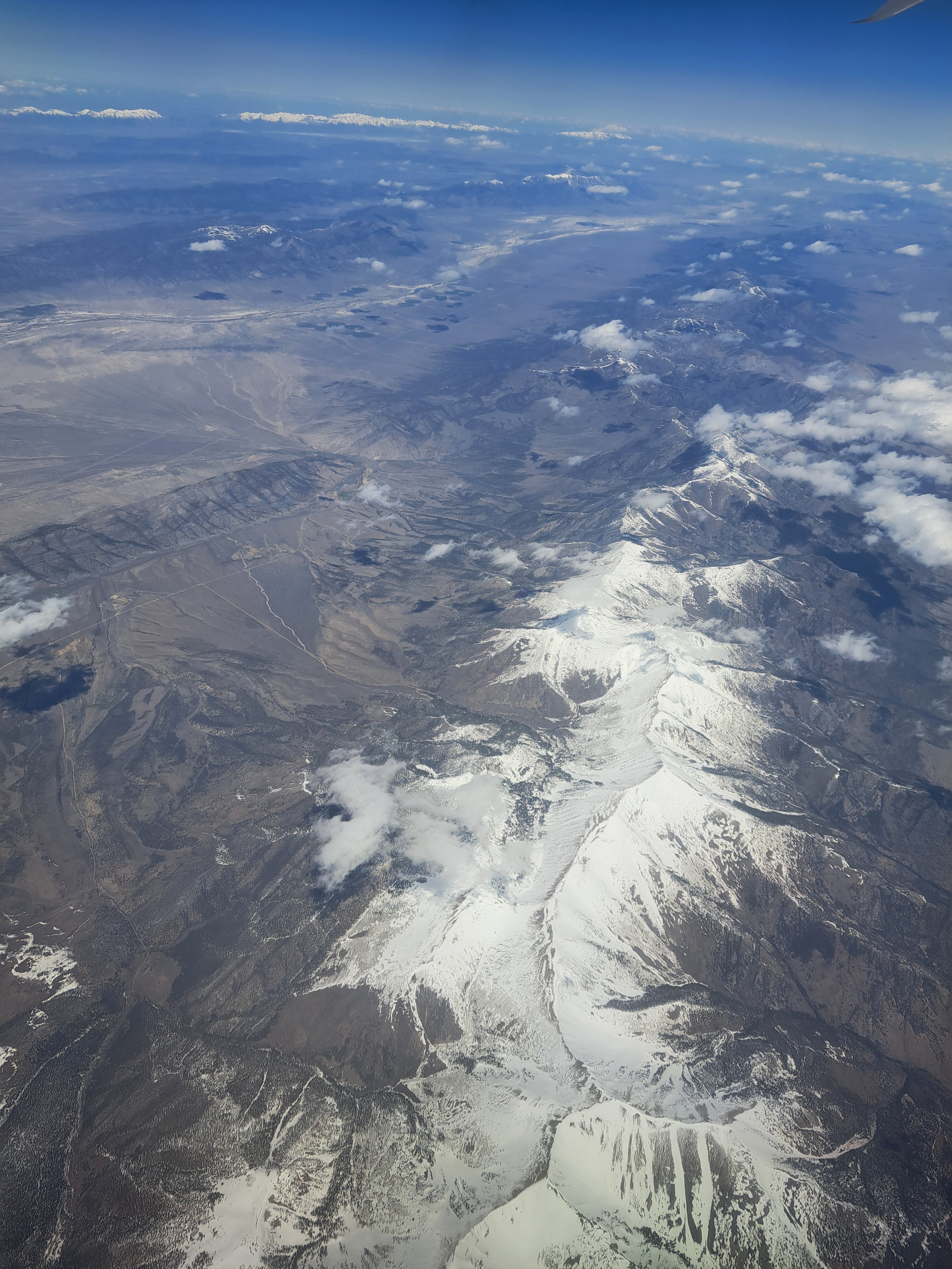 If there’s snow on them in the desert in May, then they’re mountains. 🙂 Probably Utah, but maybe Nevada, still from that SF->Pittsburgh flight in May. Hoping for clear skies en route home to see interesting mountain views (such as this) along the way during my daytime return flights, or we’ll have to let this series go dormant ’til whenever I next get close enough to photograph something I can call a mountain…
