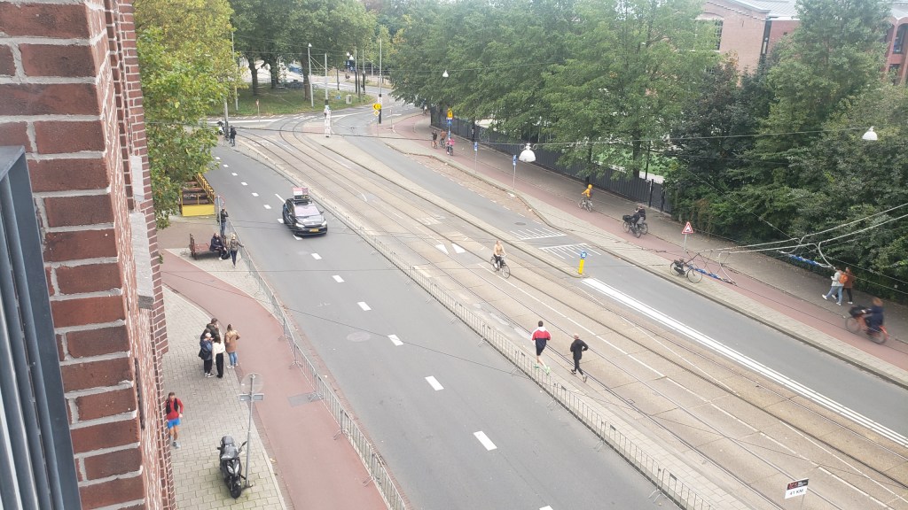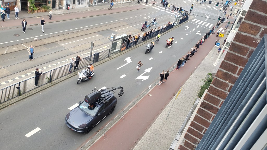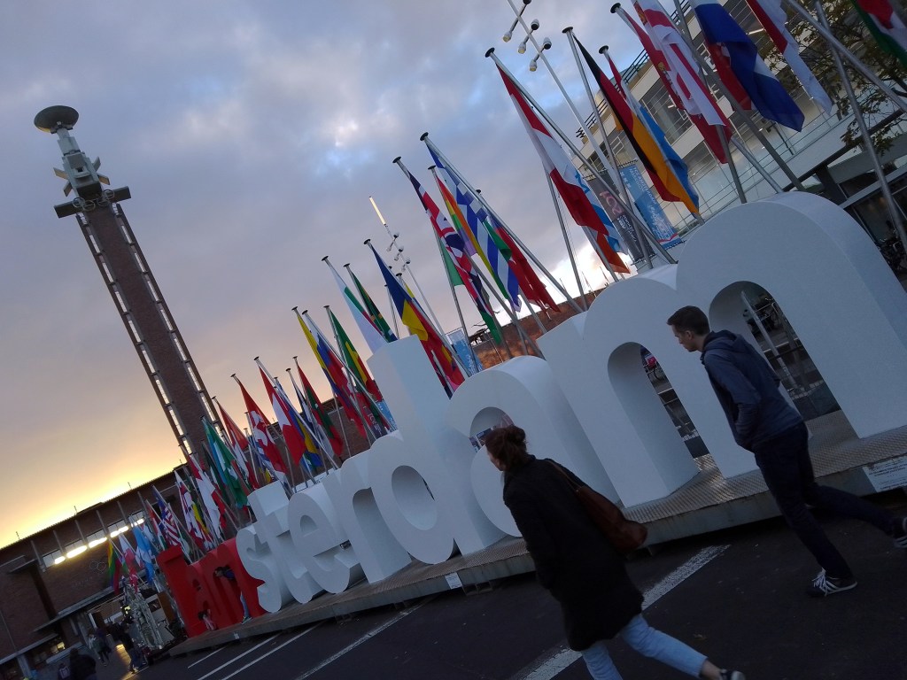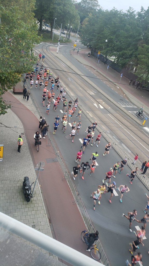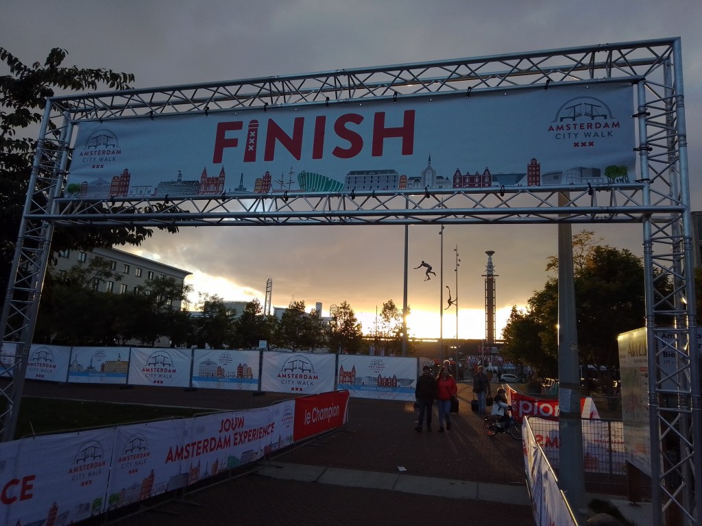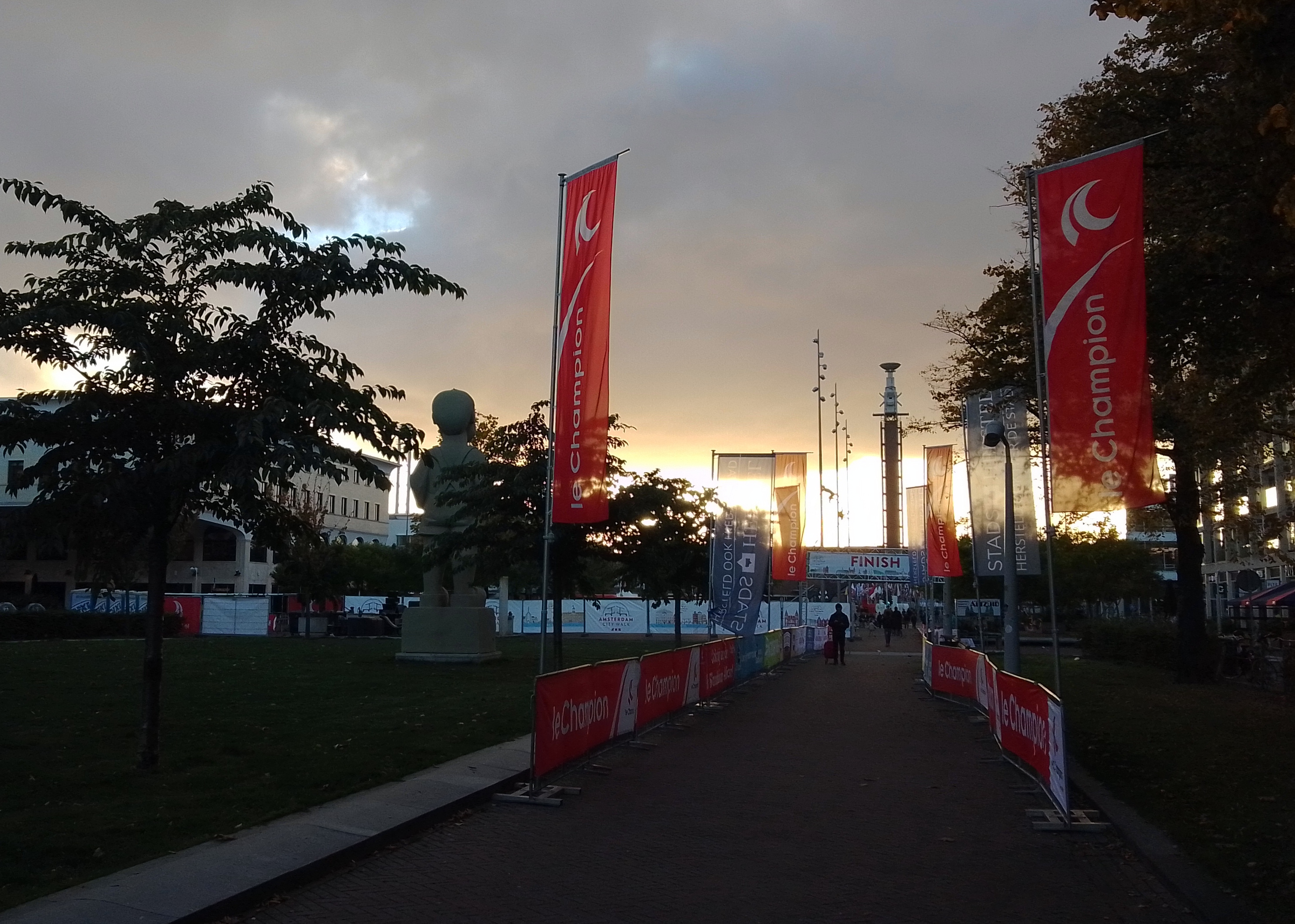 Yesterday (Sunday the 17th) the Amsterdam Marathon was run. It’s also got an 8km walk, and a half-marathon. All the races started and ended at the Olympic Stadium, which I’ve shown you from various angles since I moved here in July, pretty much. It’s a 10-minute walk from my home, and all the races ran right past my building…as you see 🙂 I took some of these on Friday evening when the sun came out at the end of my work-from-home day and I decided a walk was in order, only to find all these new temporary things in my neighborhood. On Saturday there was both a City Walk, some kind of organized group walk thing (sponsor of the signs you see below), and some great park art in ArtZuid (ArtSouth), here in the southern district of Amsterdam where I now reside. All lovely, and yes – more photos for the future!