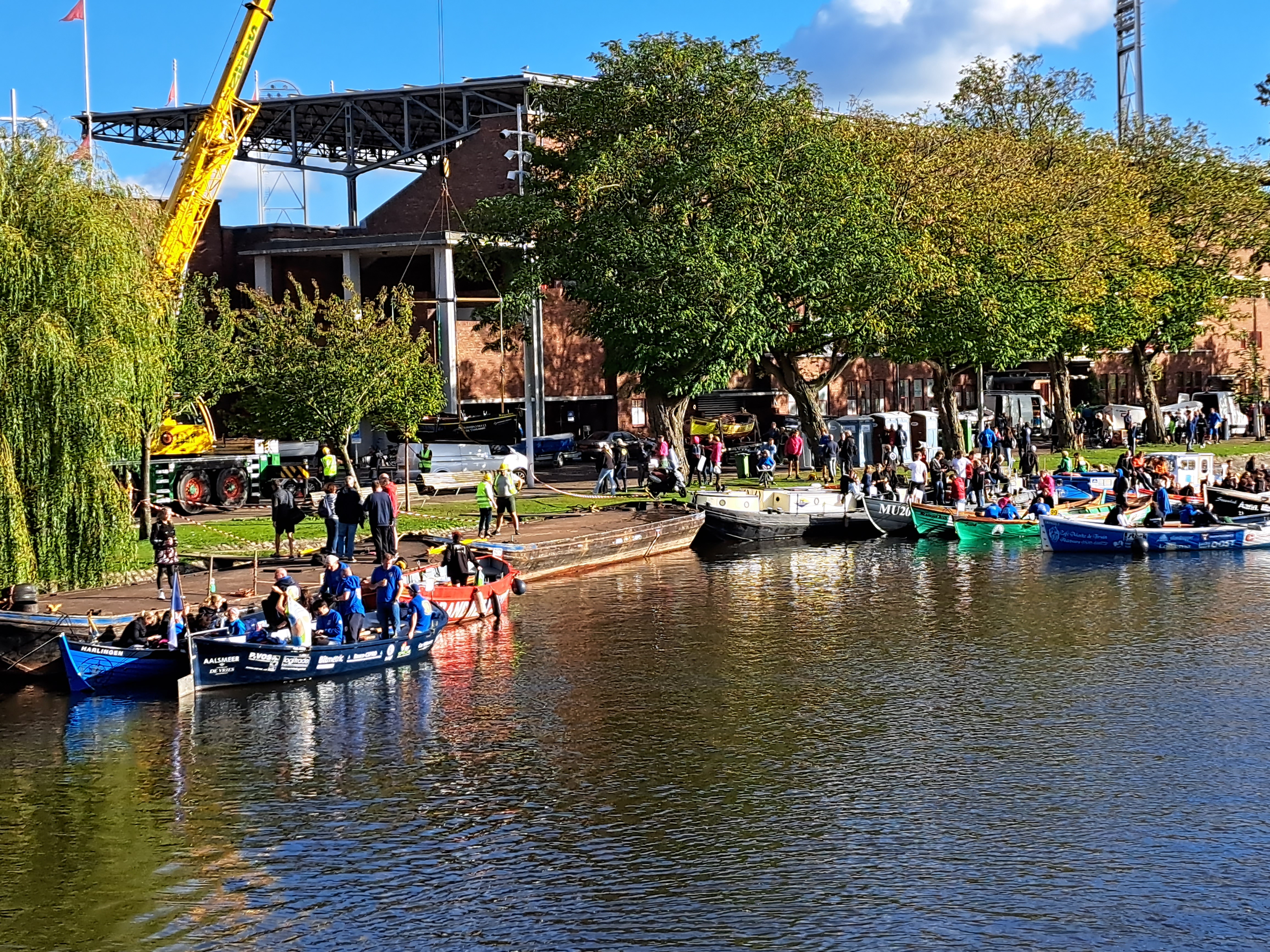 So this was obviously some kind of competition, festival or both which I biked past on my way home from a glorious team-tennis Saturday recently. Tap or click on the image below & then enlarge it, and you’ll see a boat being lifted out of the water by a crane. I guess many of these boats were carried in by road rather than coming under their own power along canals from farther away 🙂