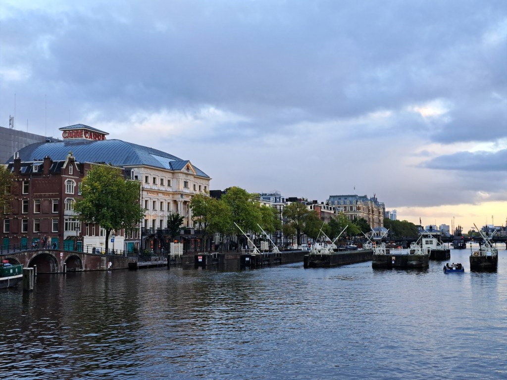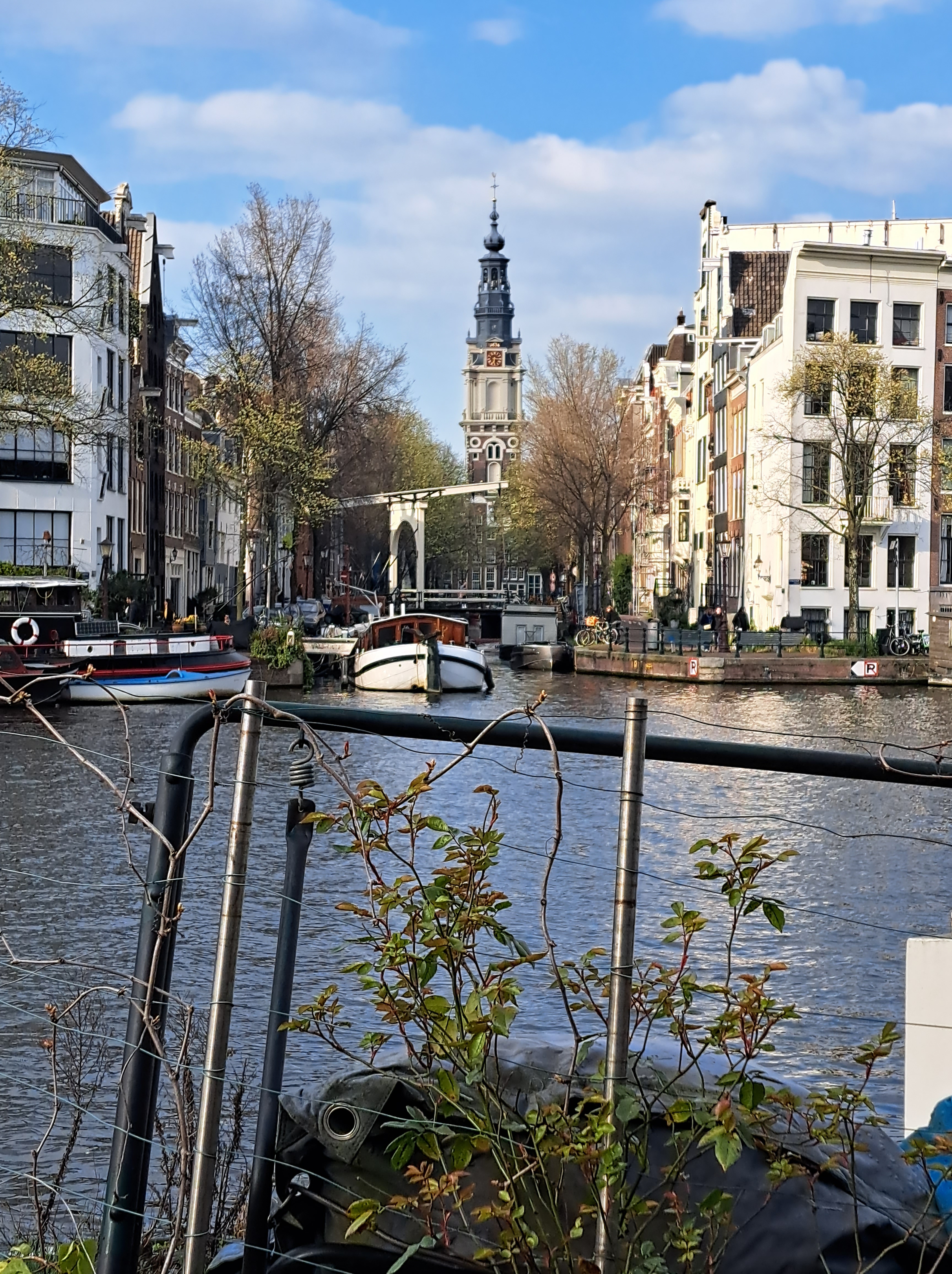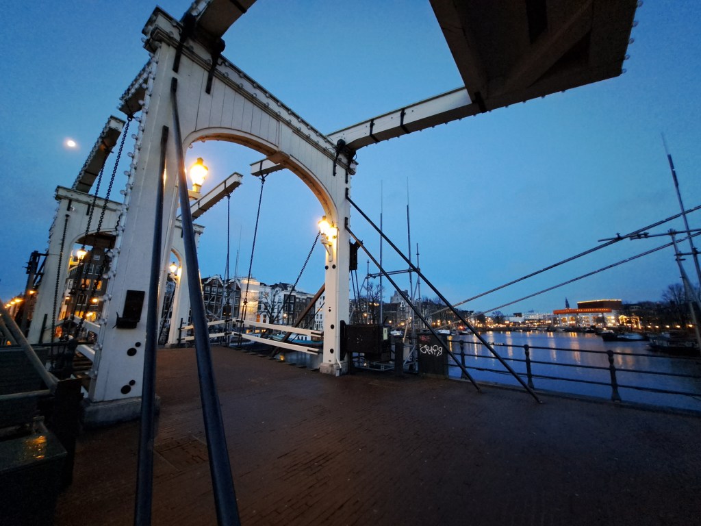 A brief stop on the magere brug (thin bridge) over the Amstel, on an extremely rare clear morning bike ride to work last week. We’re looking north along the Amstel towards the building which houses the National Ballet & Opera, plus city hall for A’dam, with the moon setting off the the west.